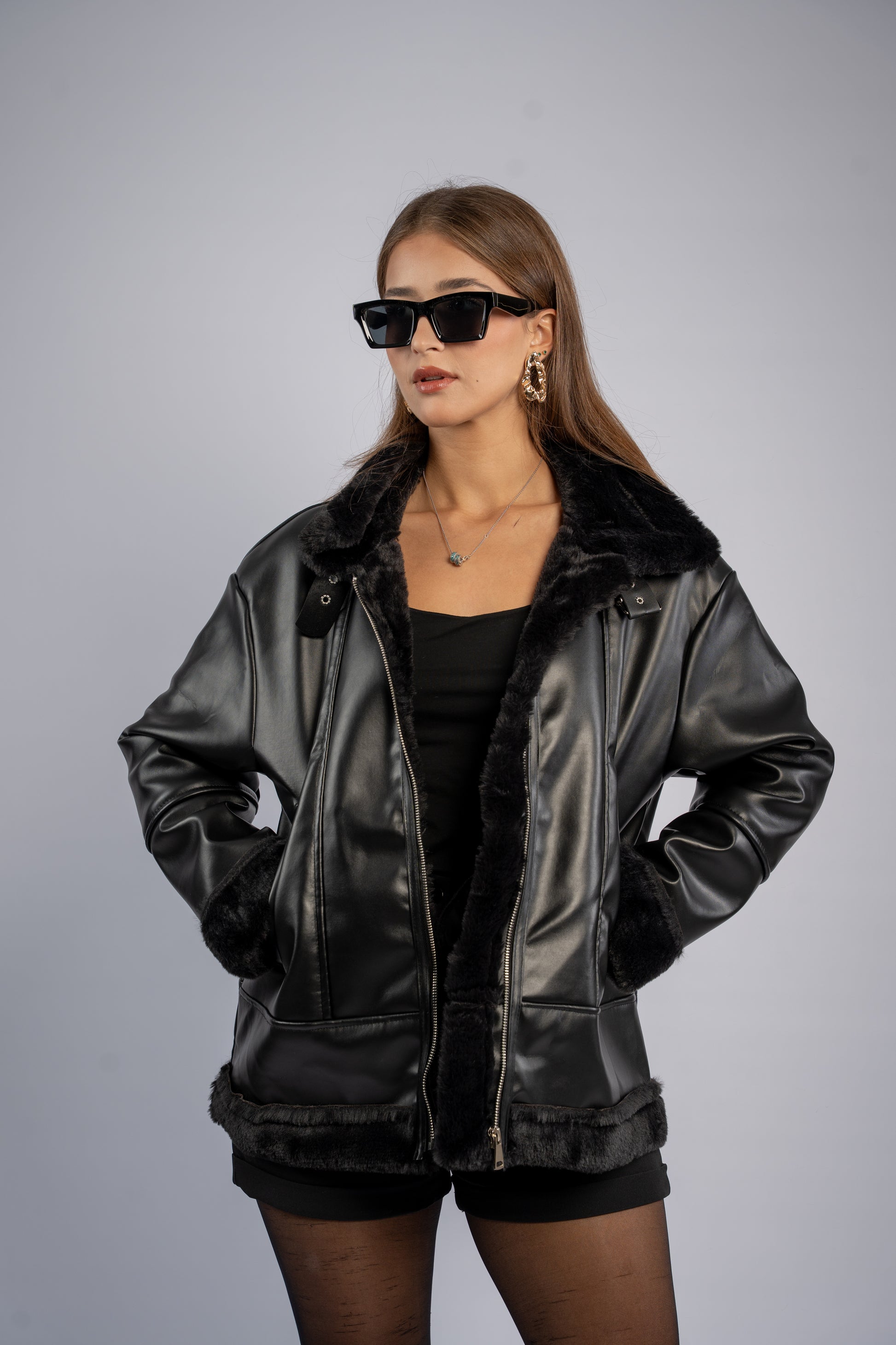 Faux-leather jacket with a smooth exterior and warm shearling lining. Features fur detailing inside for extra warmth and a structured black silhouette.
