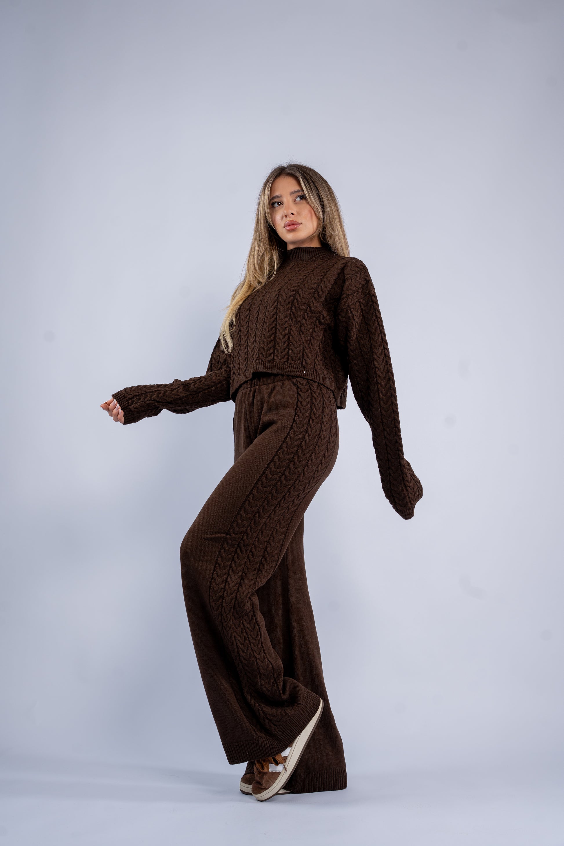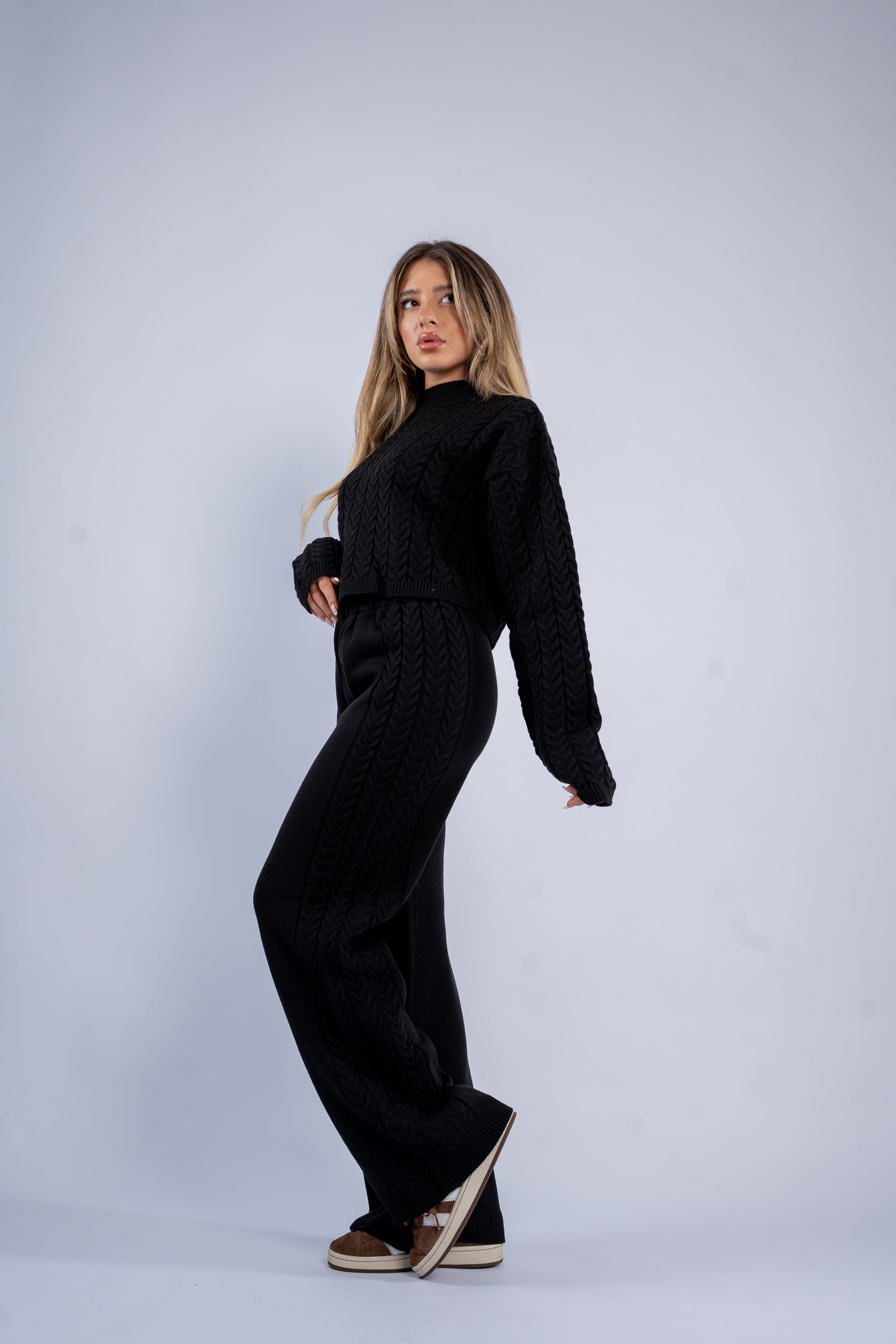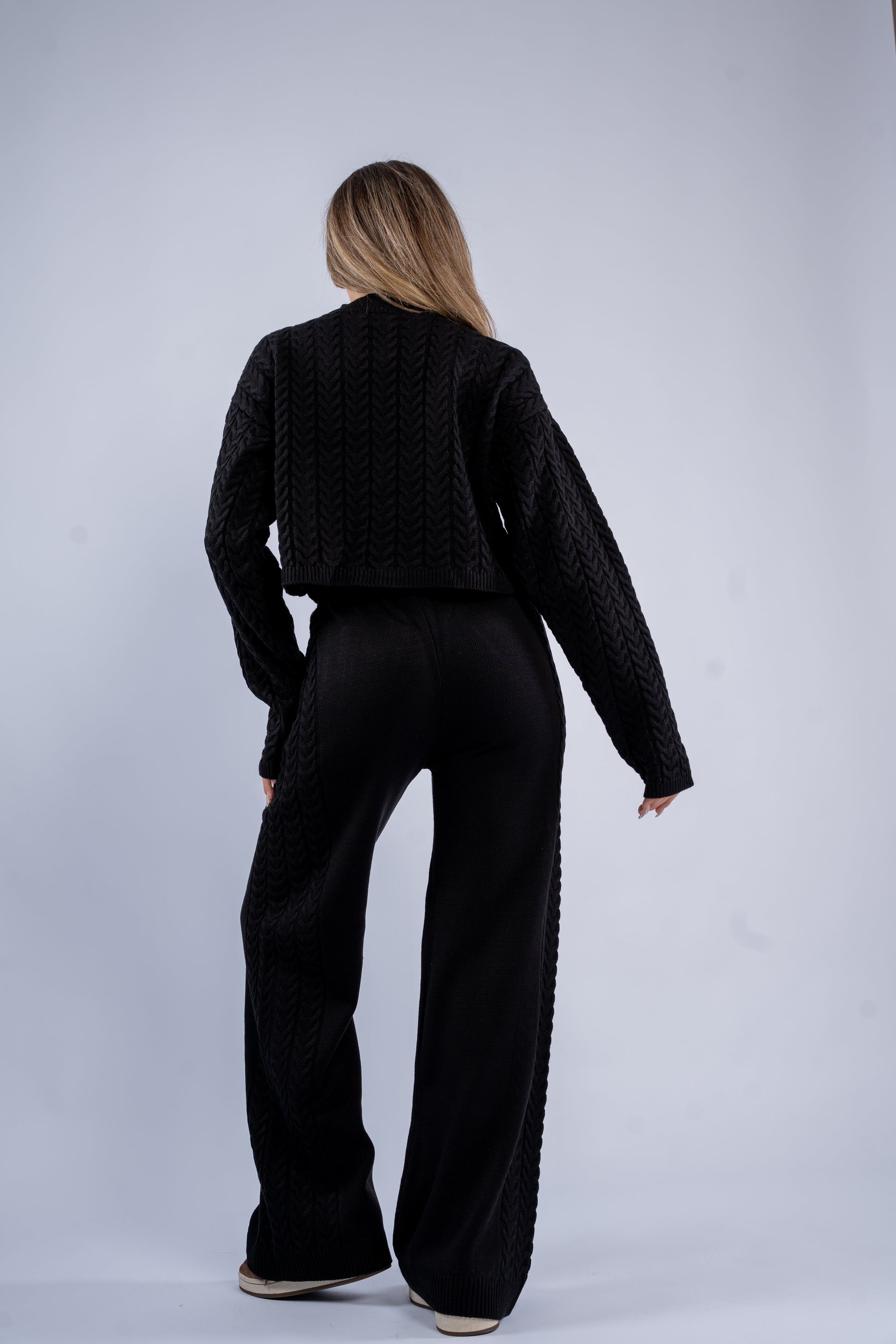 Knitted set featuring braided detailing on the top and along the sides of the pants. Soft, stretchy, and comfortable with a textured, coordinated look.