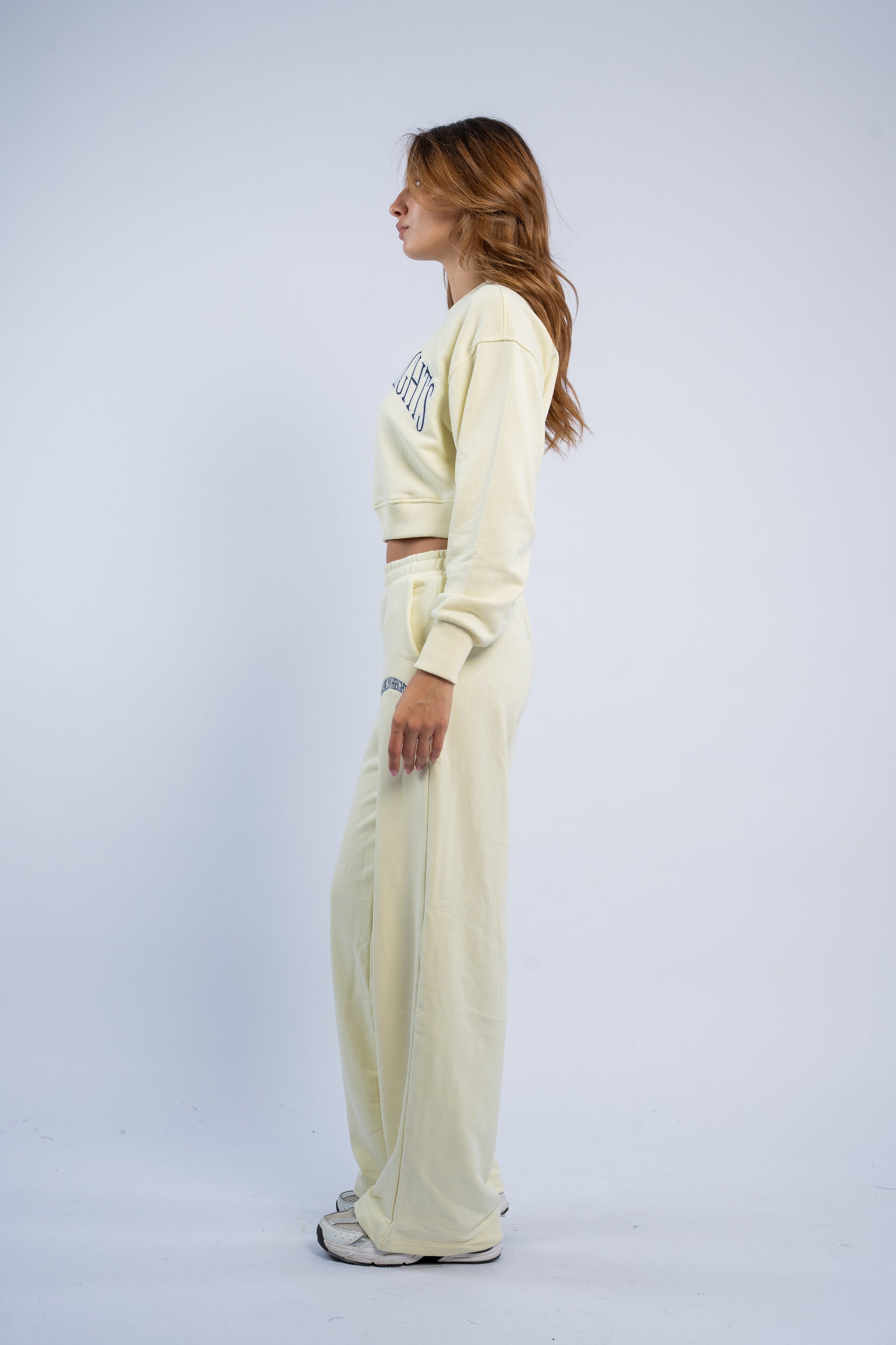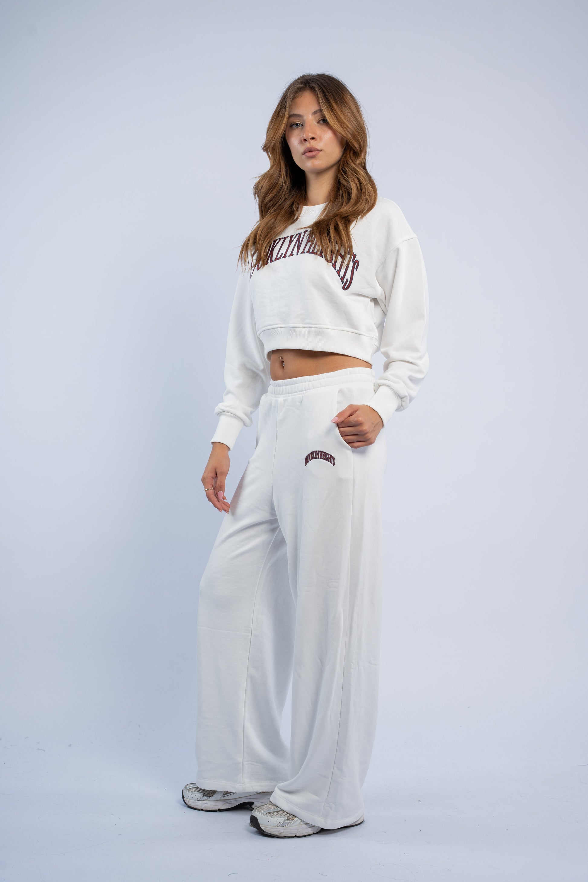 A cozy two-piece fleece set featuring a sweater and matching bottoms, adorned with a stylish "Brooklyn Heights" graphic. Designed for comfortable, casual wear with a modern urban touch.