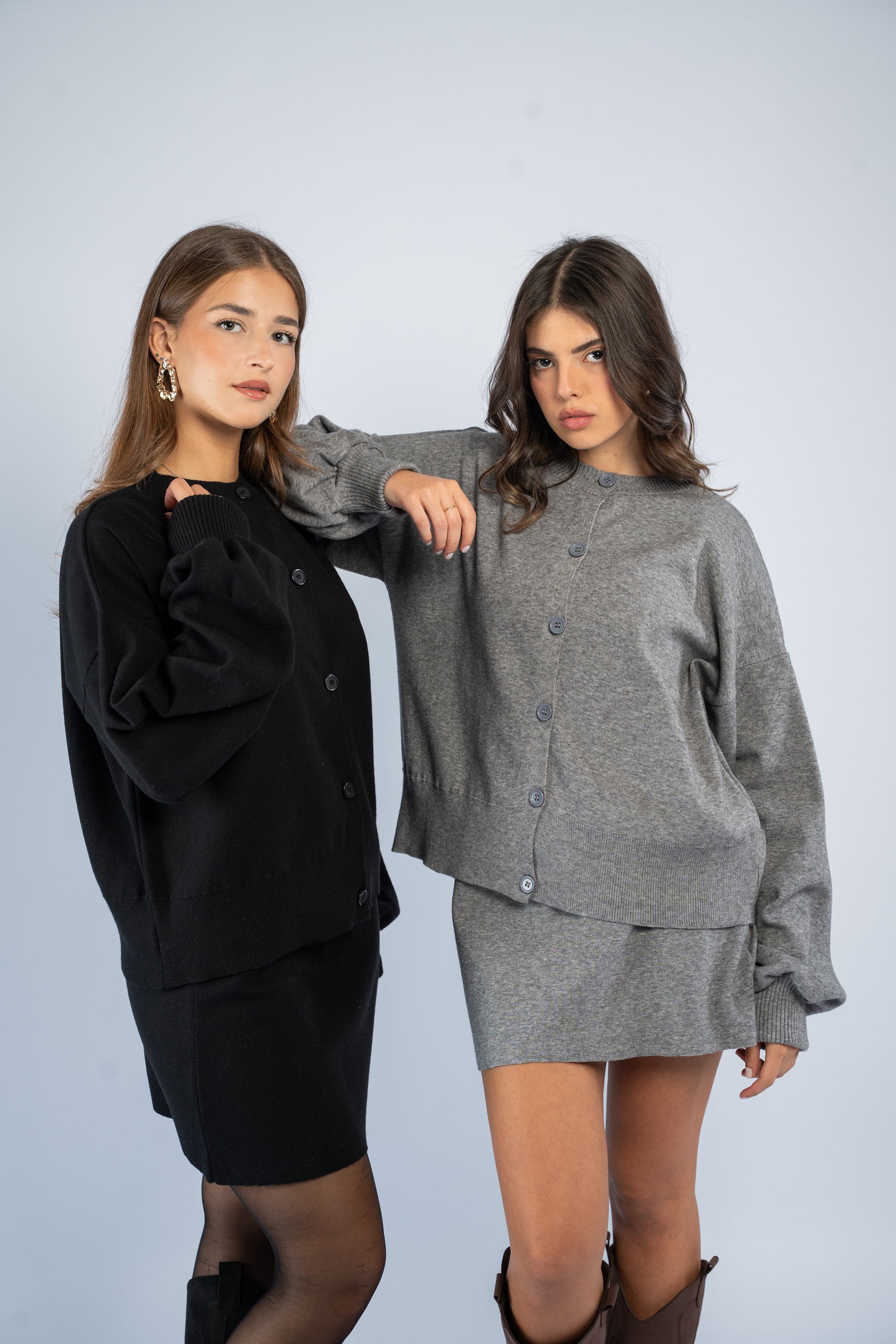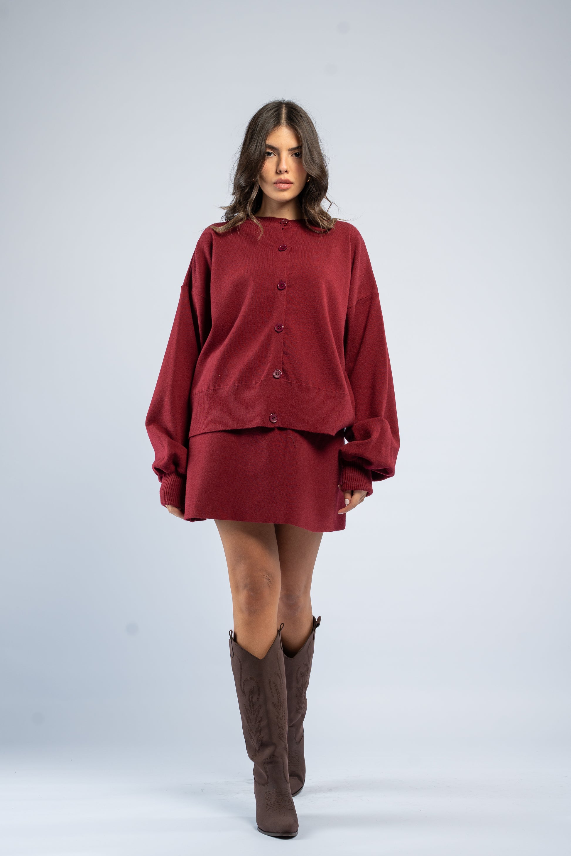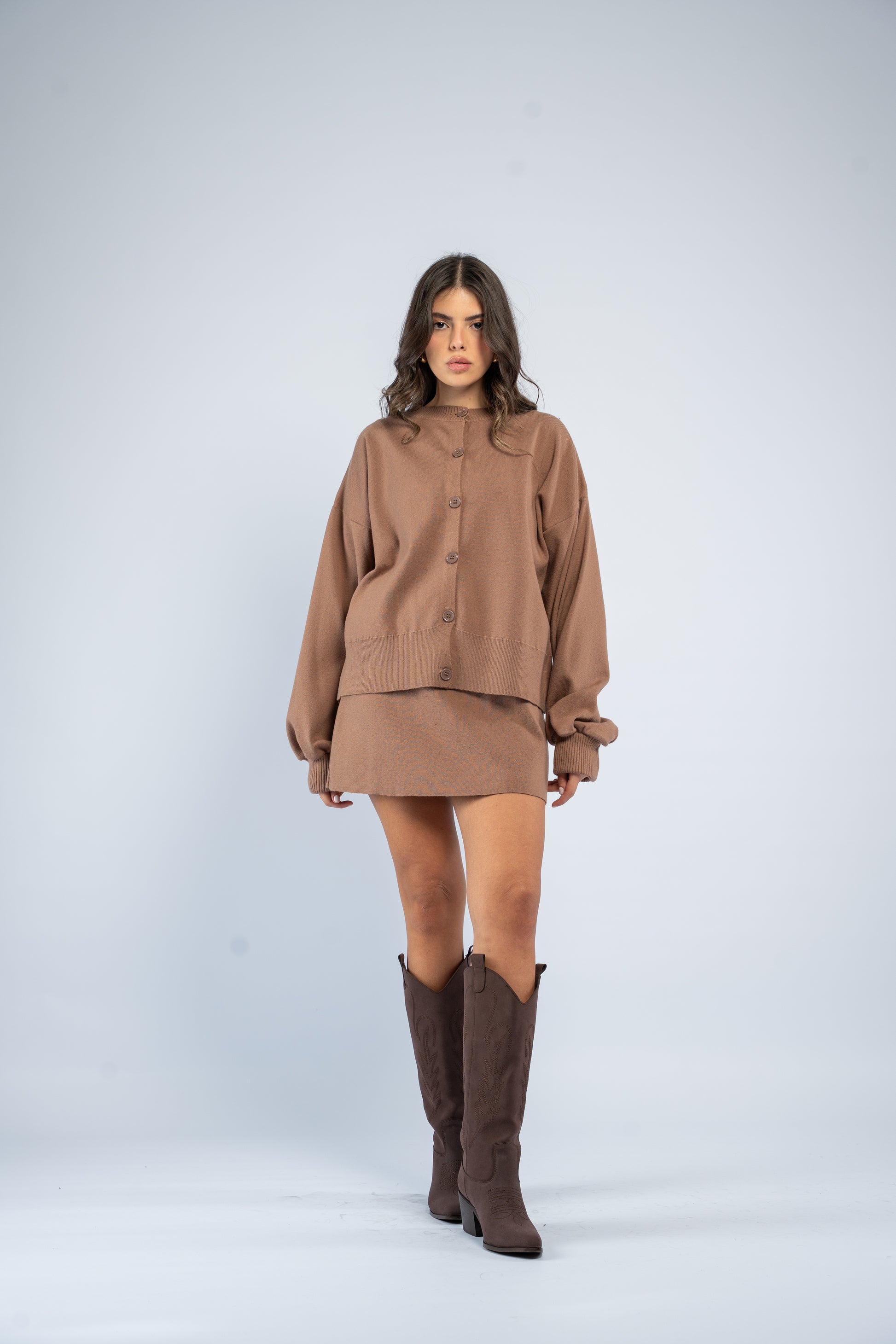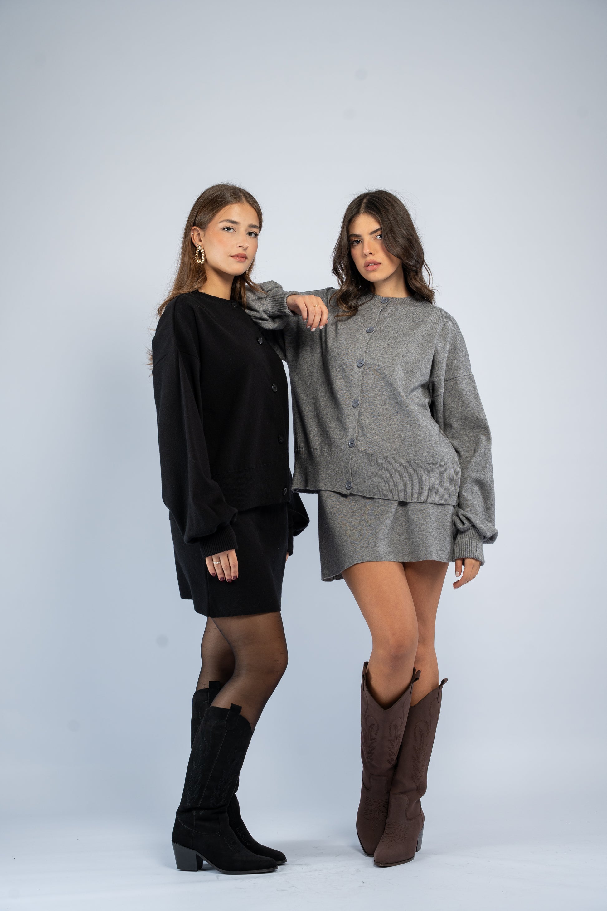 Cozy knit set with a chic cardigan and matching skirt. Soft, comfortable, and perfect for effortless holiday looks.