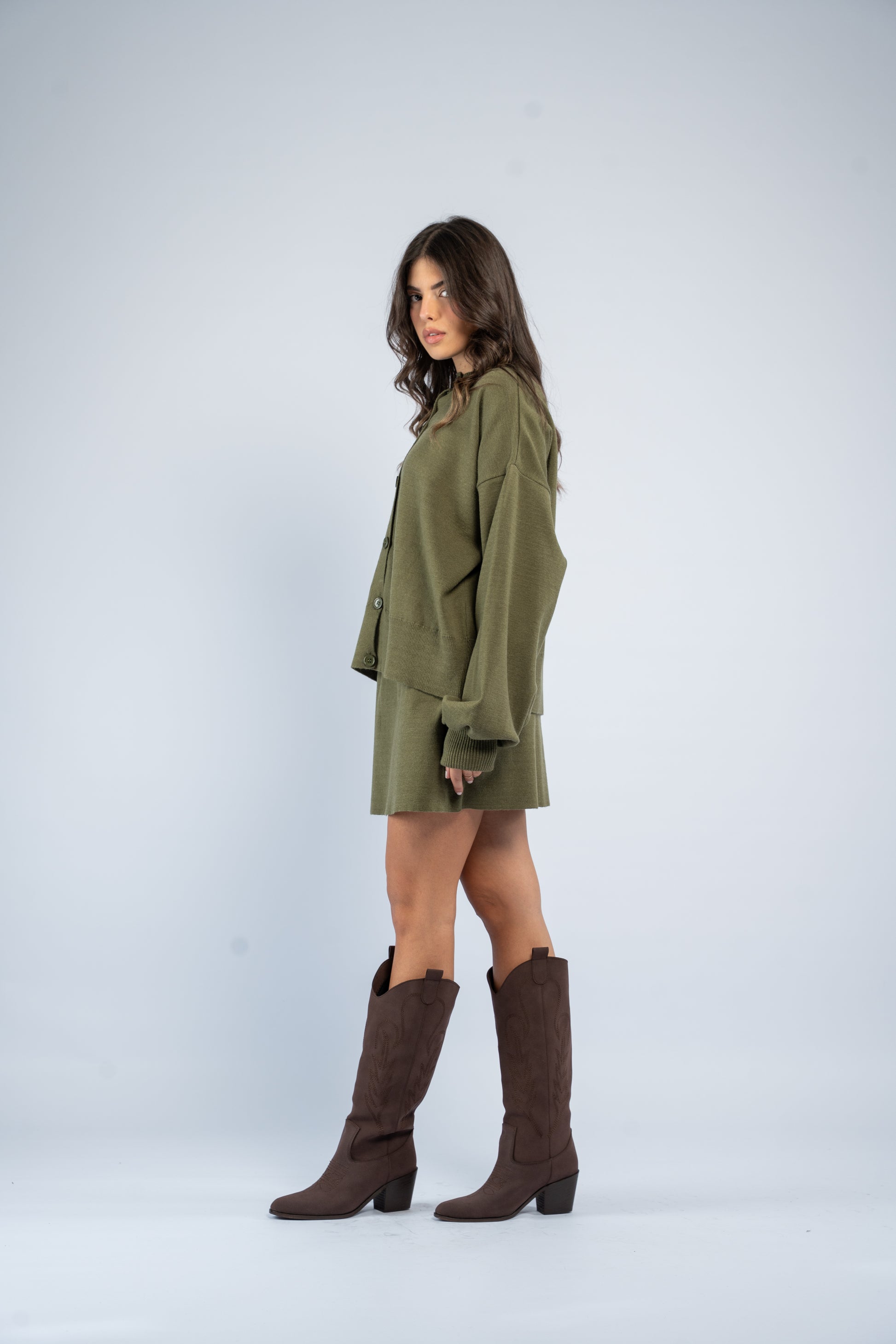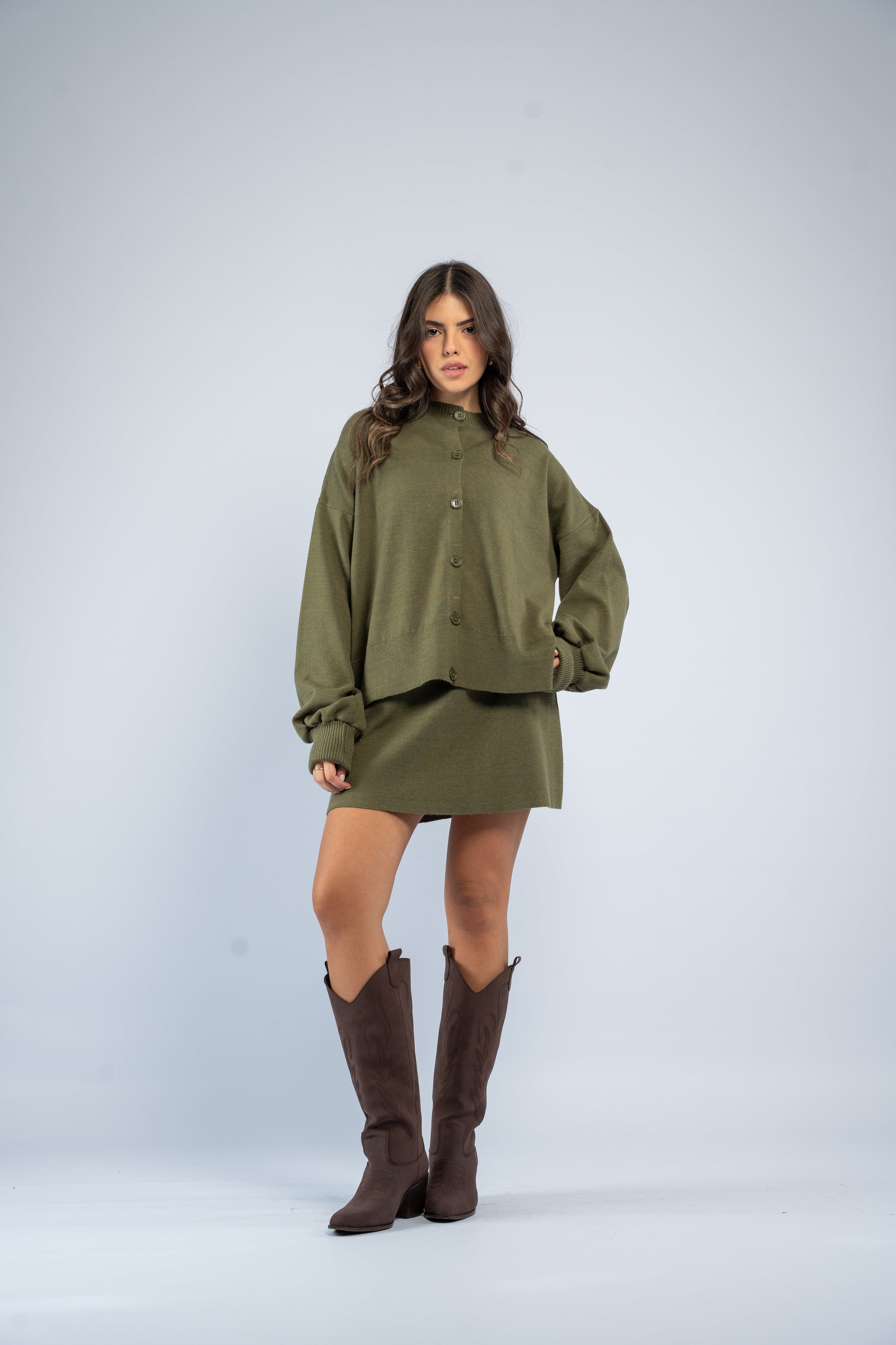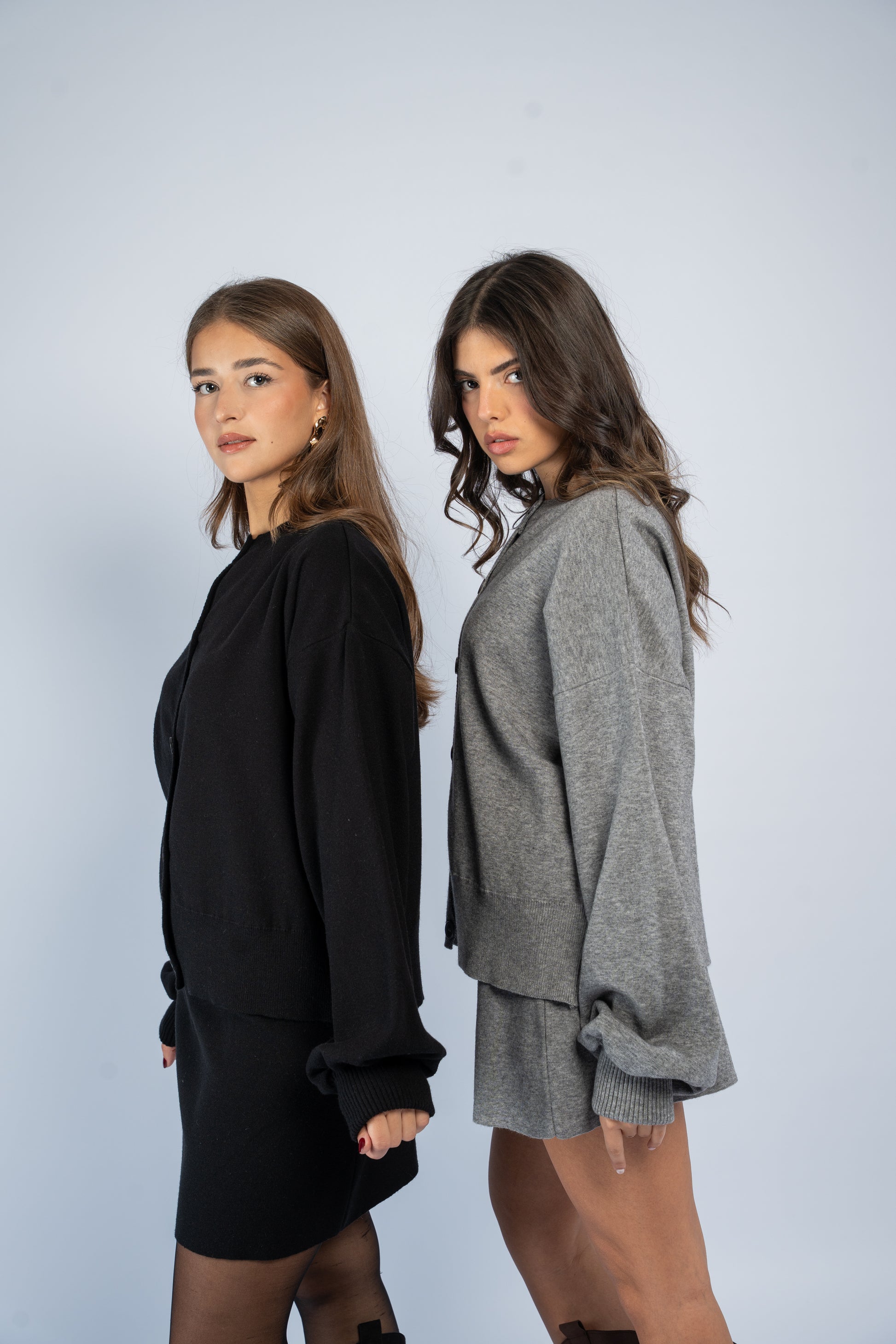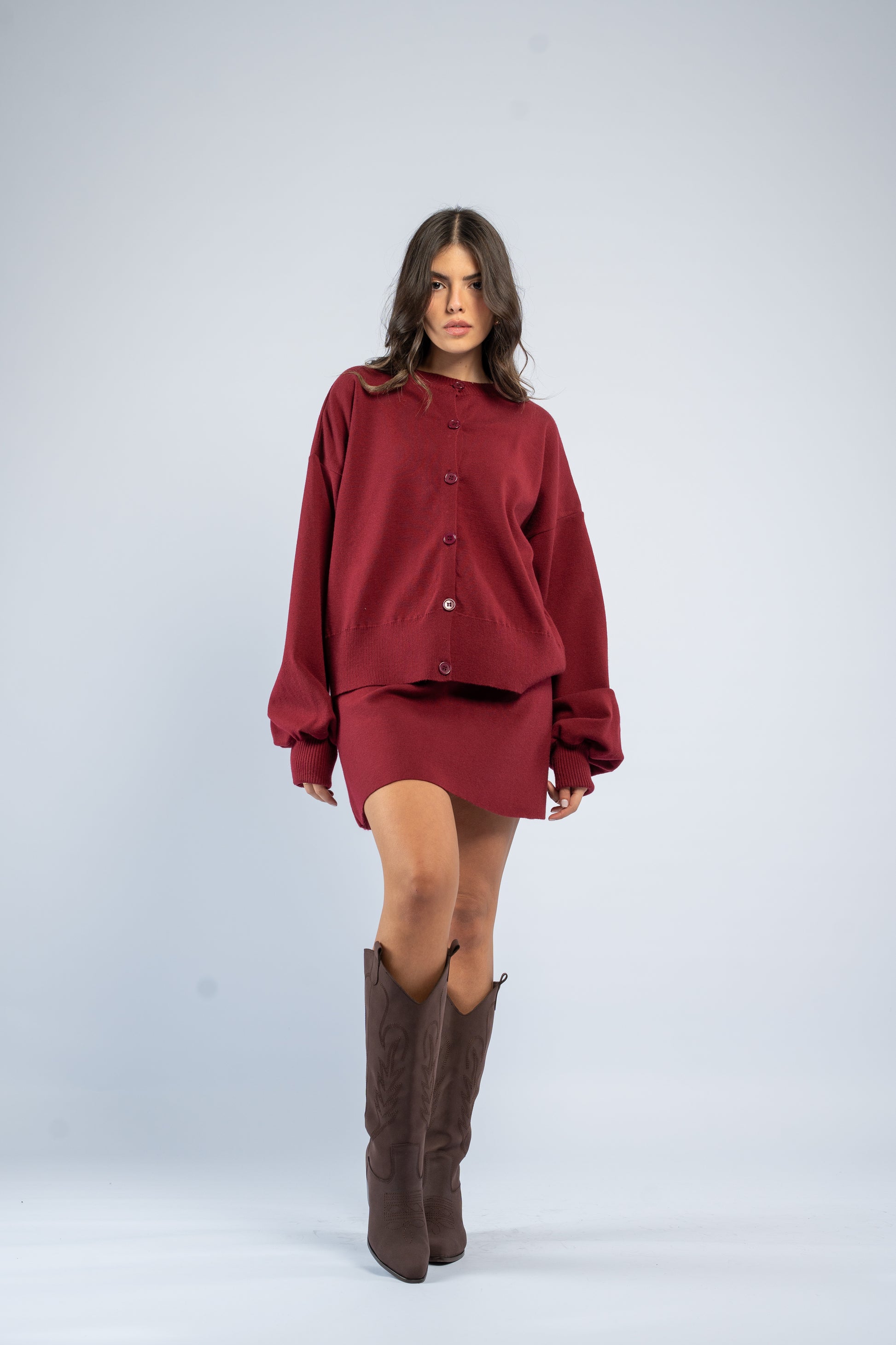 Cozy knit set with a chic cardigan and matching skirt. Soft, comfortable, and perfect for effortless holiday looks.