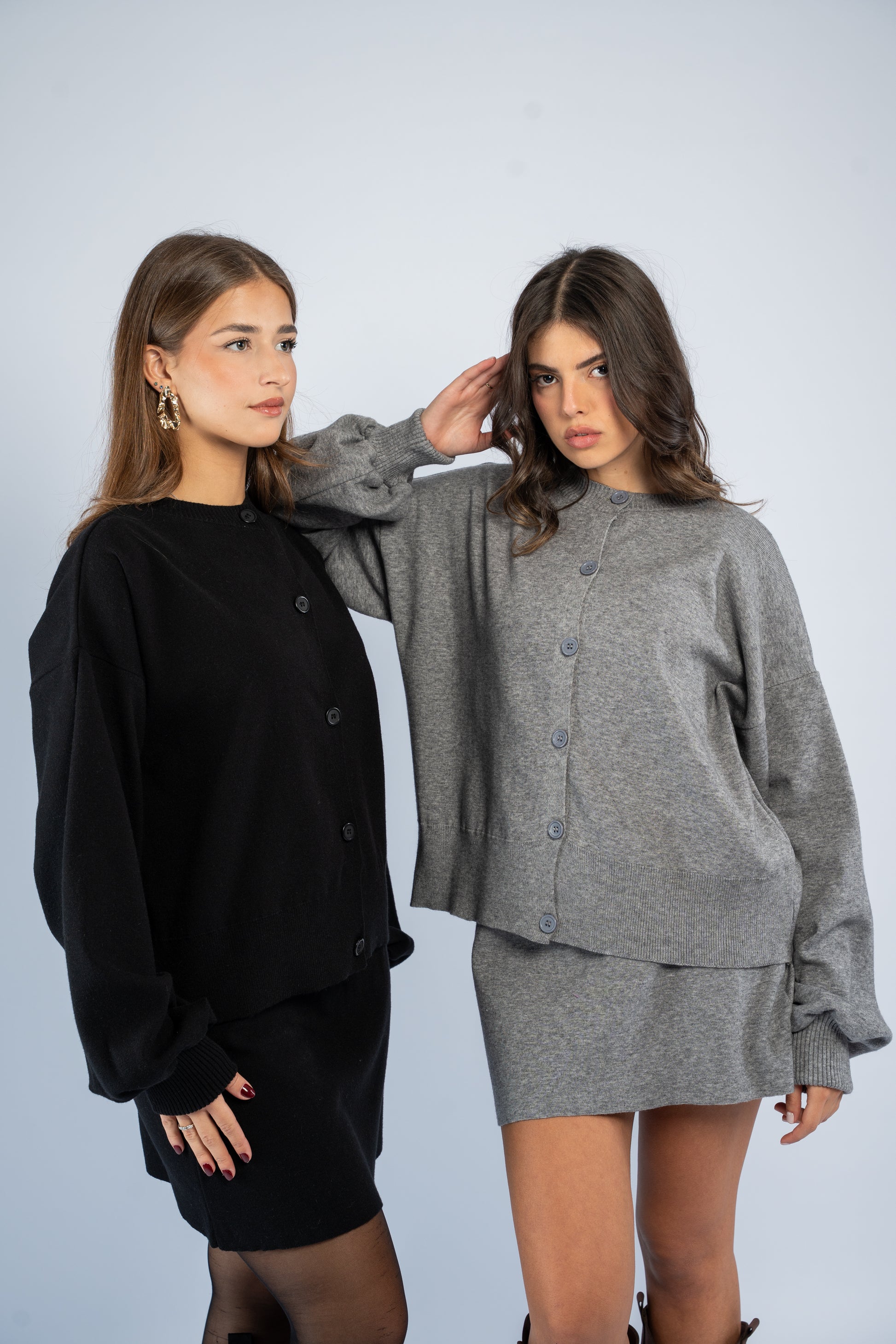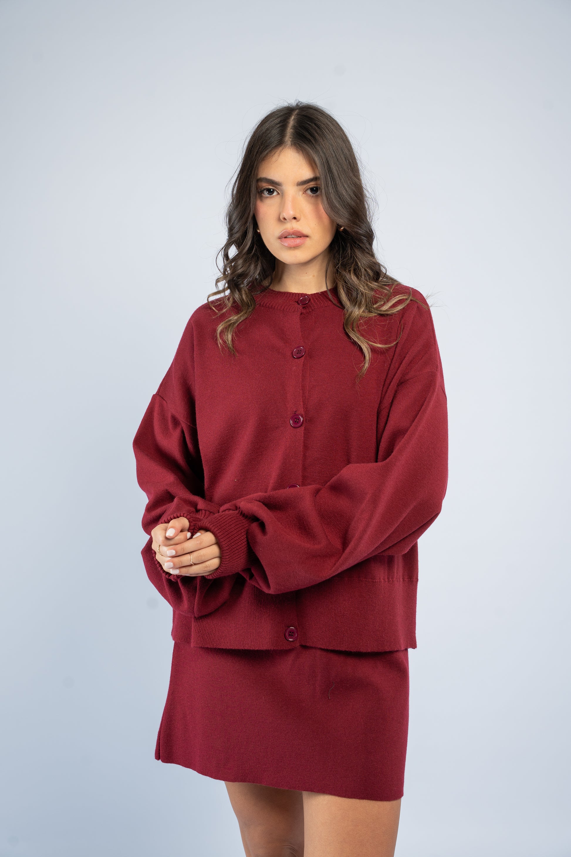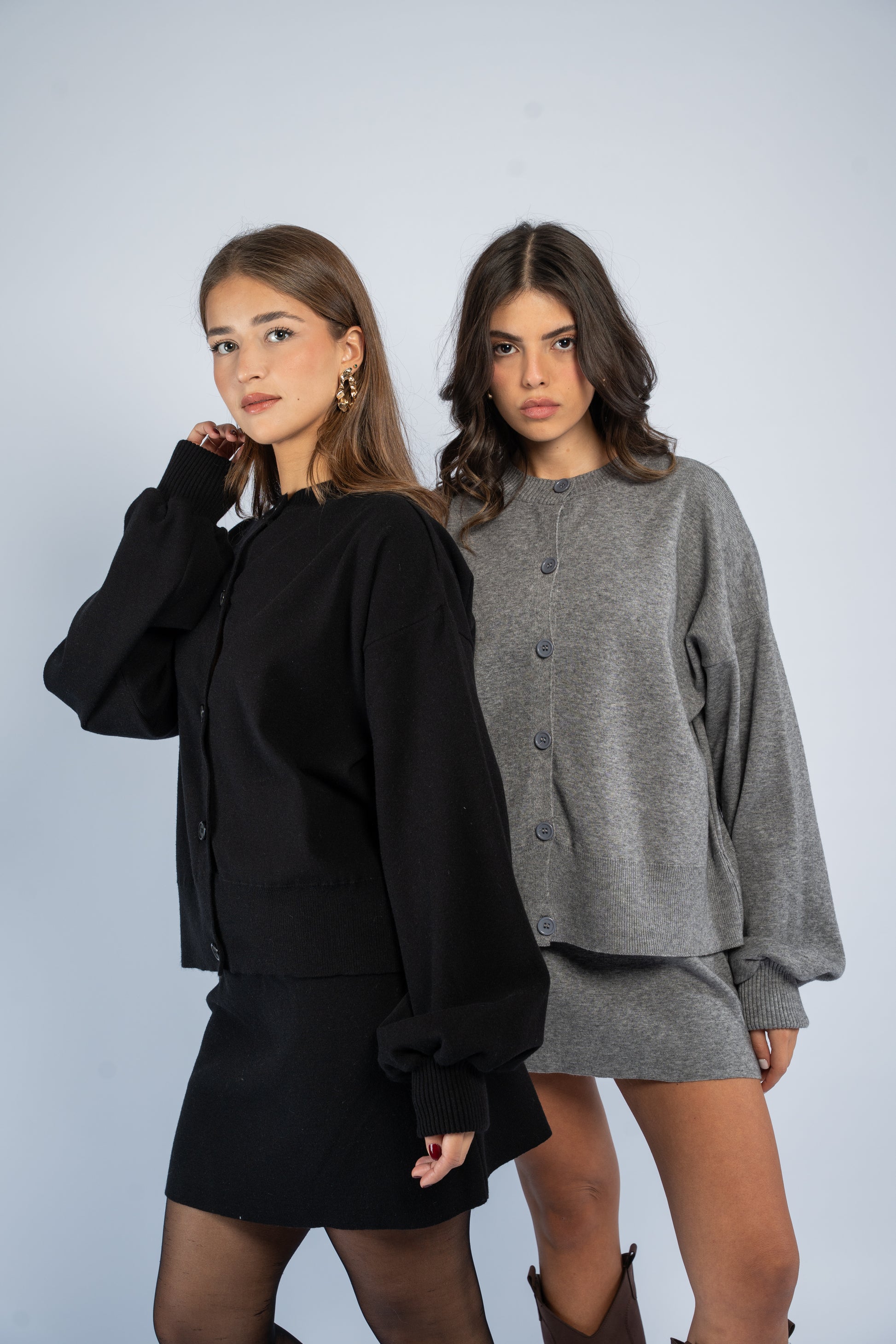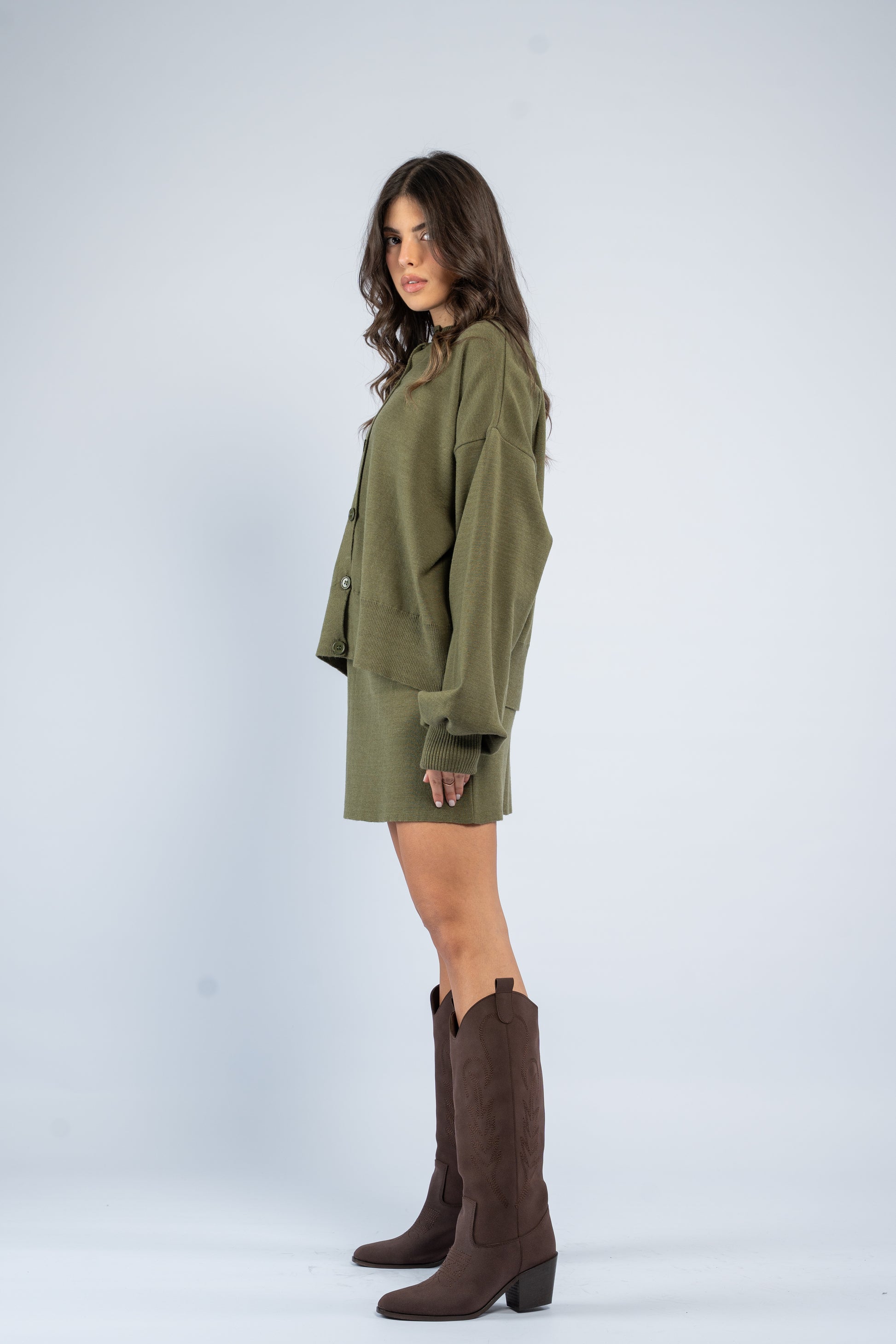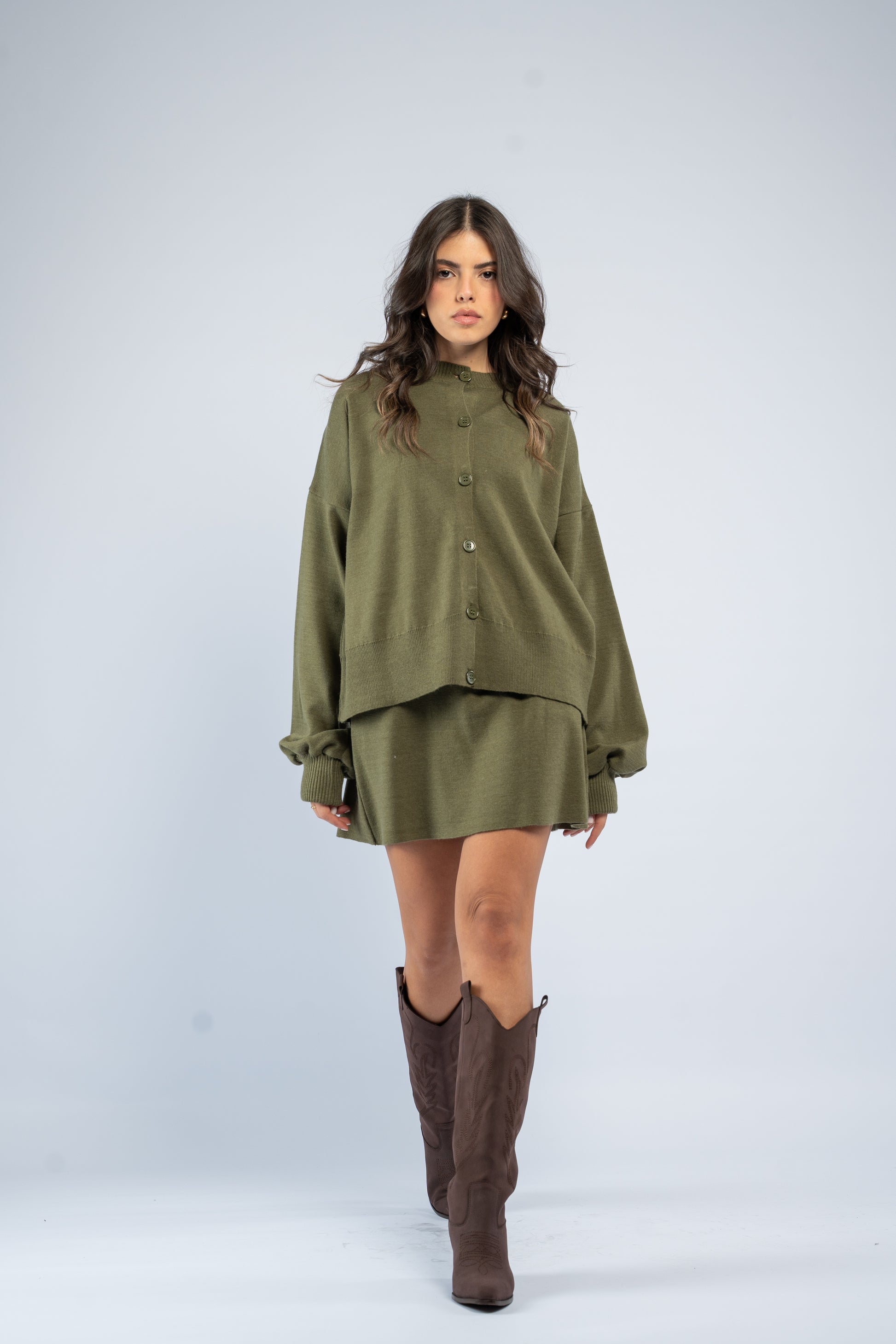 Cozy knit set with a chic cardigan and matching skirt. Soft, comfortable, and perfect for effortless holiday looks.