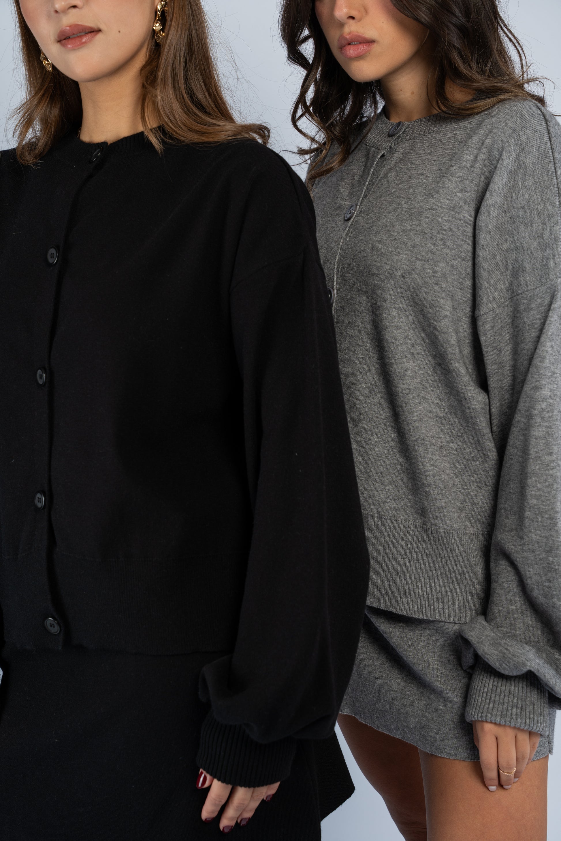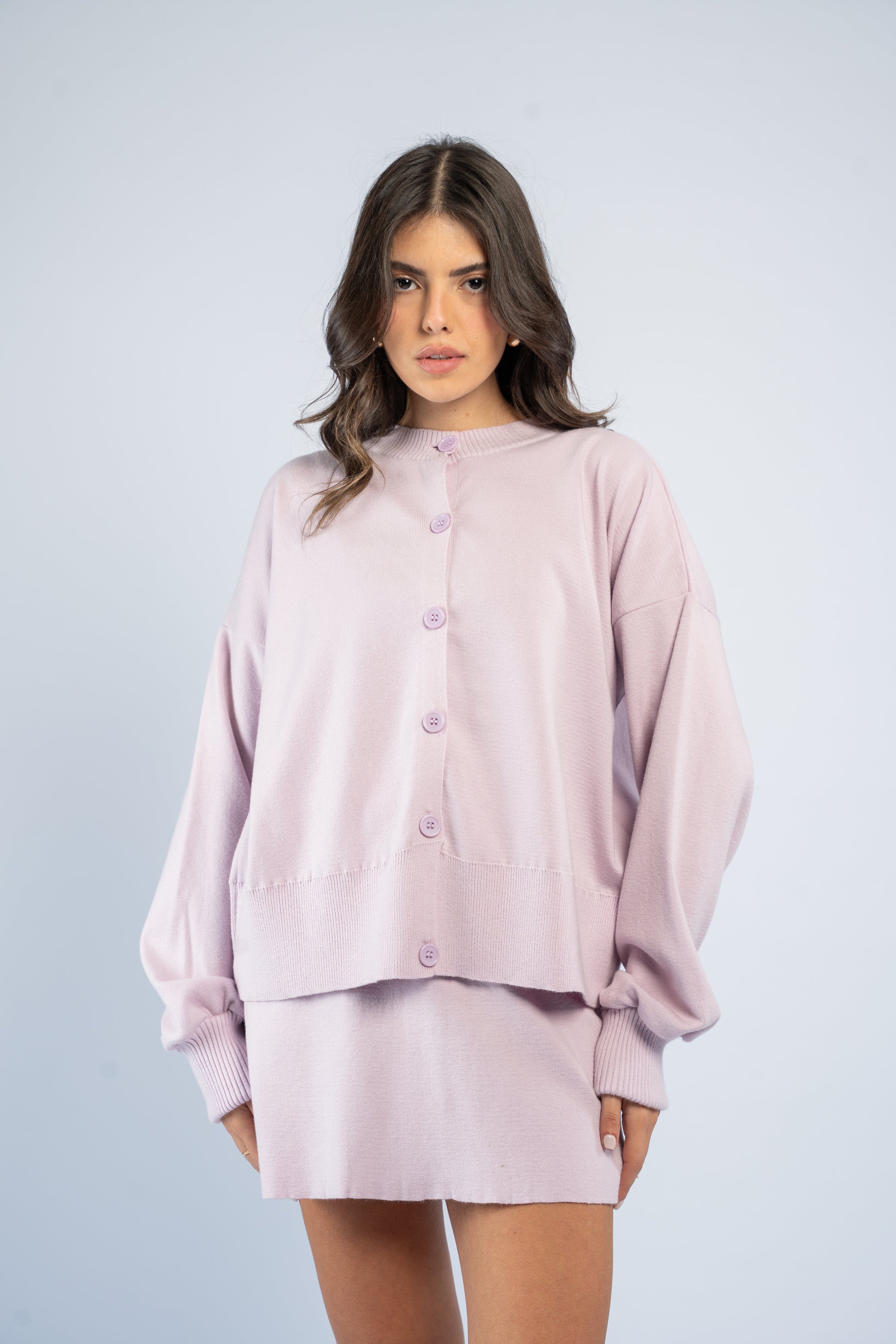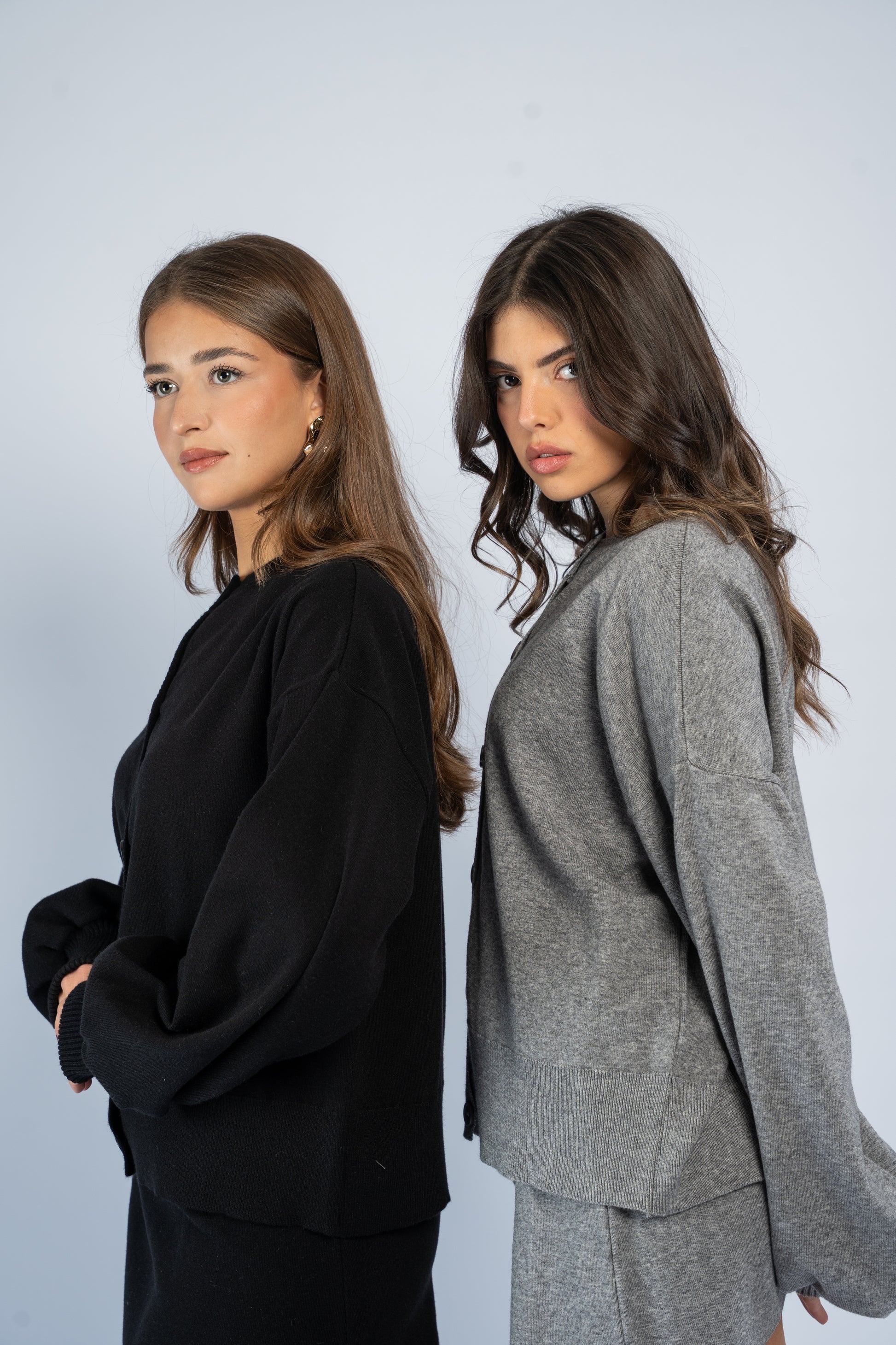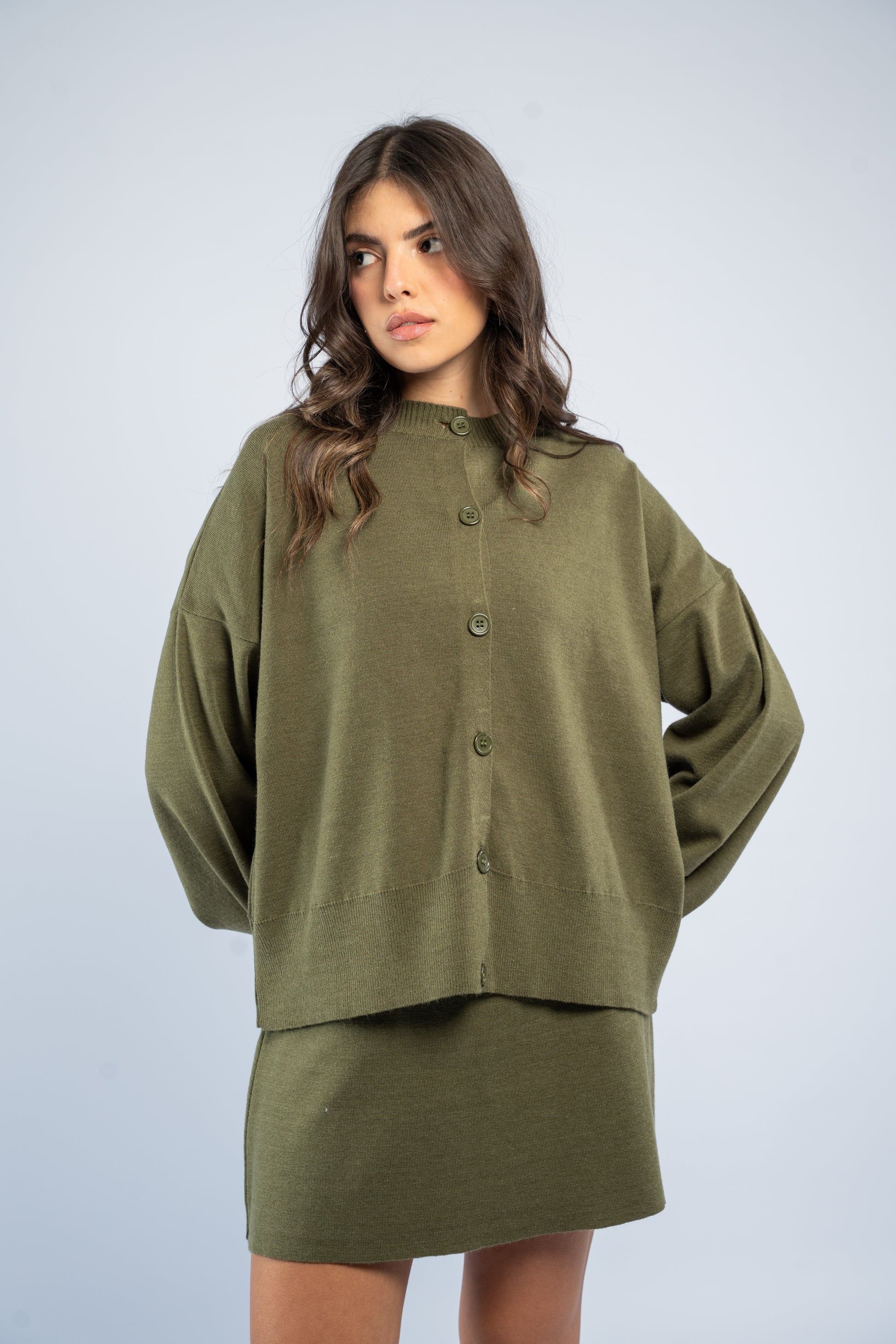 Cozy knit set with a chic cardigan and matching skirt. Soft, comfortable, and perfect for effortless holiday looks.