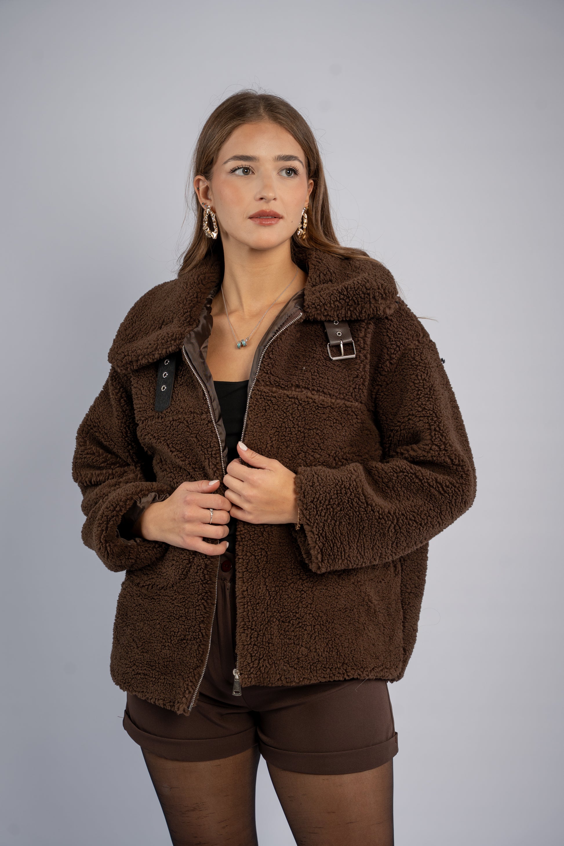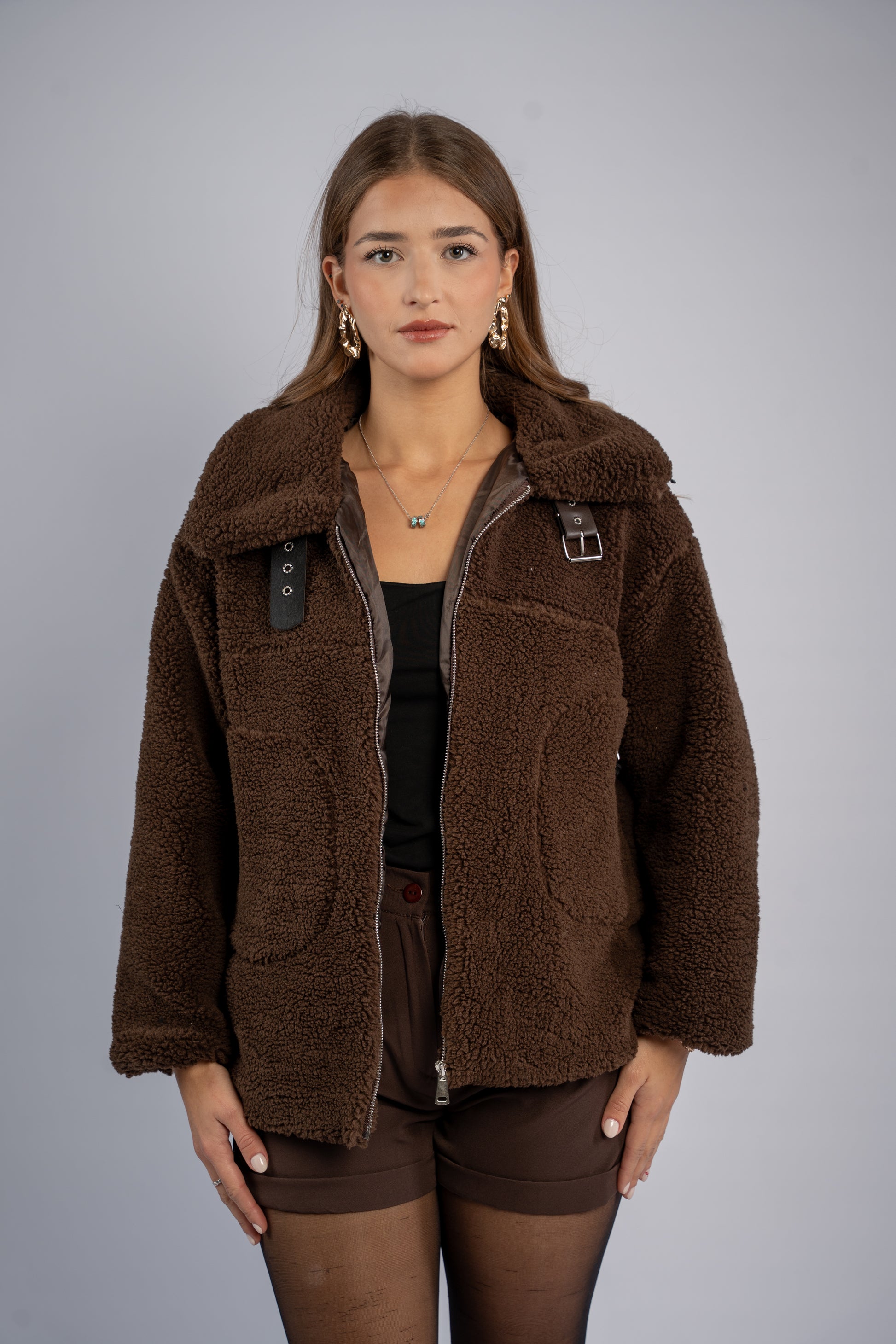 Brown faux shearling jacket with a soft outer texture and warm lining. Clean structure with classic shearling-inspired details.