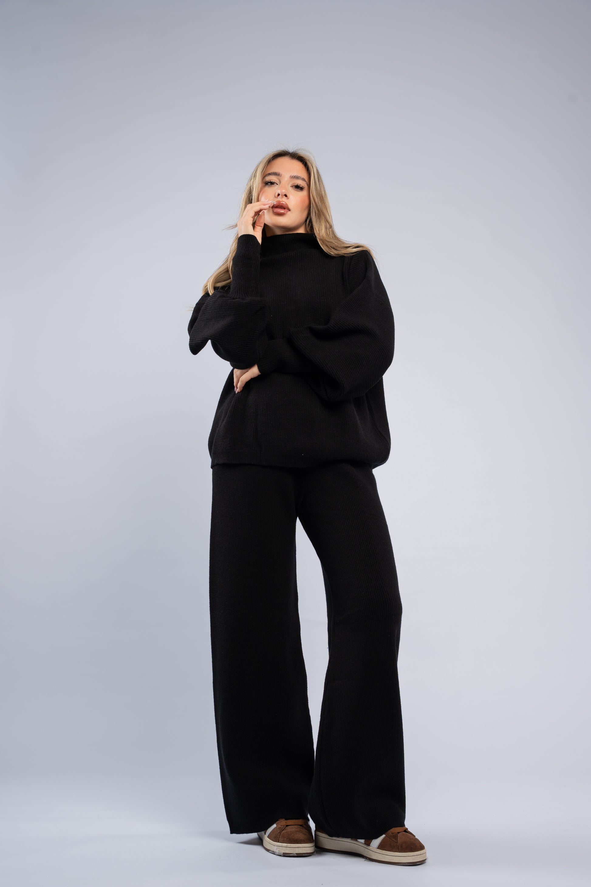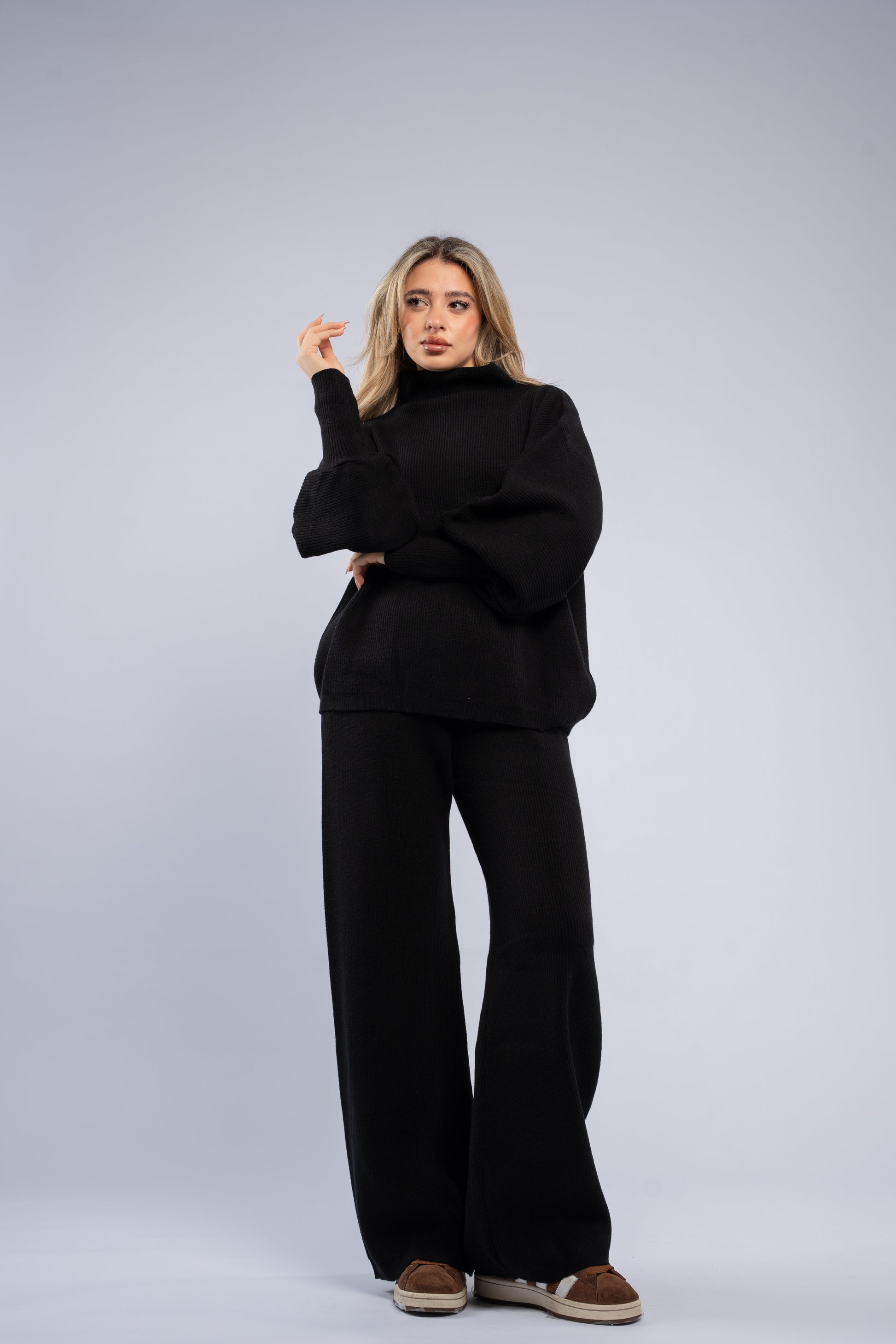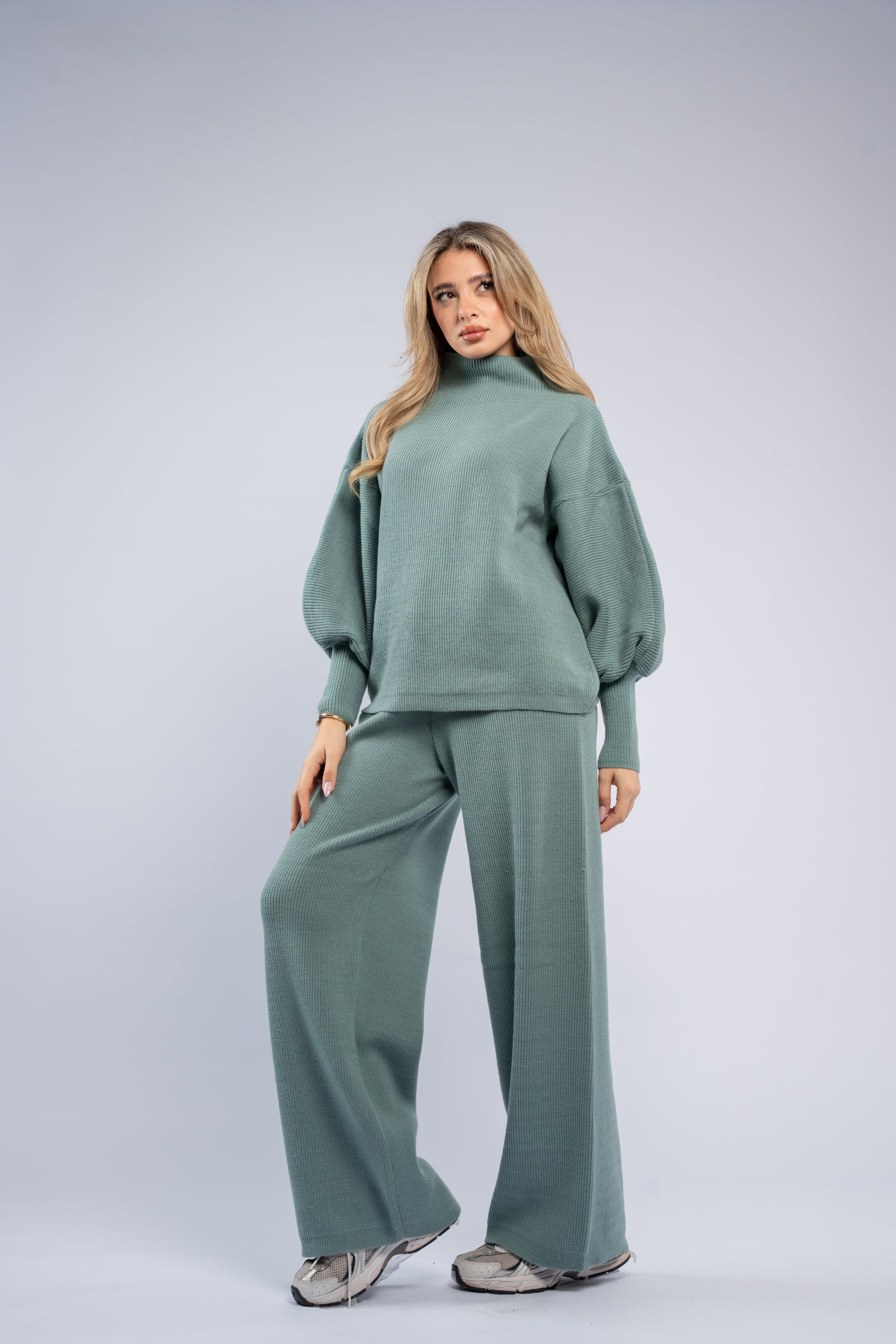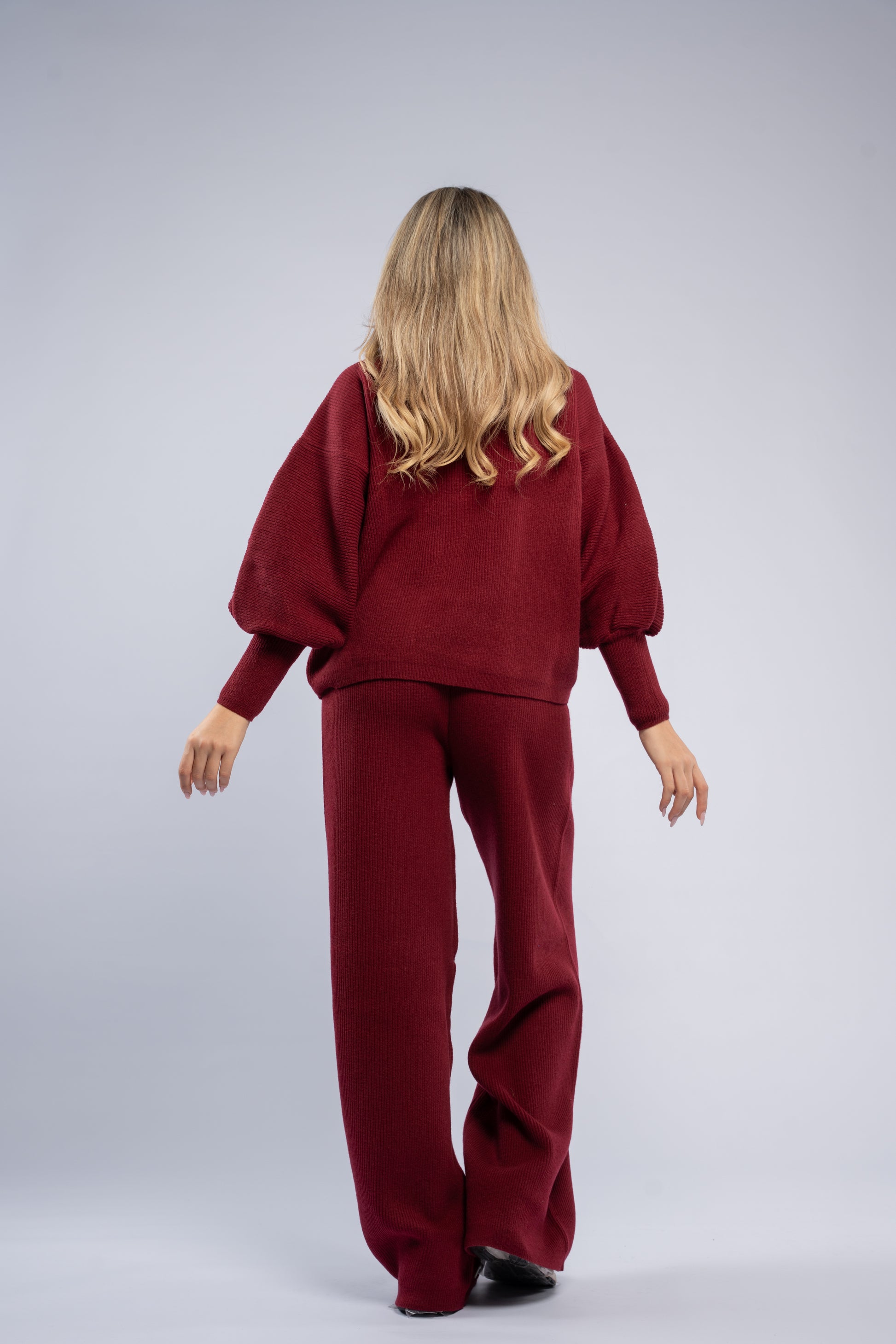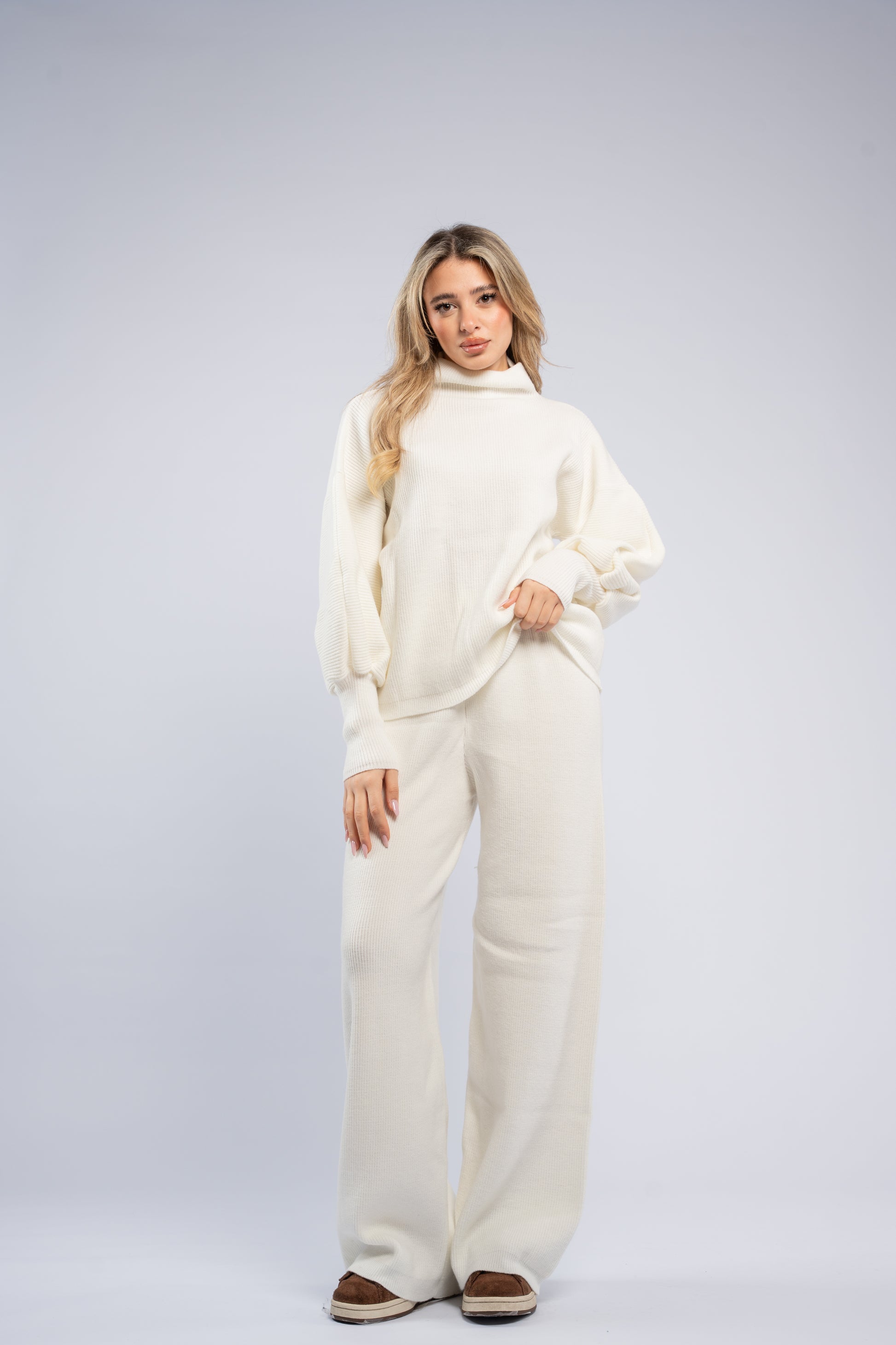 Ultra-soft wool set featuring an oversized top with fitted cuffs and matching pants. Cozy, comfortable, and perfect for relaxed yet stylish looks.