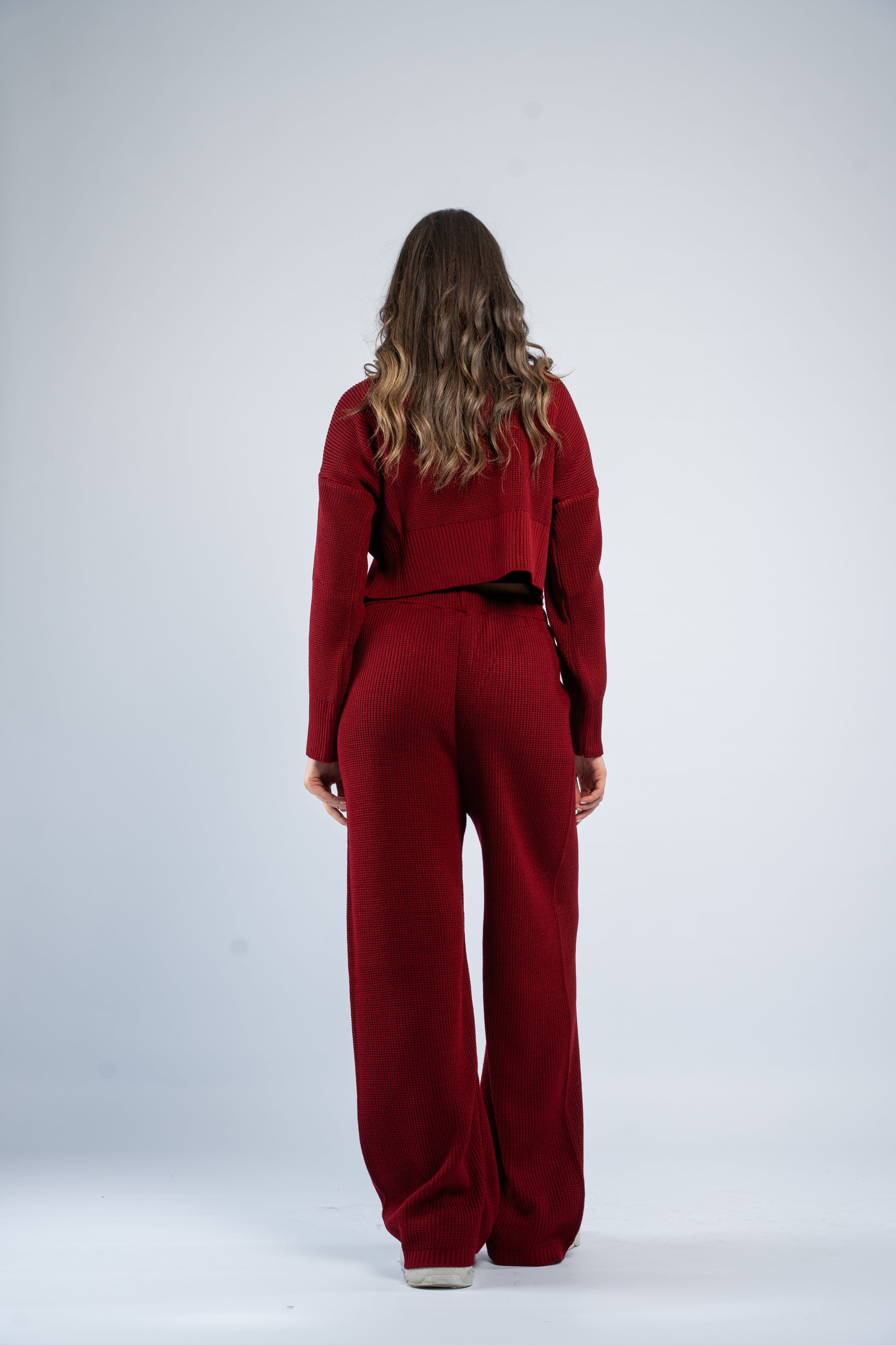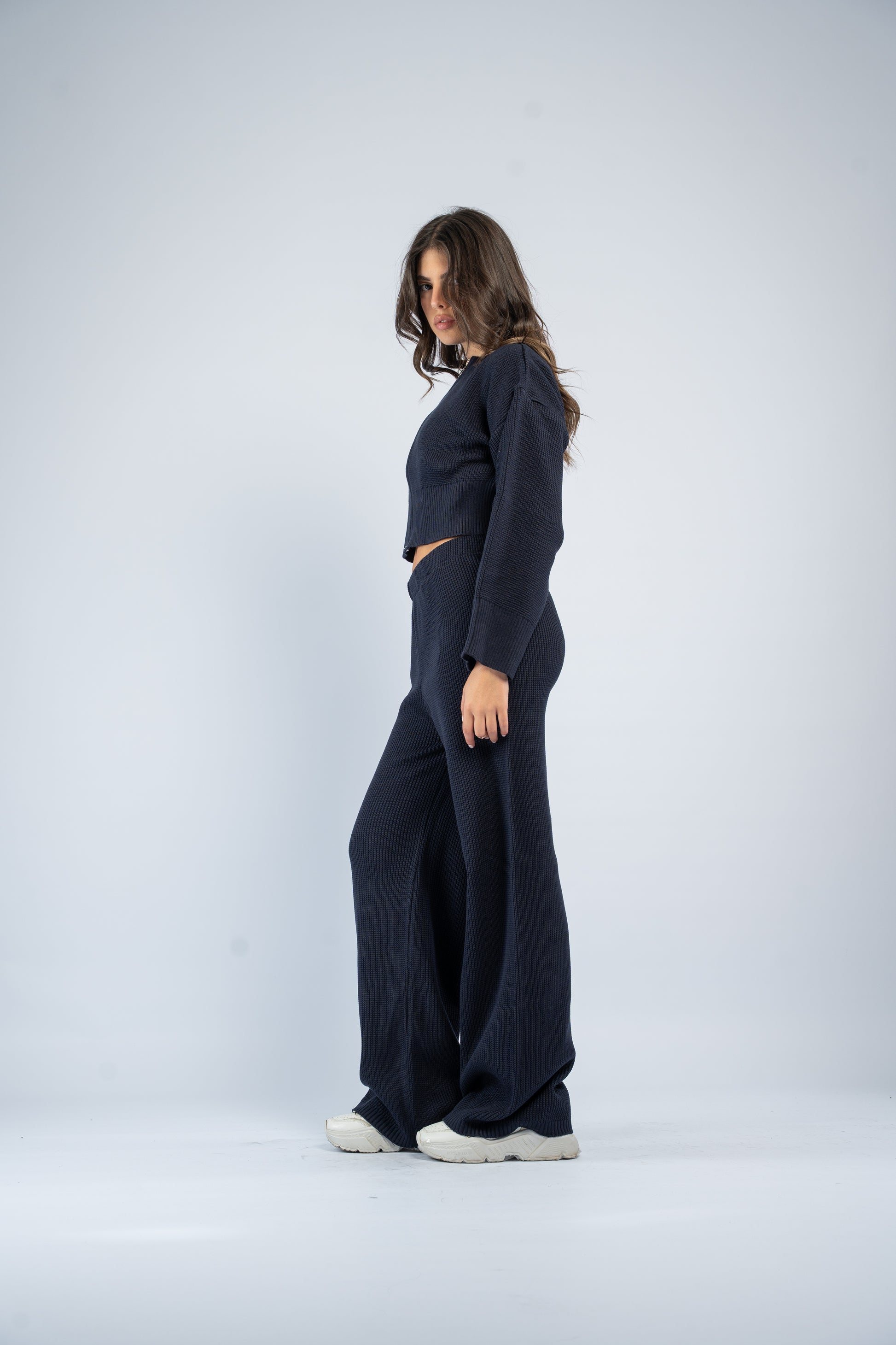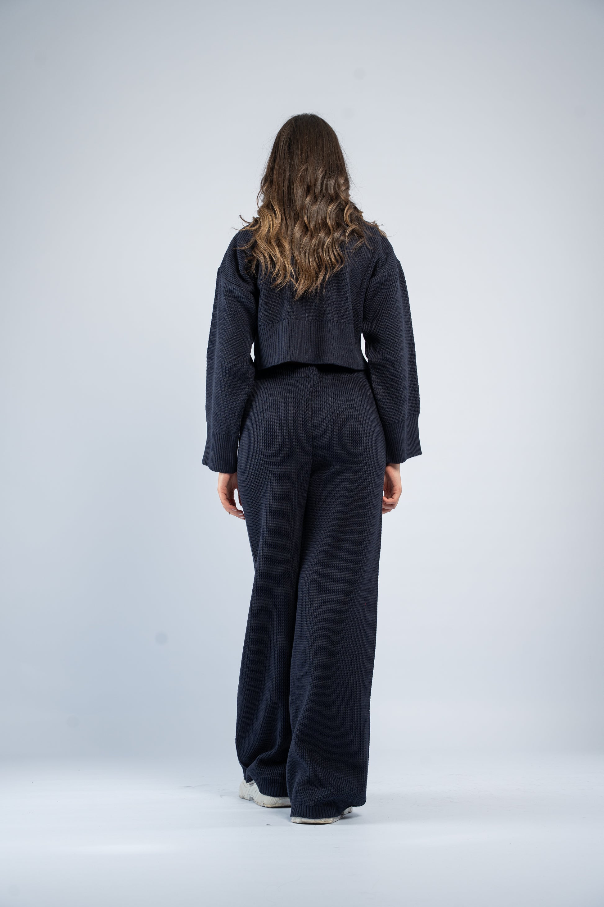 Cozy knit set featuring a cropped jacket and matching pants. Stylish, comfortable, and easy to wear for a polished everyday look.