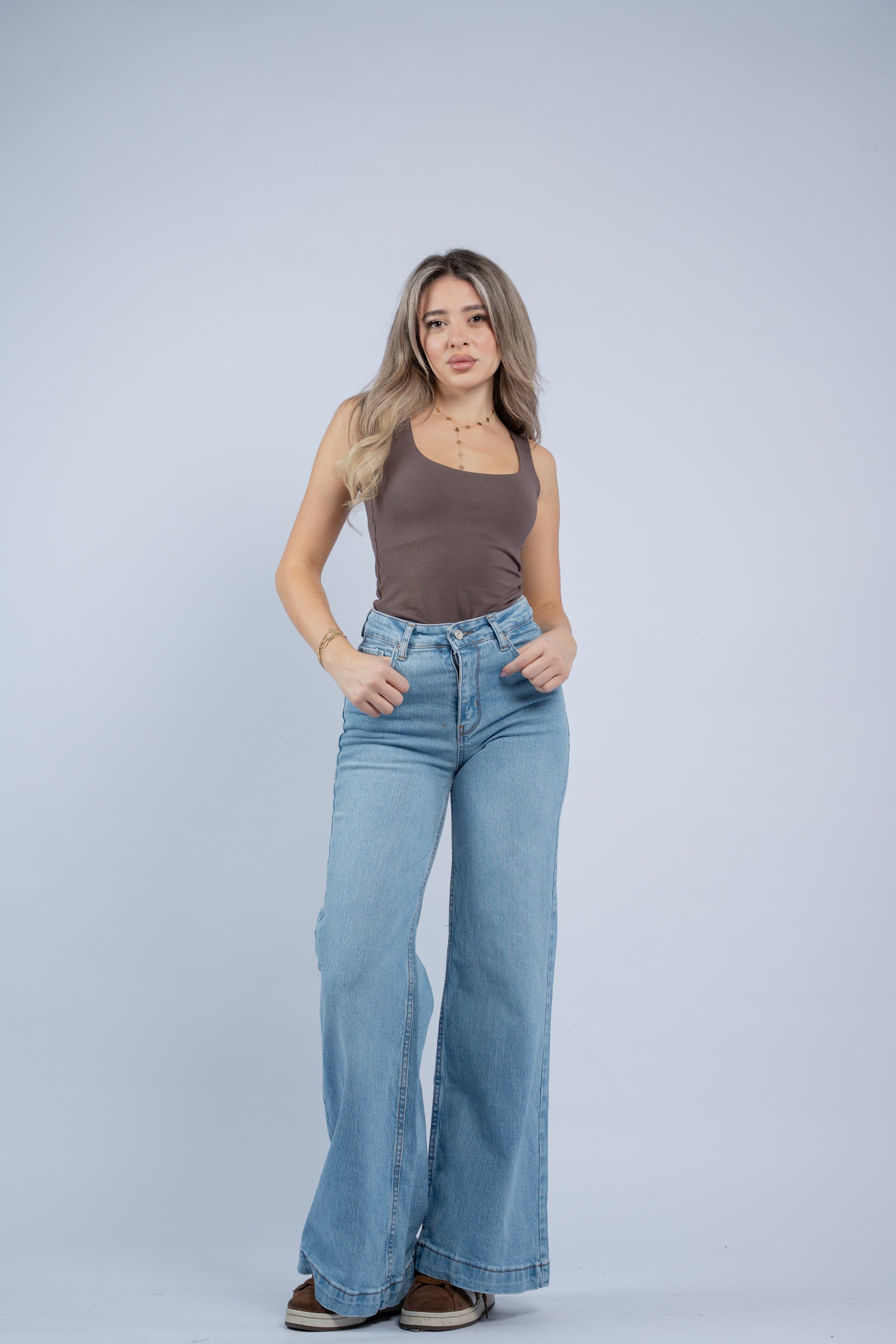 Flare-leg jeans with a high-rise fit and a clean, structured silhouette. Finished with classic denim detailing and a smooth, flattering drape.