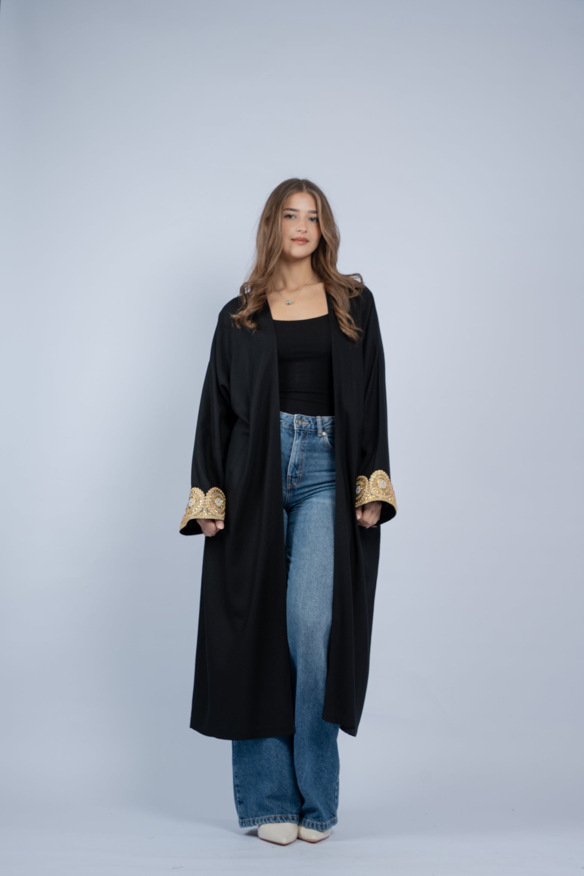 Long abaya featuring ornate gold cuff embroidery with medallion detailing.