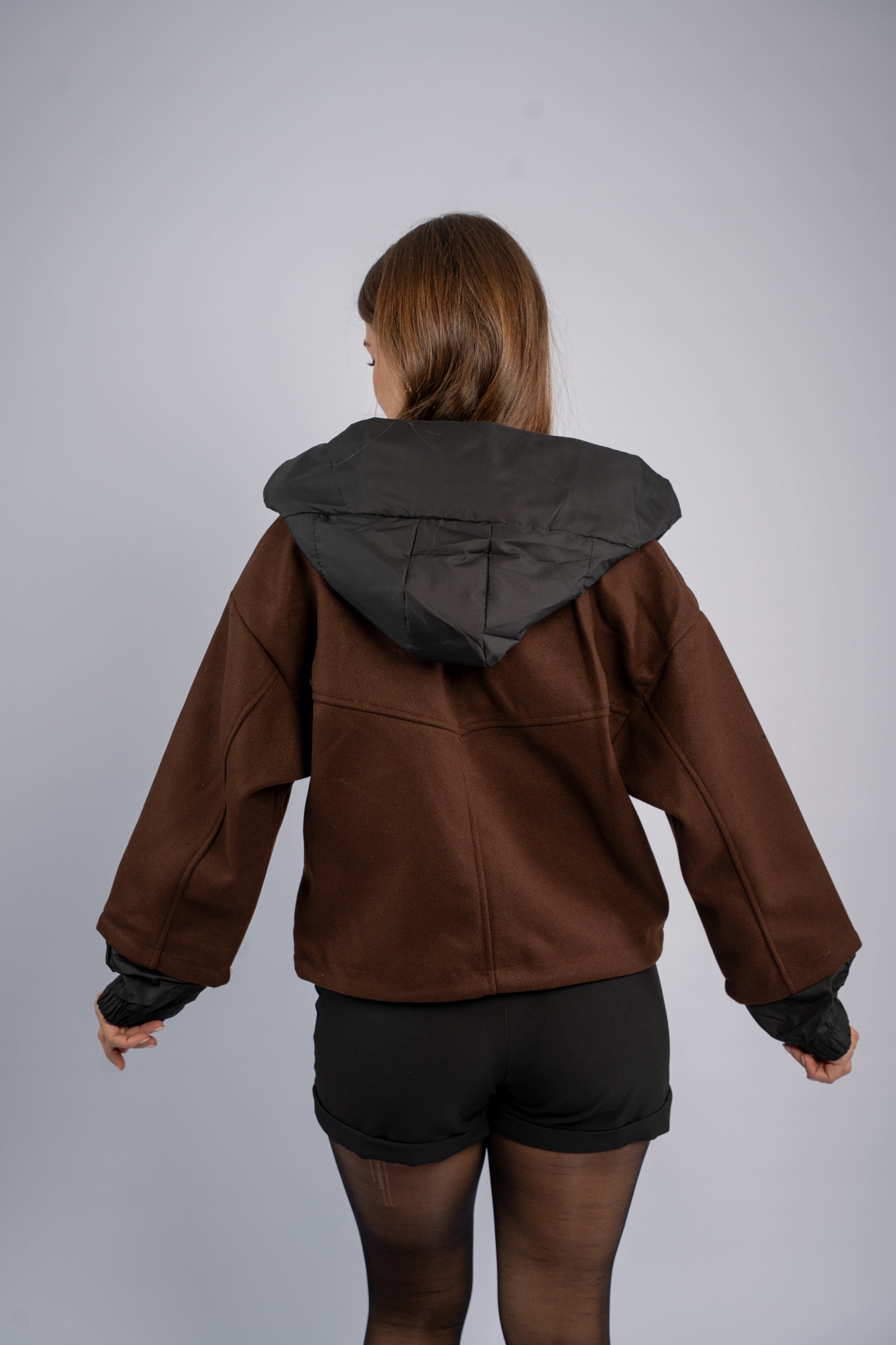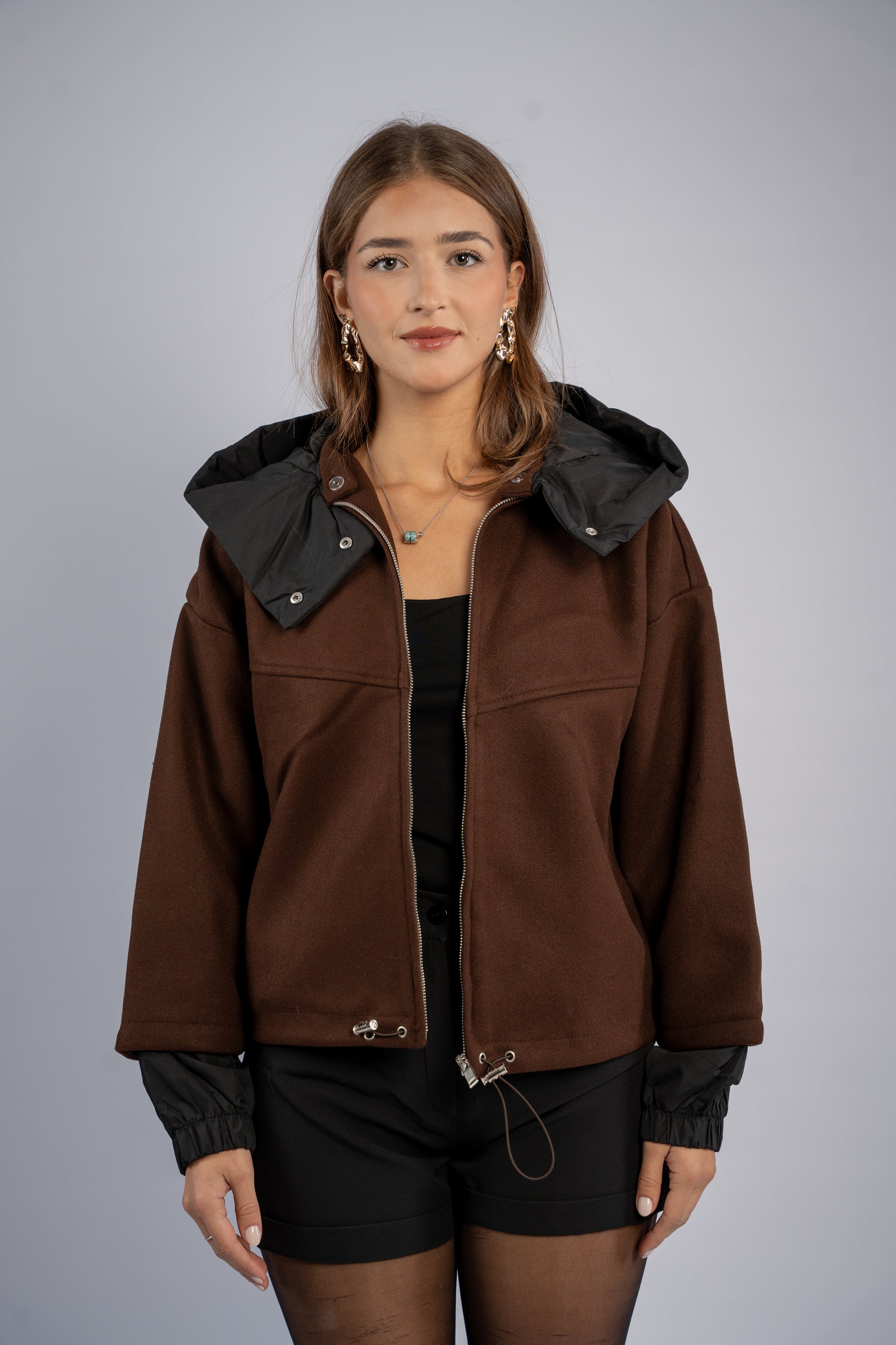 Soft brown joukh jacket designed with a hood for extra warmth. Smooth texture, comfortable fit, and a clean everyday silhouette.