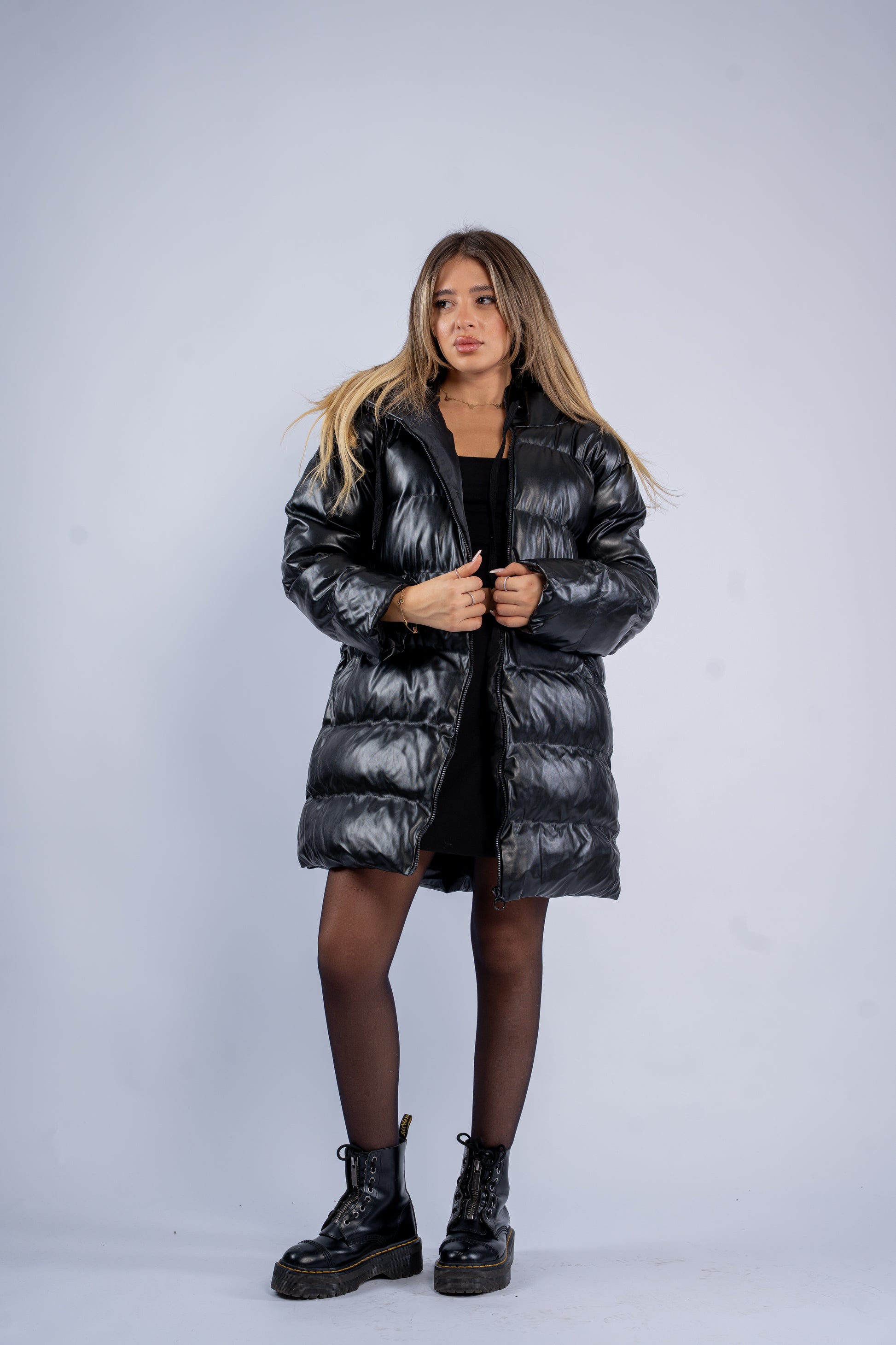 Midi-length leather puffer jacket with a hood, featuring lightweight insulation for warmth. Sleek and structured design for a modern, comfortable fit.