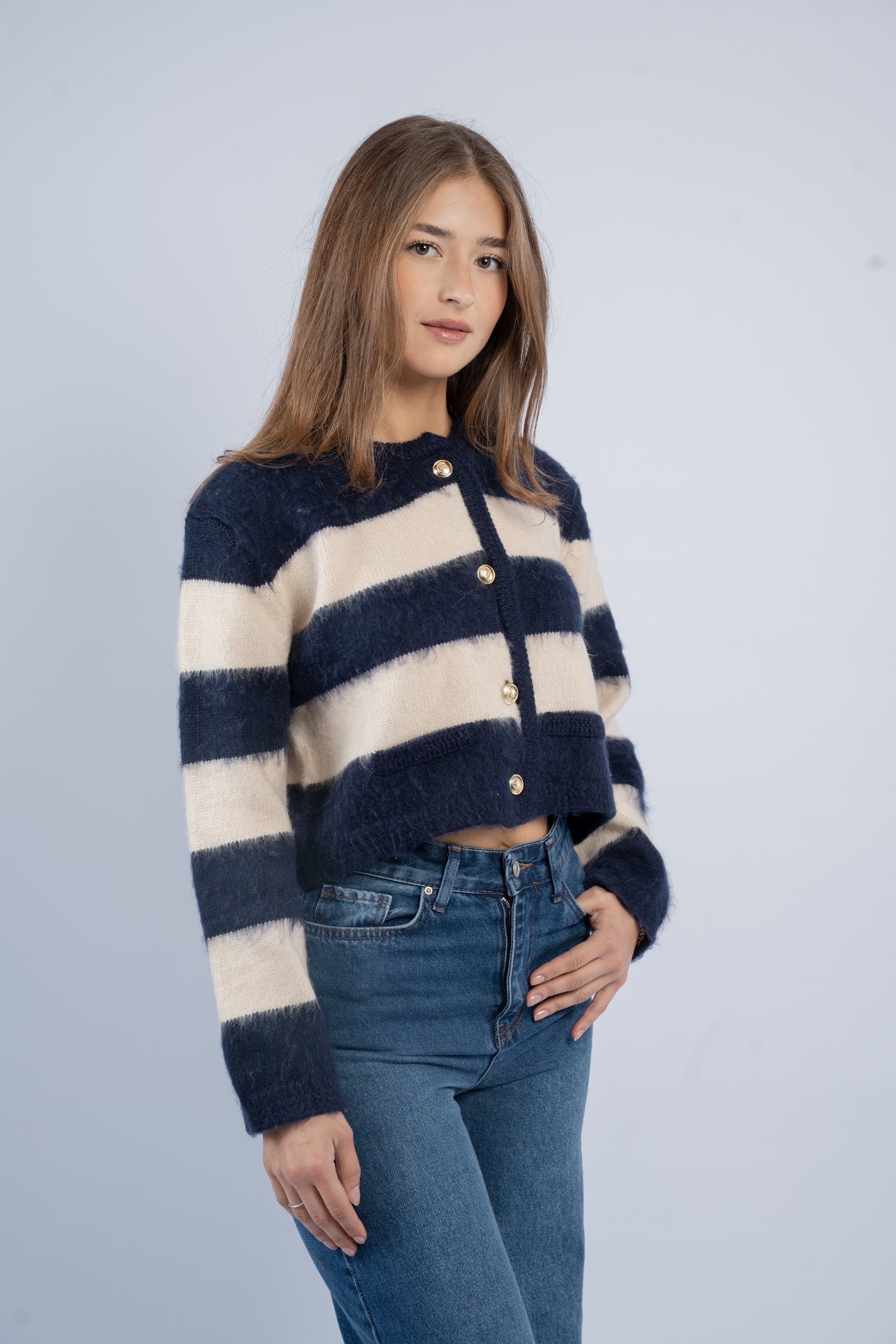 Cardigan crafted from brushed wool, featuring bold navy and white block stripes and gold button detailing. Structured yet comfortable, perfect for layering.