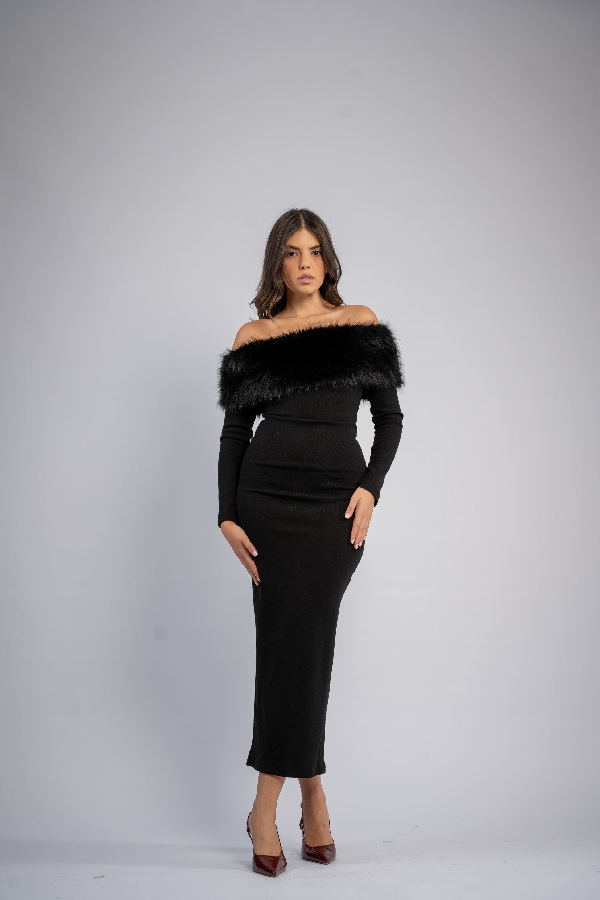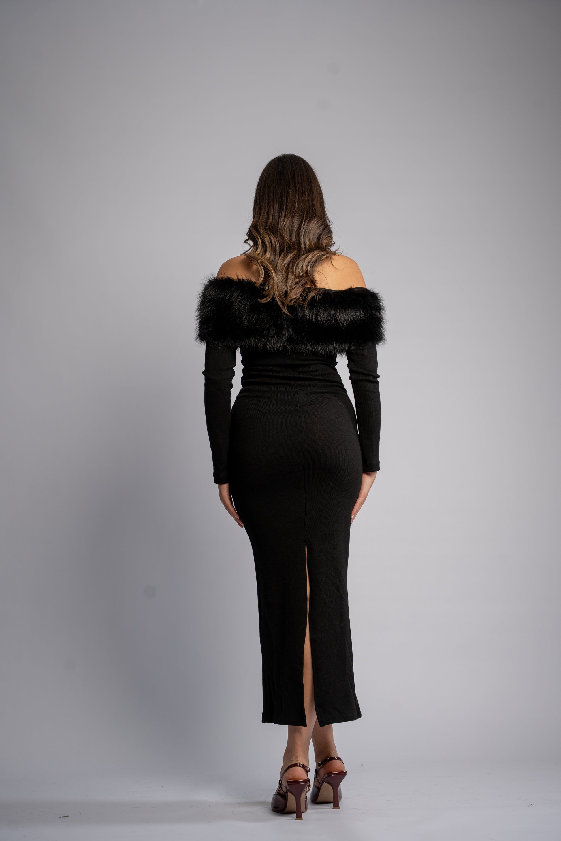 Long black dress with an off-shoulder fur trim. Soft, smooth fabric with a fitted silhouette and a clean, elegant finish—ideal for winter evenings and festive occasions.