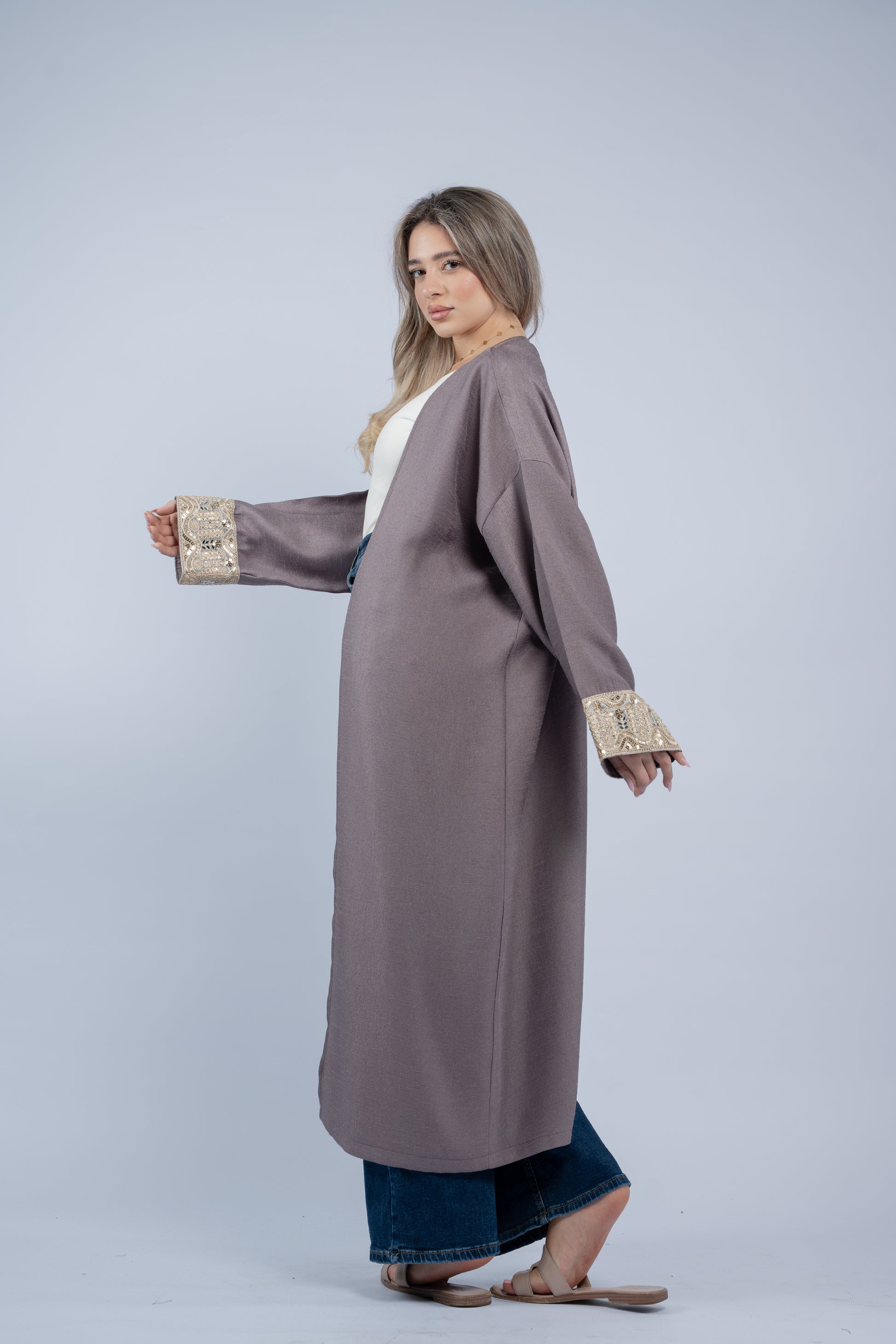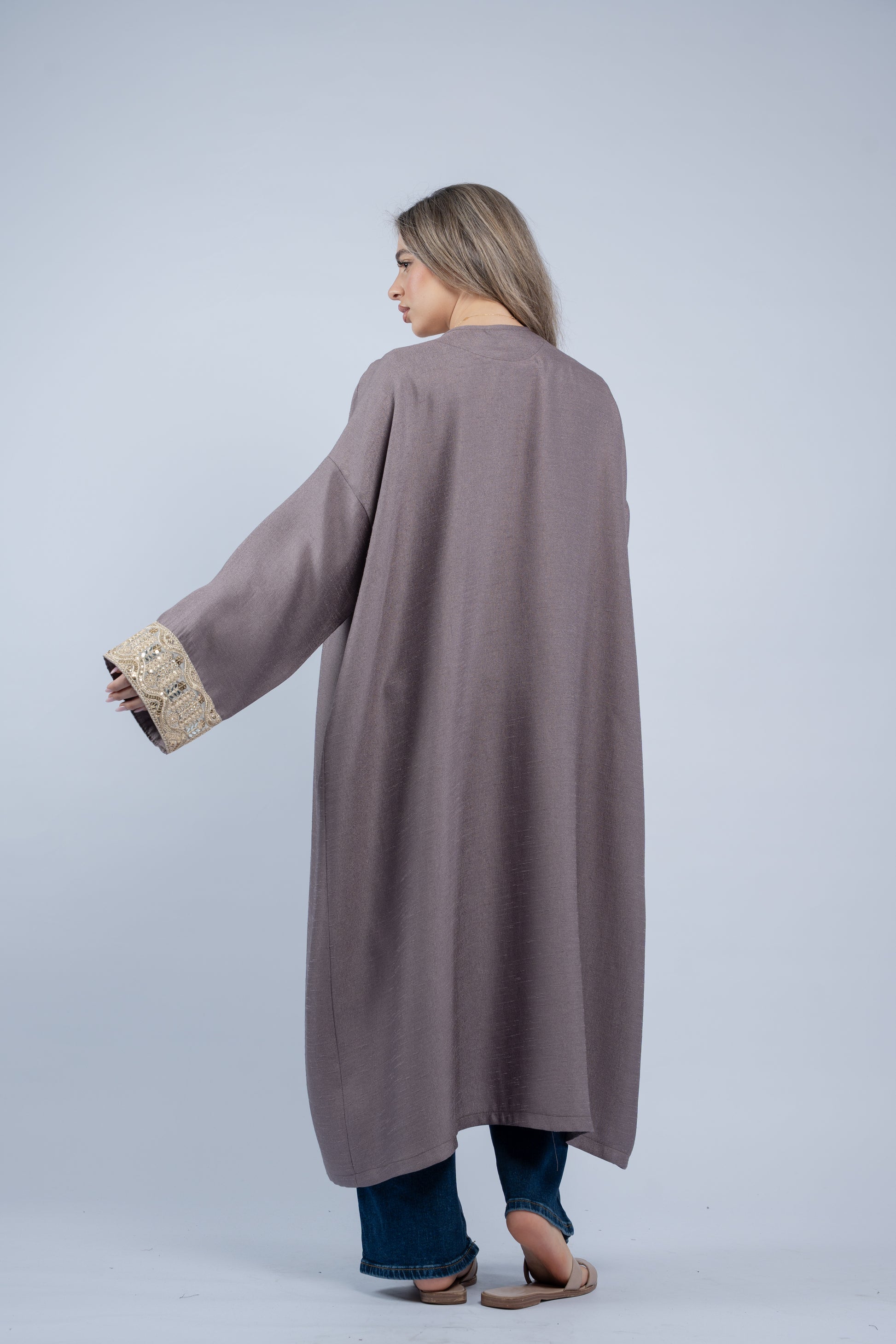 Flowy abaya finished with embroidered vine-style cuffs in soft gold tones, accented with delicate detailing.