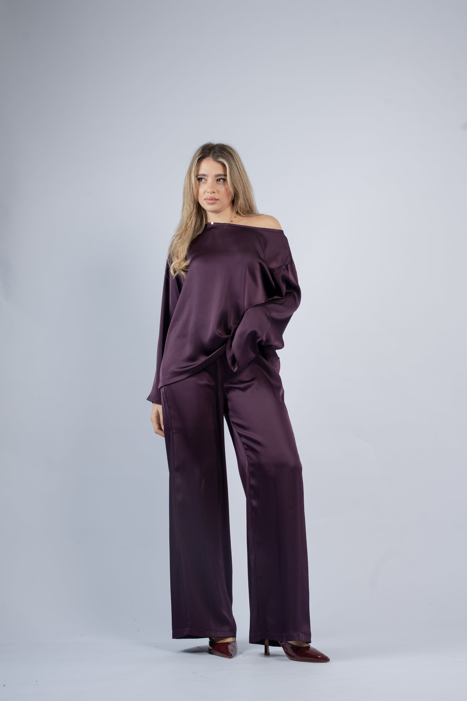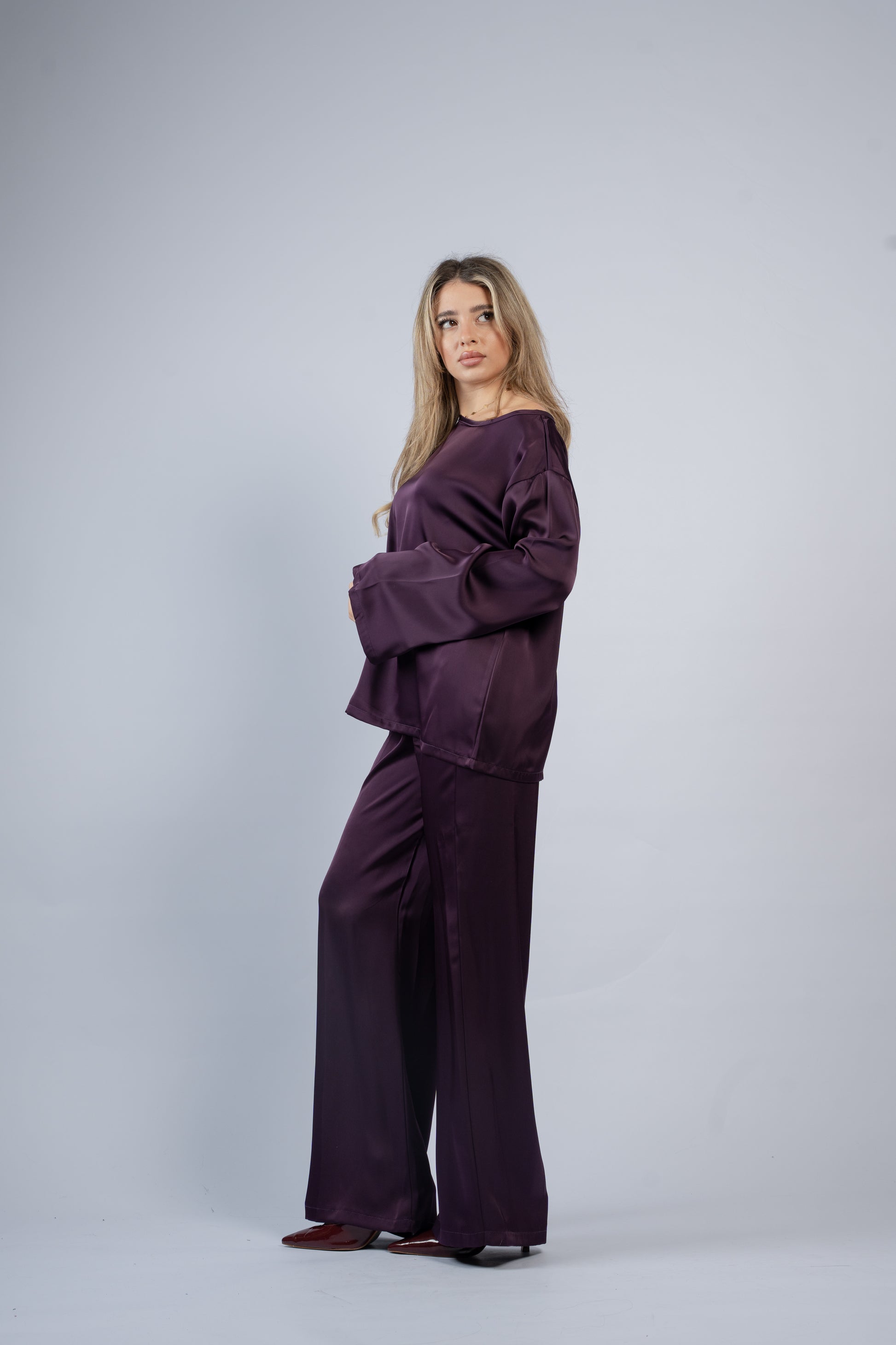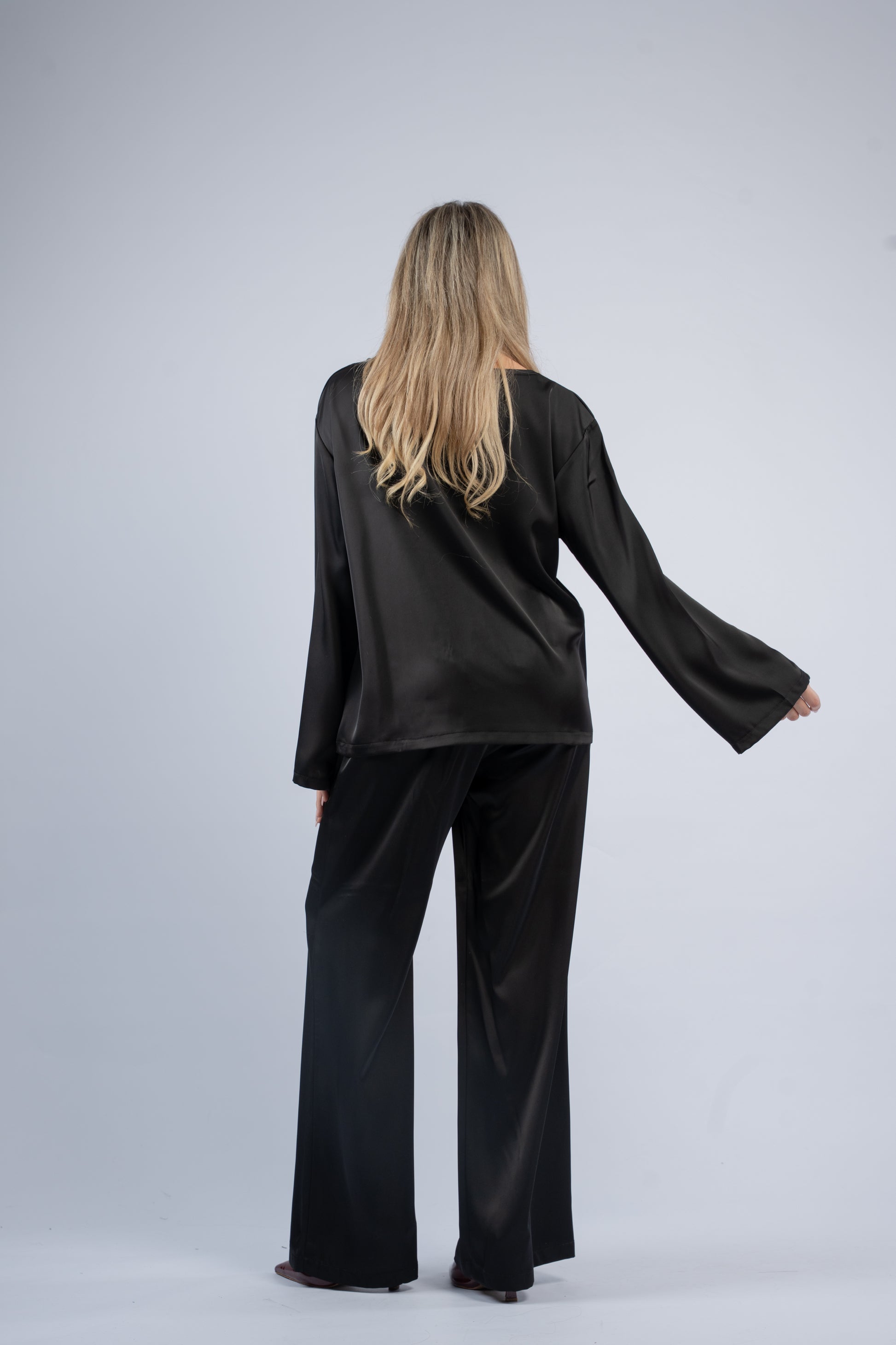 Silk set featuring an oversized top with a fluid, relaxed silhouette and matching bottoms. Crafted from a smooth, lightweight silk fabric that drapes effortlessly, offering comfort and ease while maintaining an elegant look.