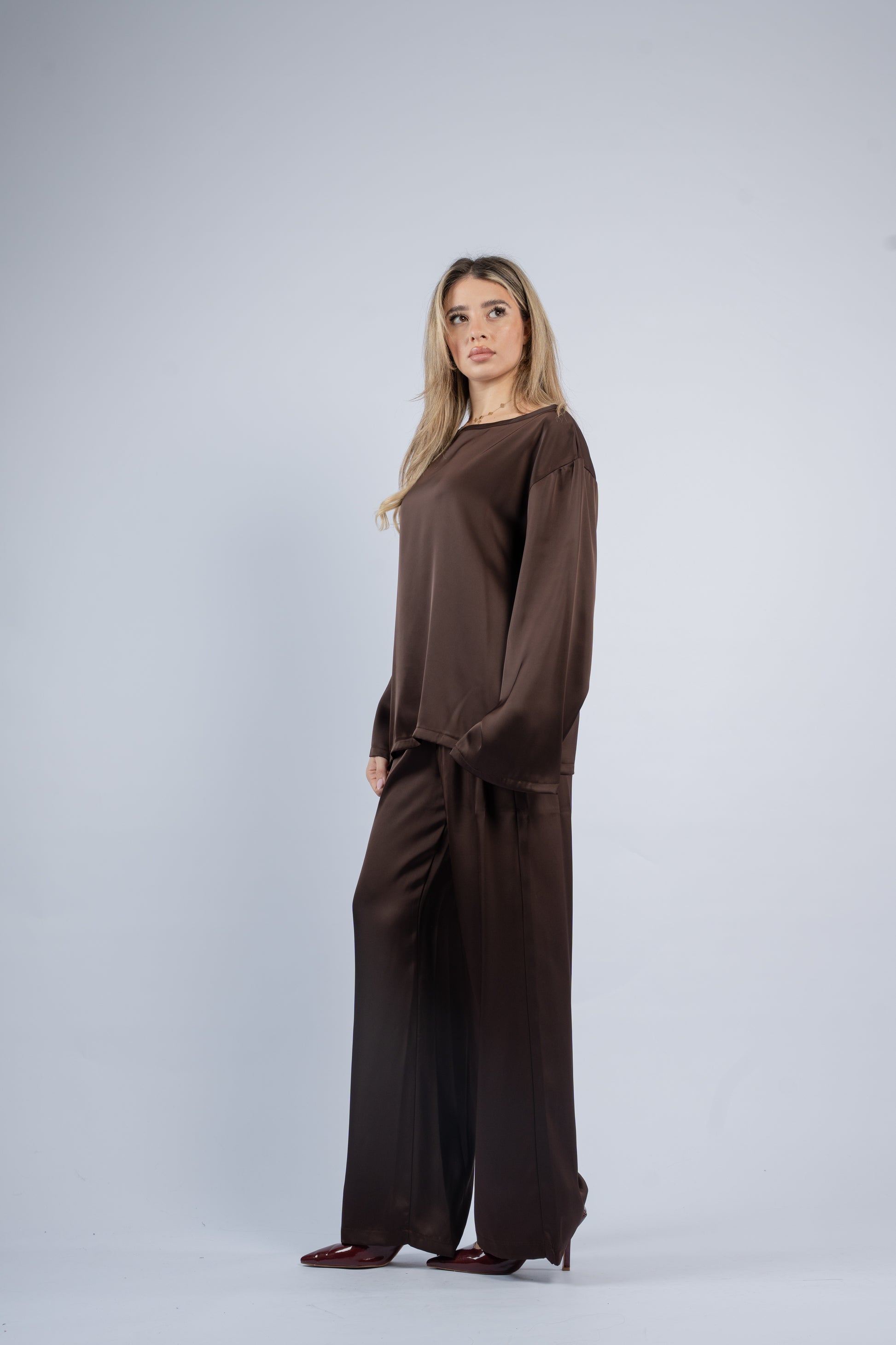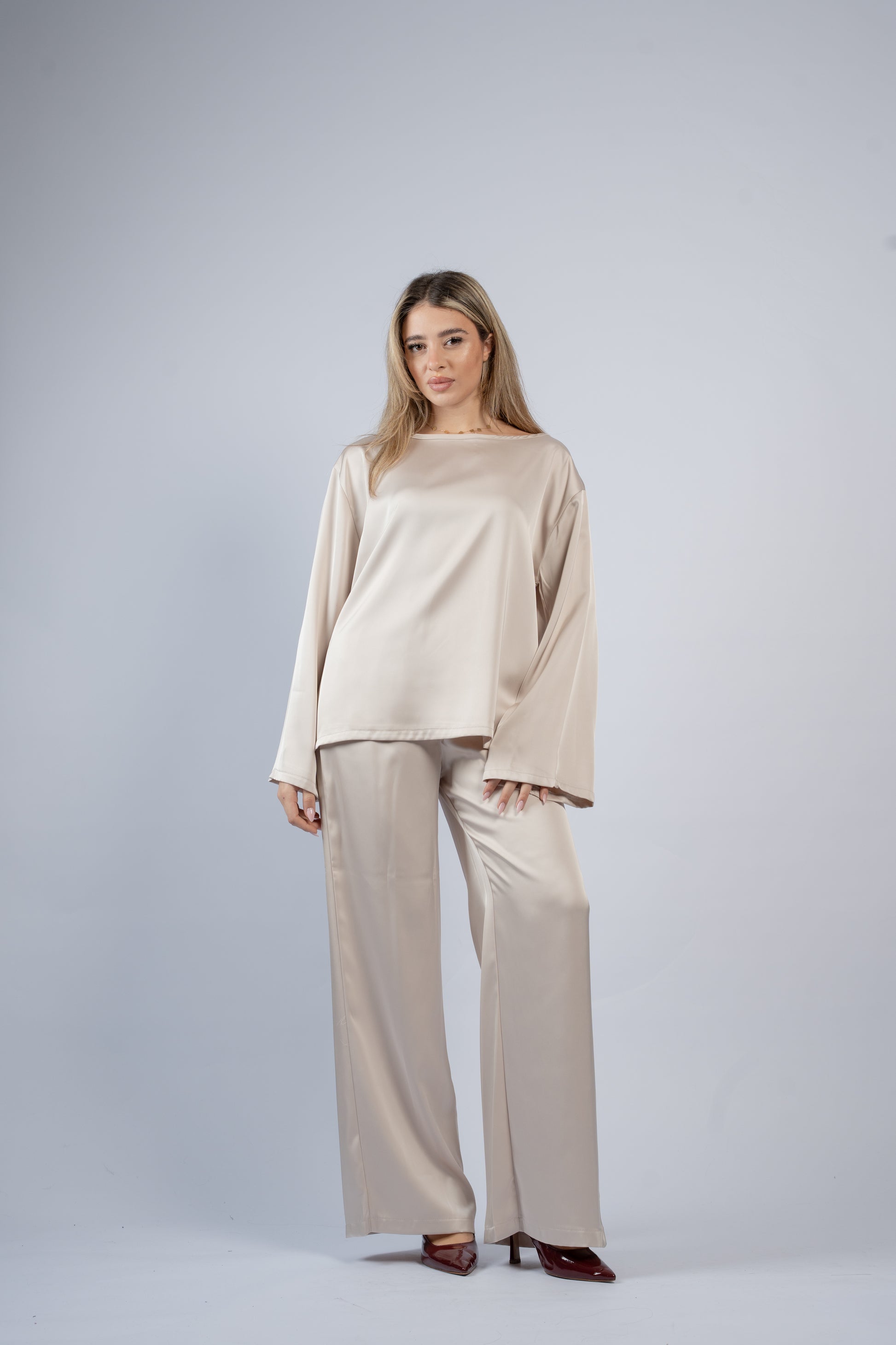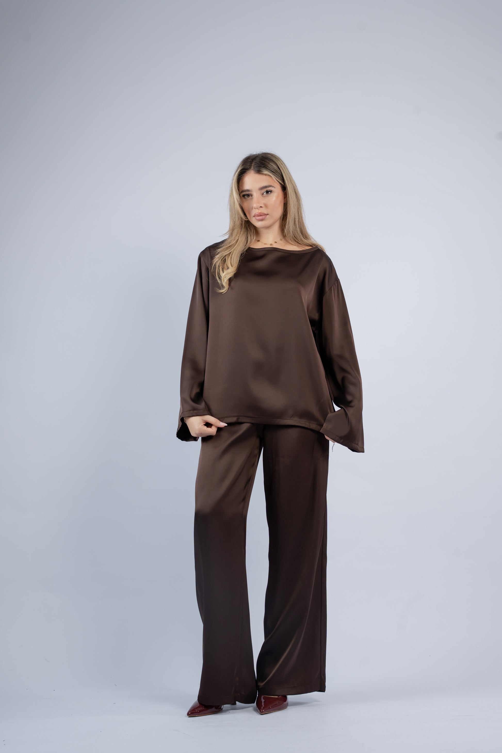 Silk set featuring an oversized top with a fluid, relaxed silhouette and matching bottoms. Crafted from a smooth, lightweight silk fabric that drapes effortlessly, offering comfort and ease while maintaining an elegant look.