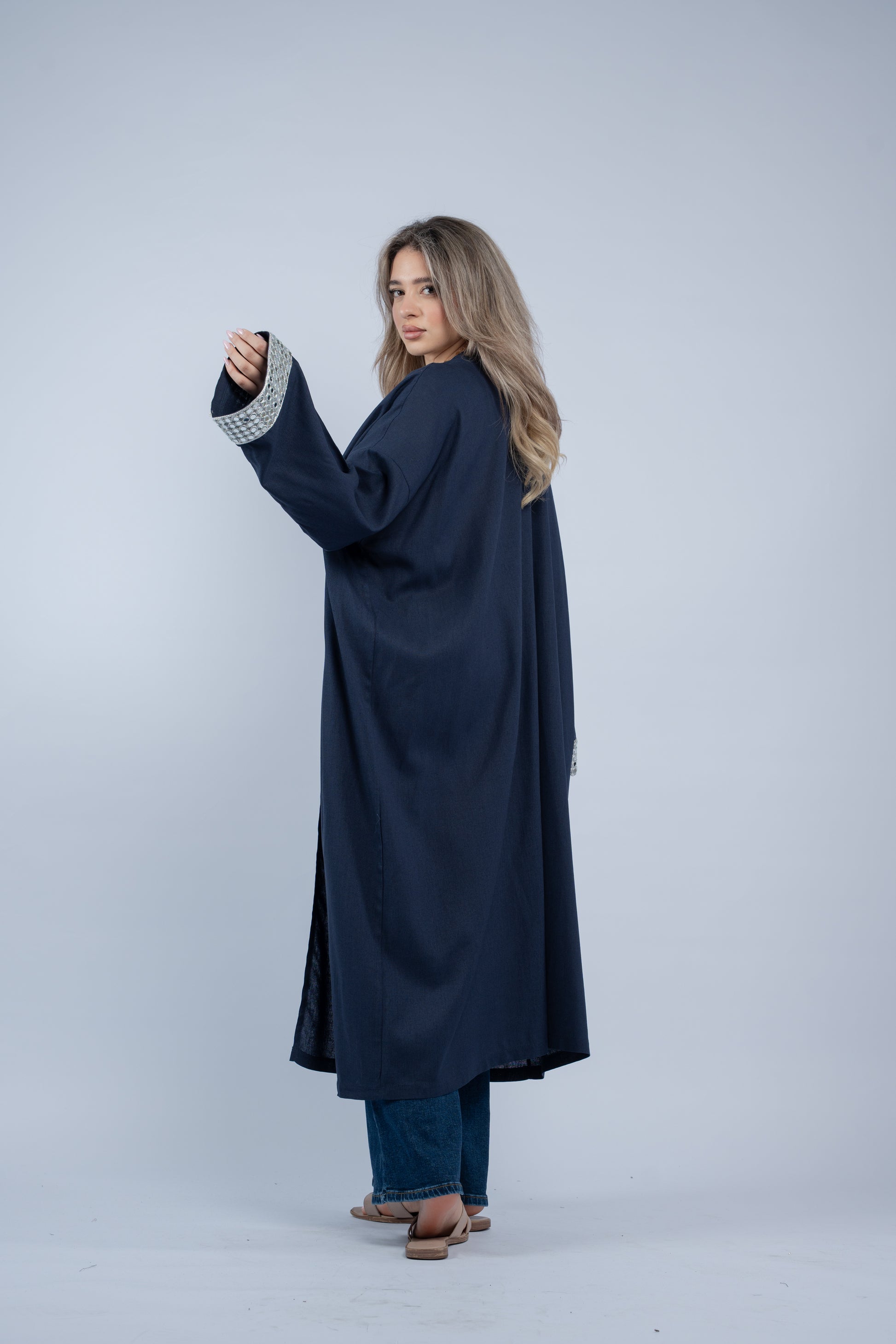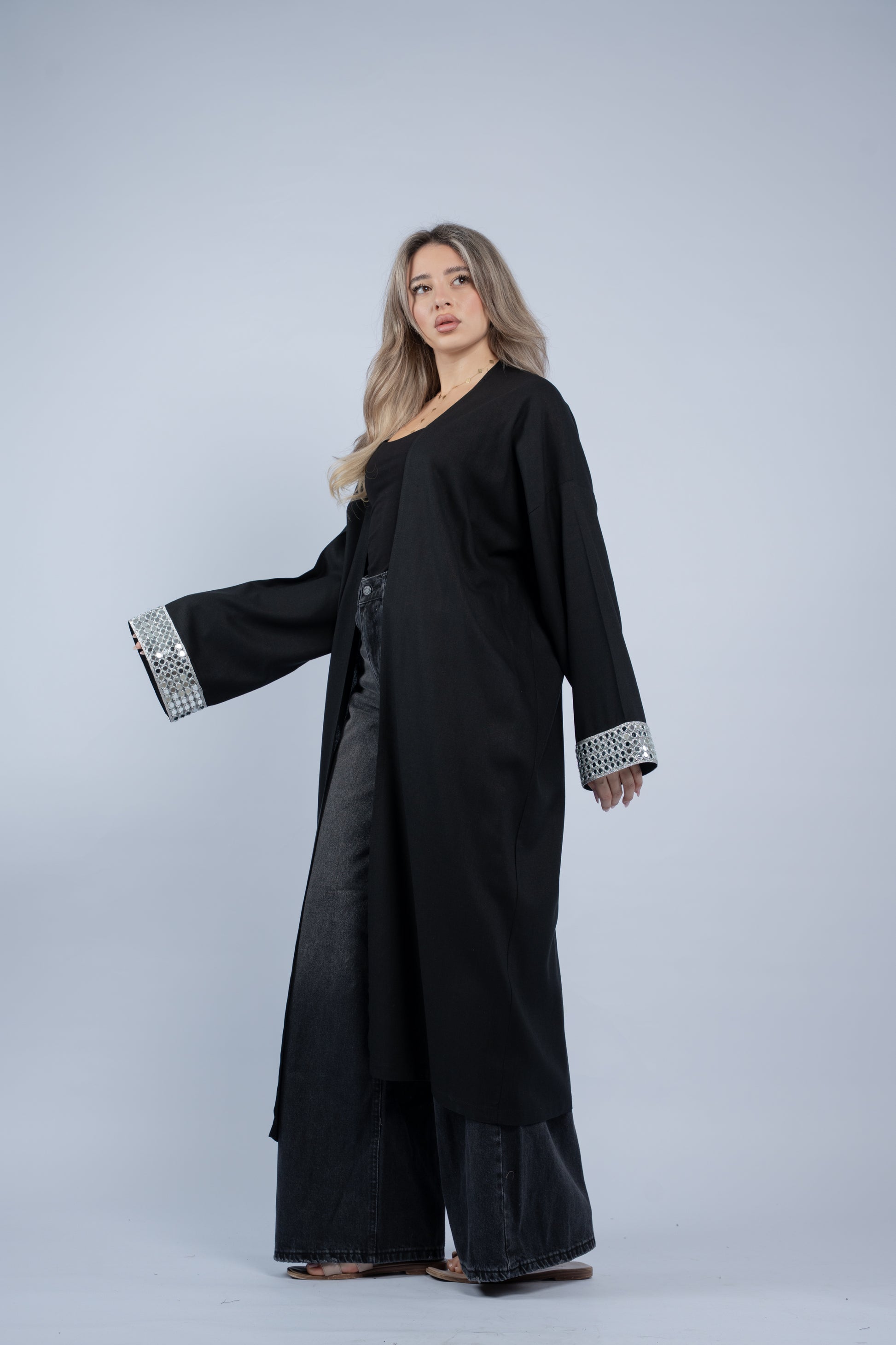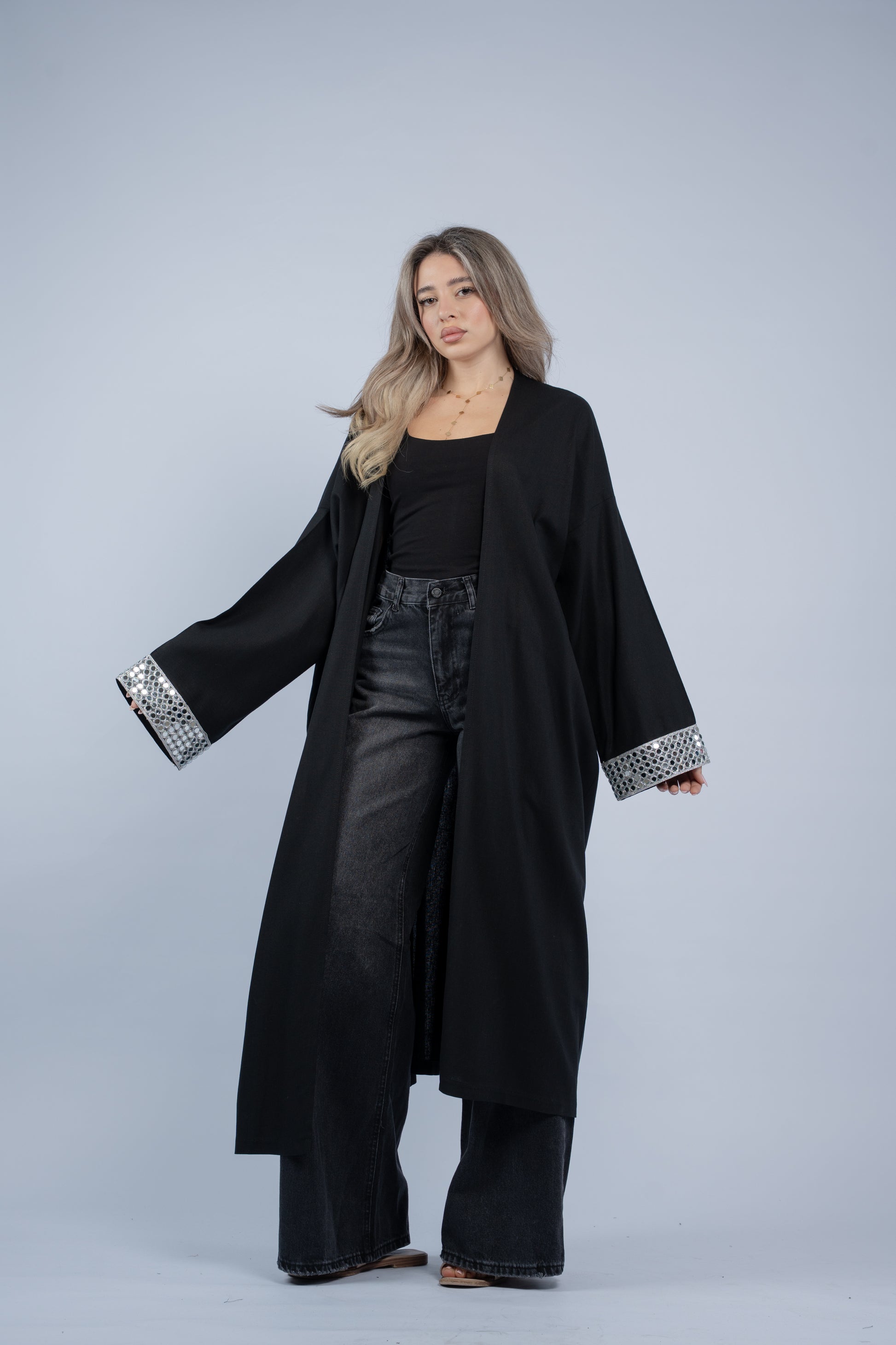 Flowy abaya with wide sleeves and a statement silver mirror-style cuff.