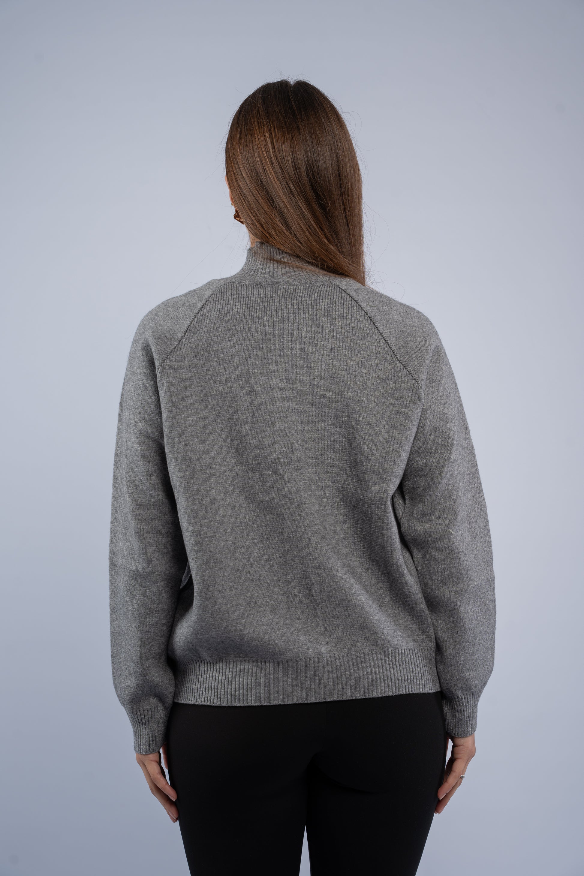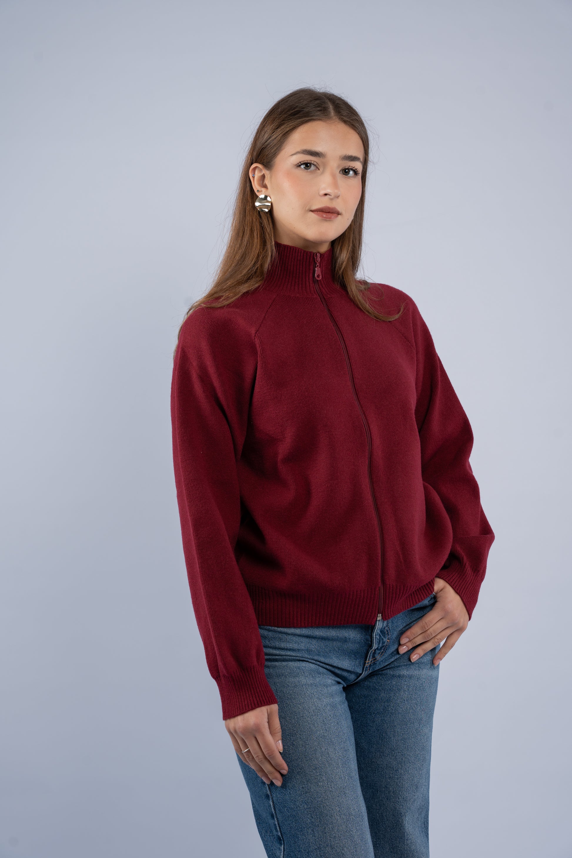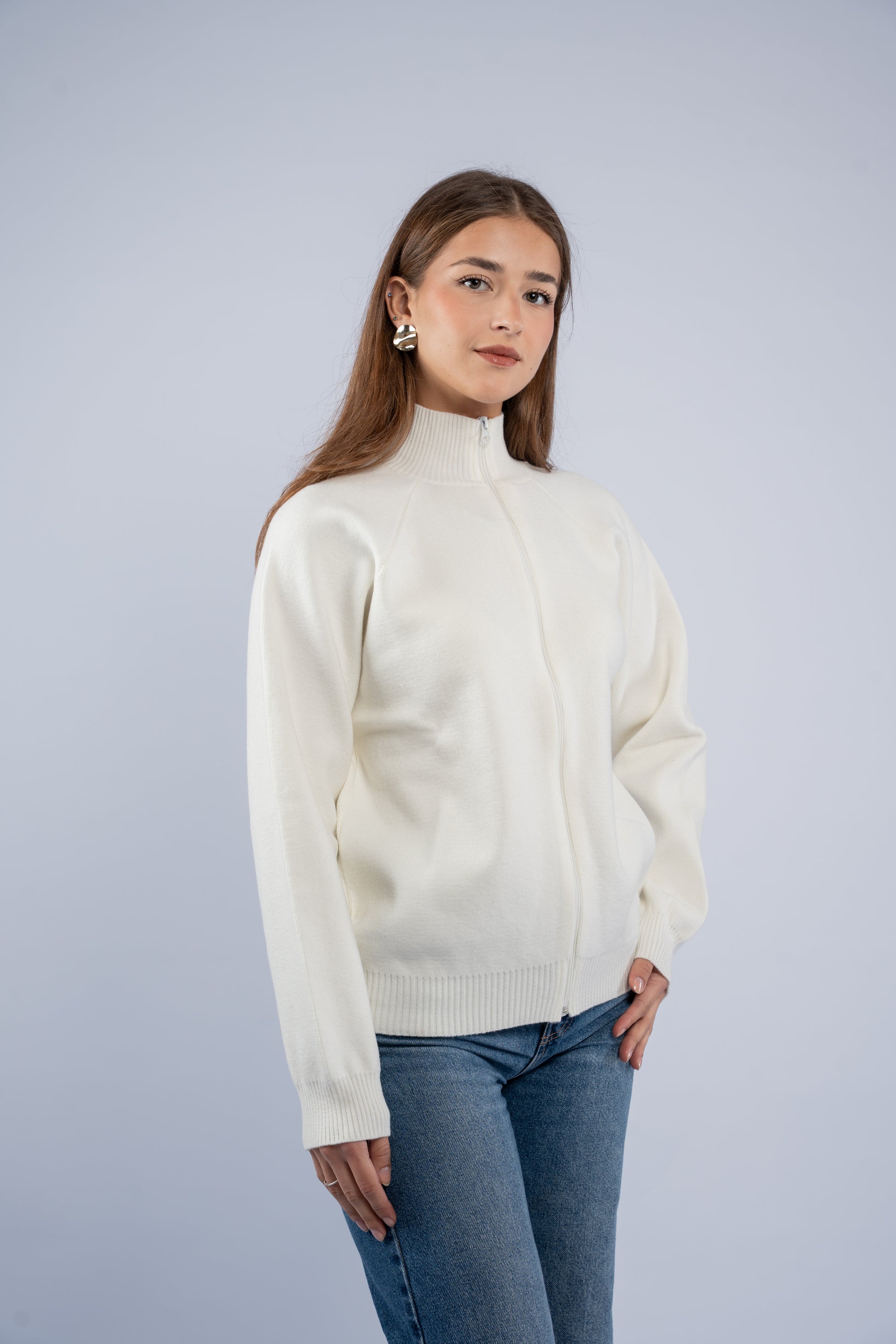 Knit jacket with a front zipper and a structured yet comfortable fit. Soft texture, clean finish, and easy to layer.