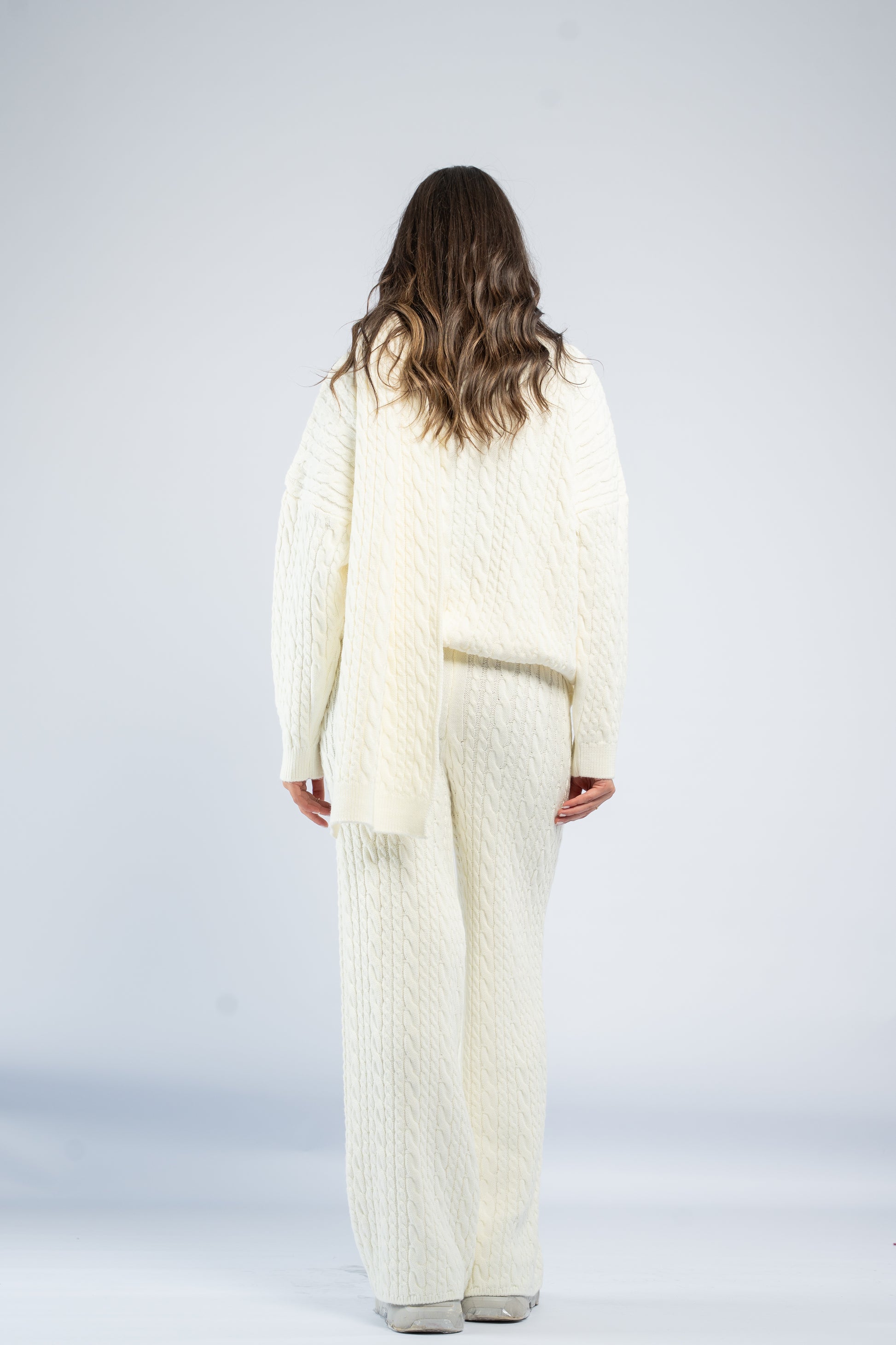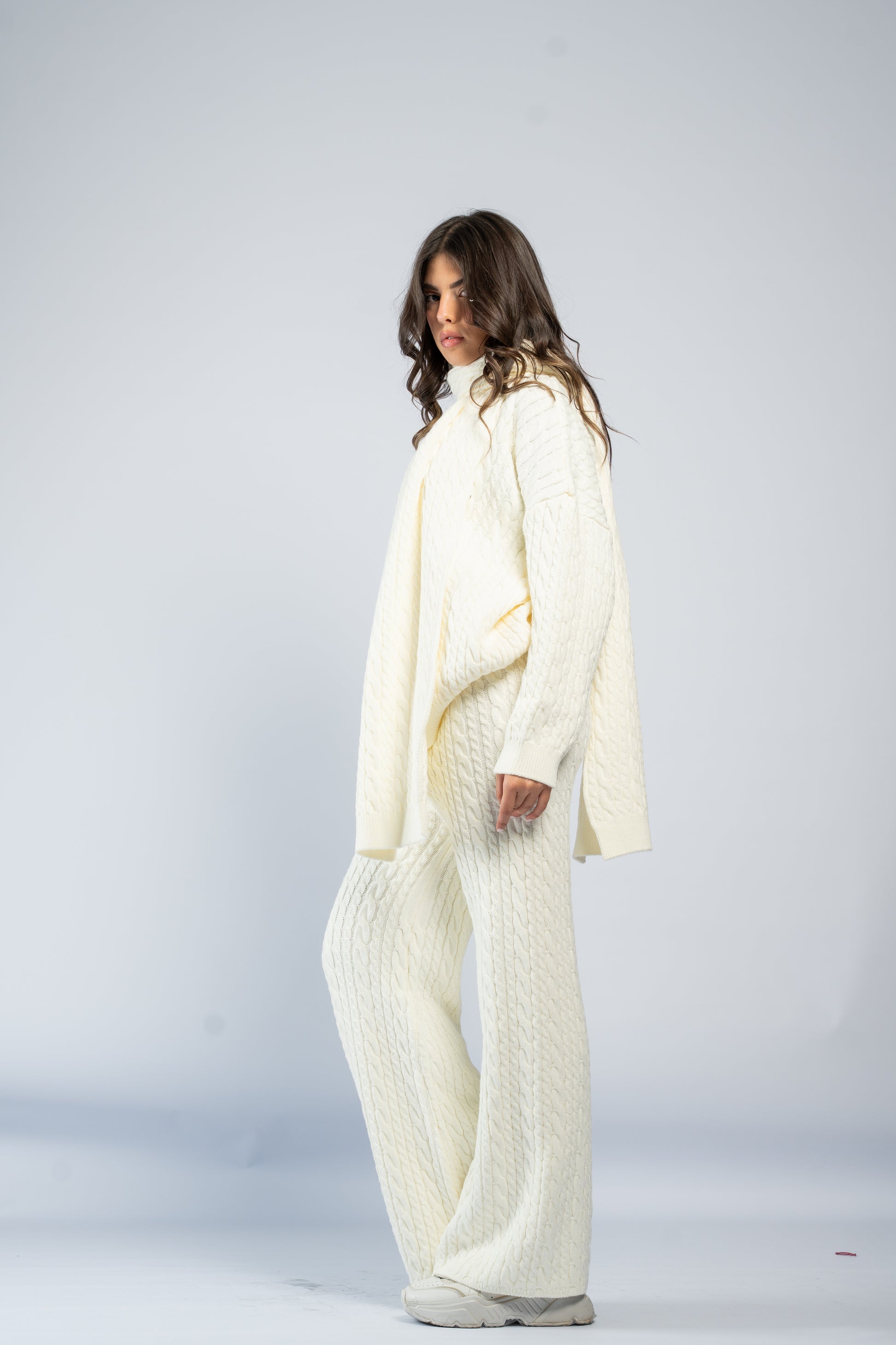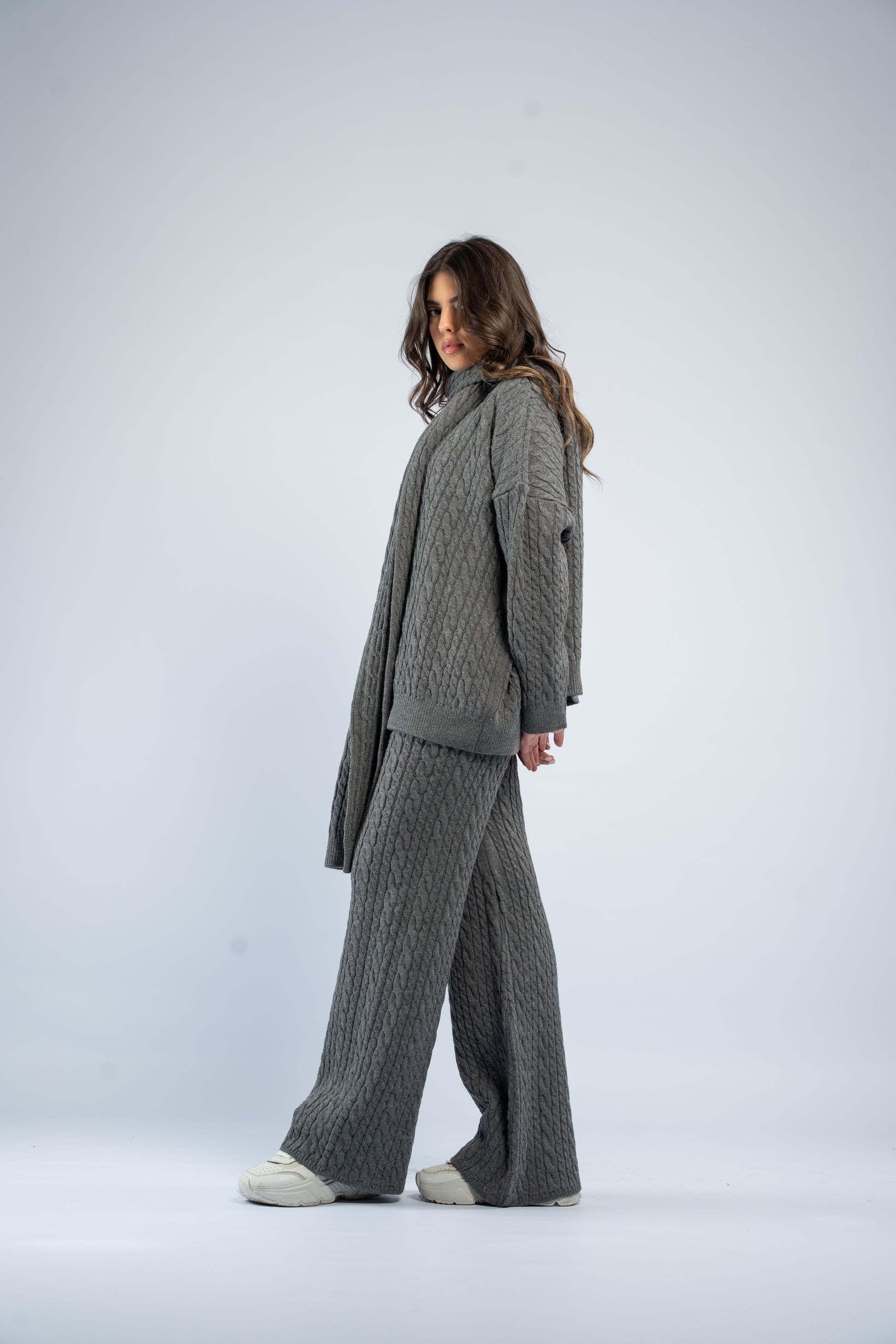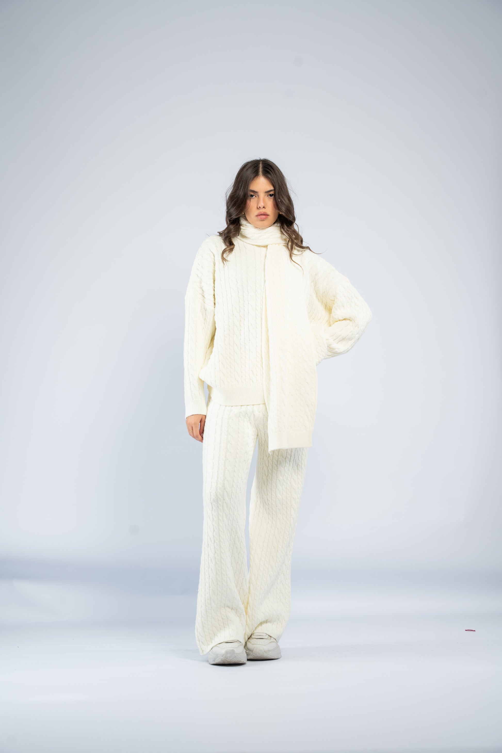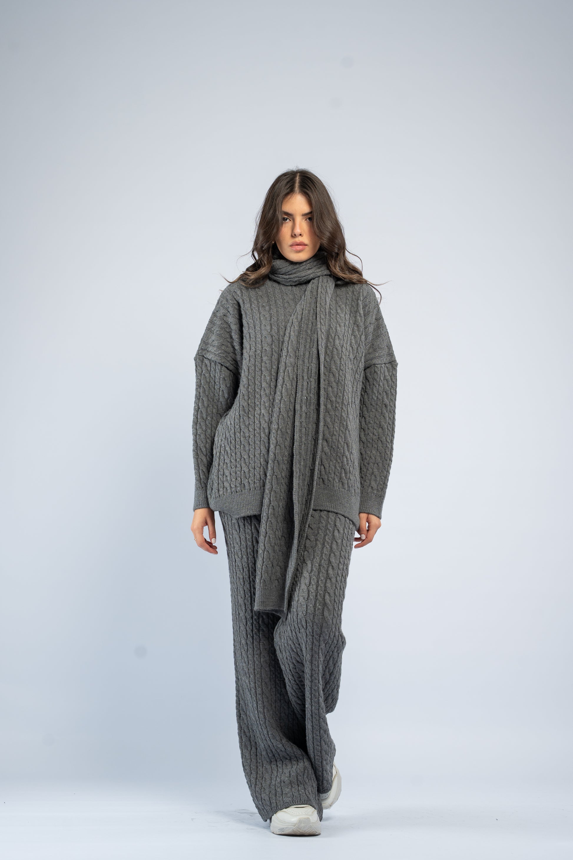 Braided wool set including a knit top, matching pants, and a coordinating scarf. Soft, warm, and comfortable with a textured braided finish.