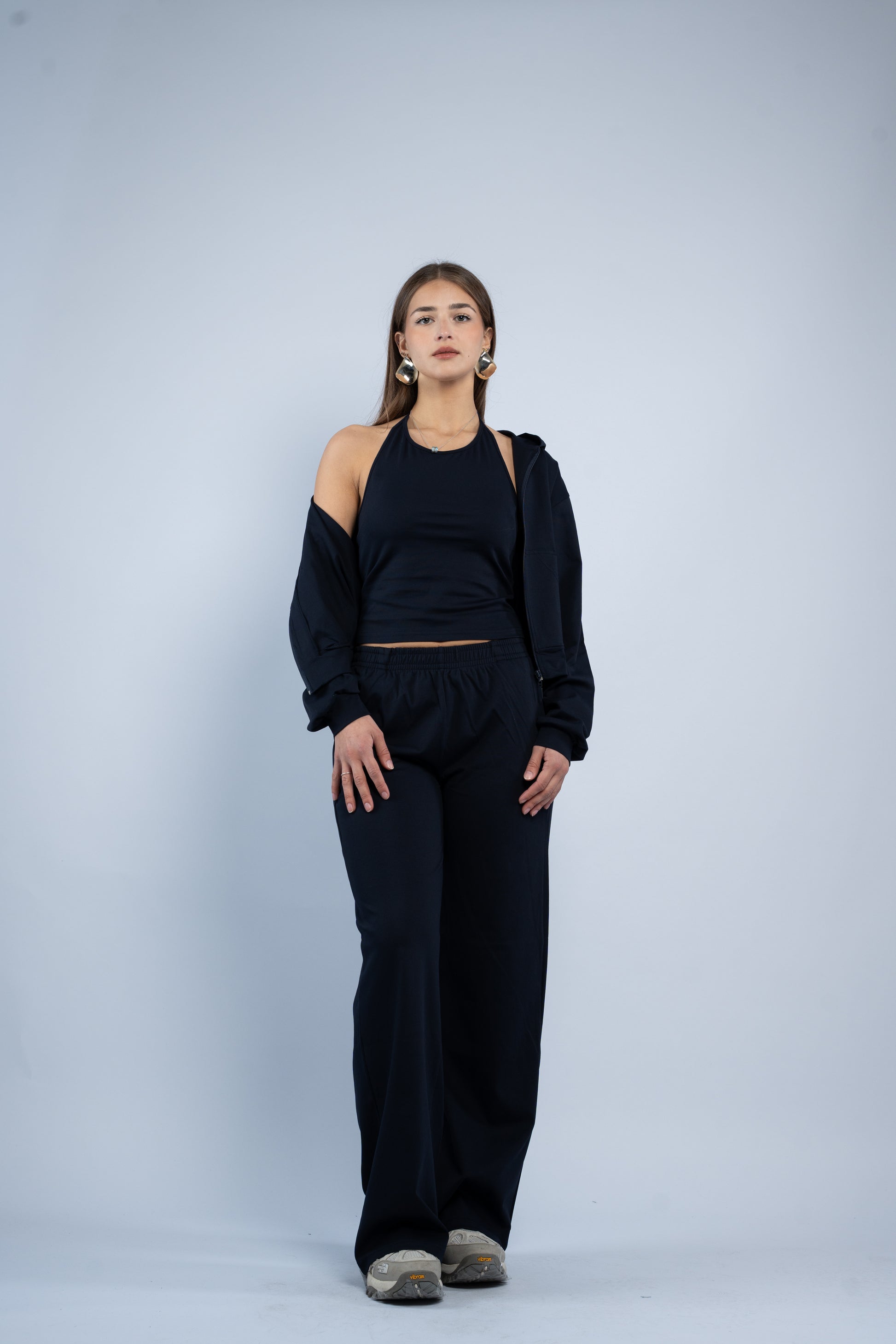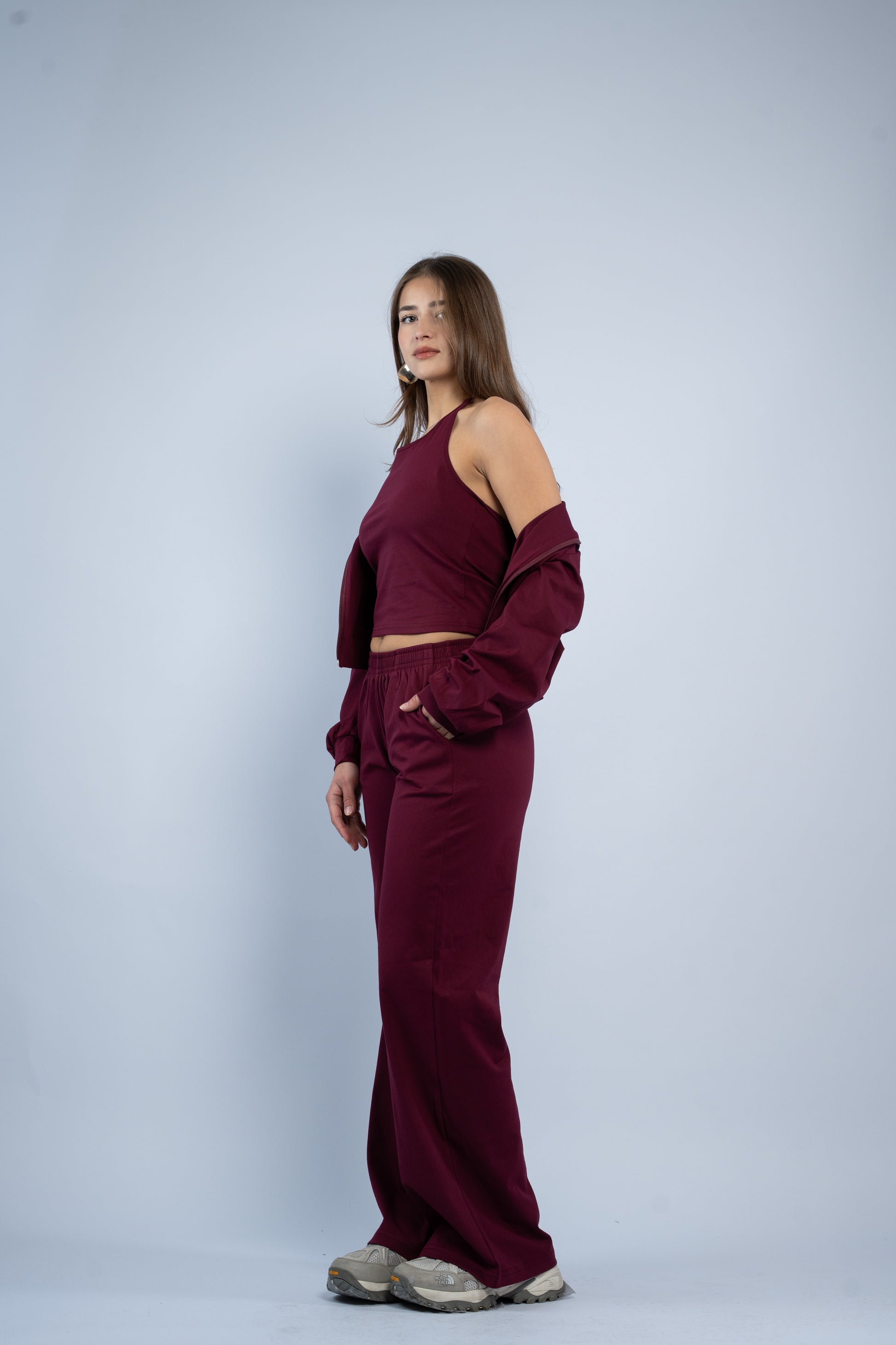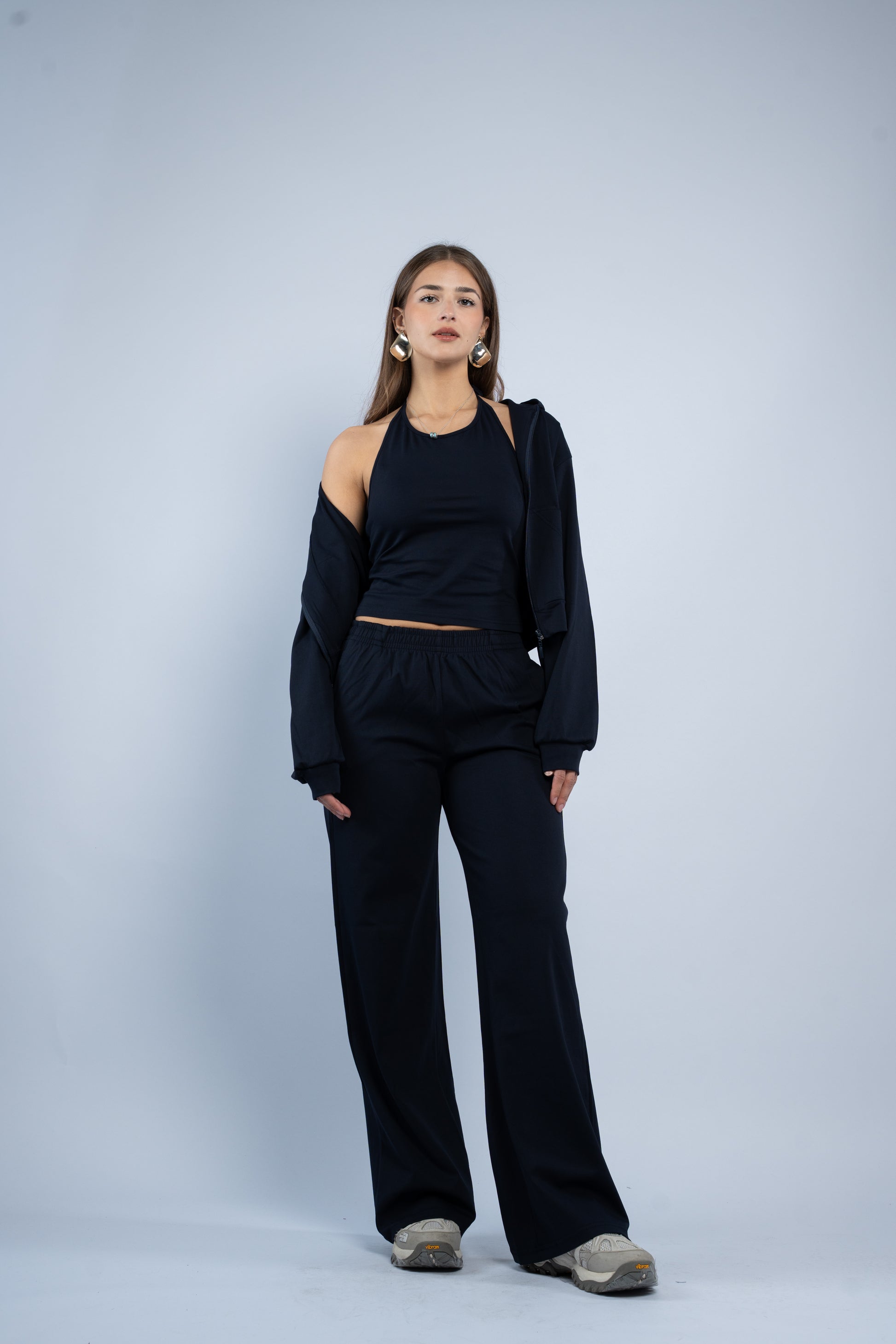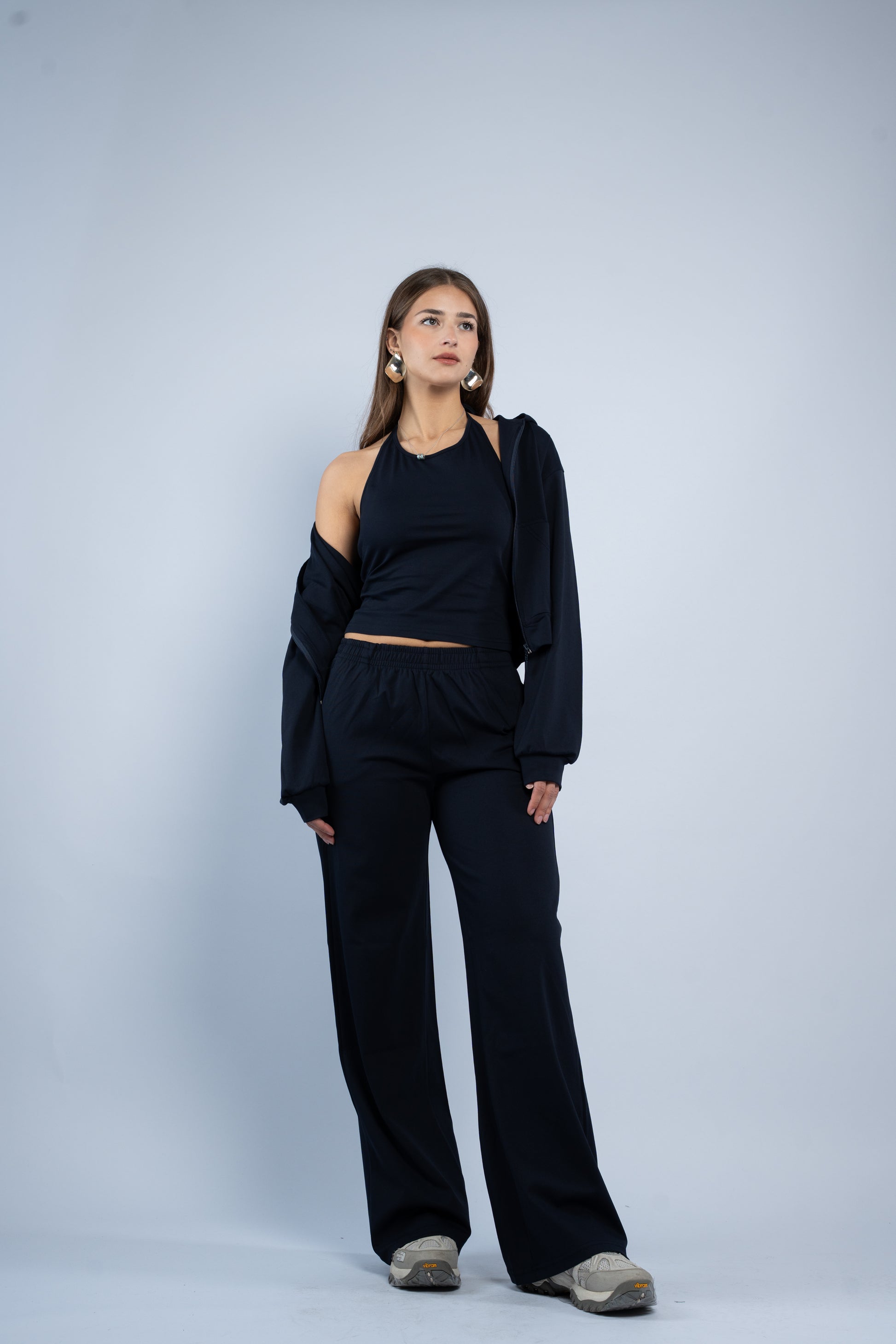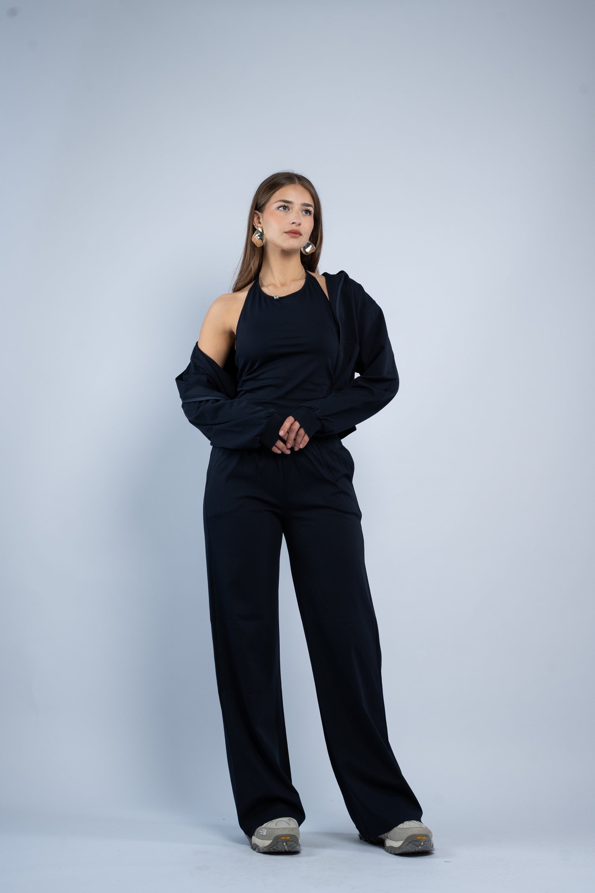 A versatile three-piece set designed for effortless styling. Featuring a sleek halter top, relaxed wide-leg trousers, and a lightweight layering jacket, all crafted in smooth modal fabric for a soft feel.