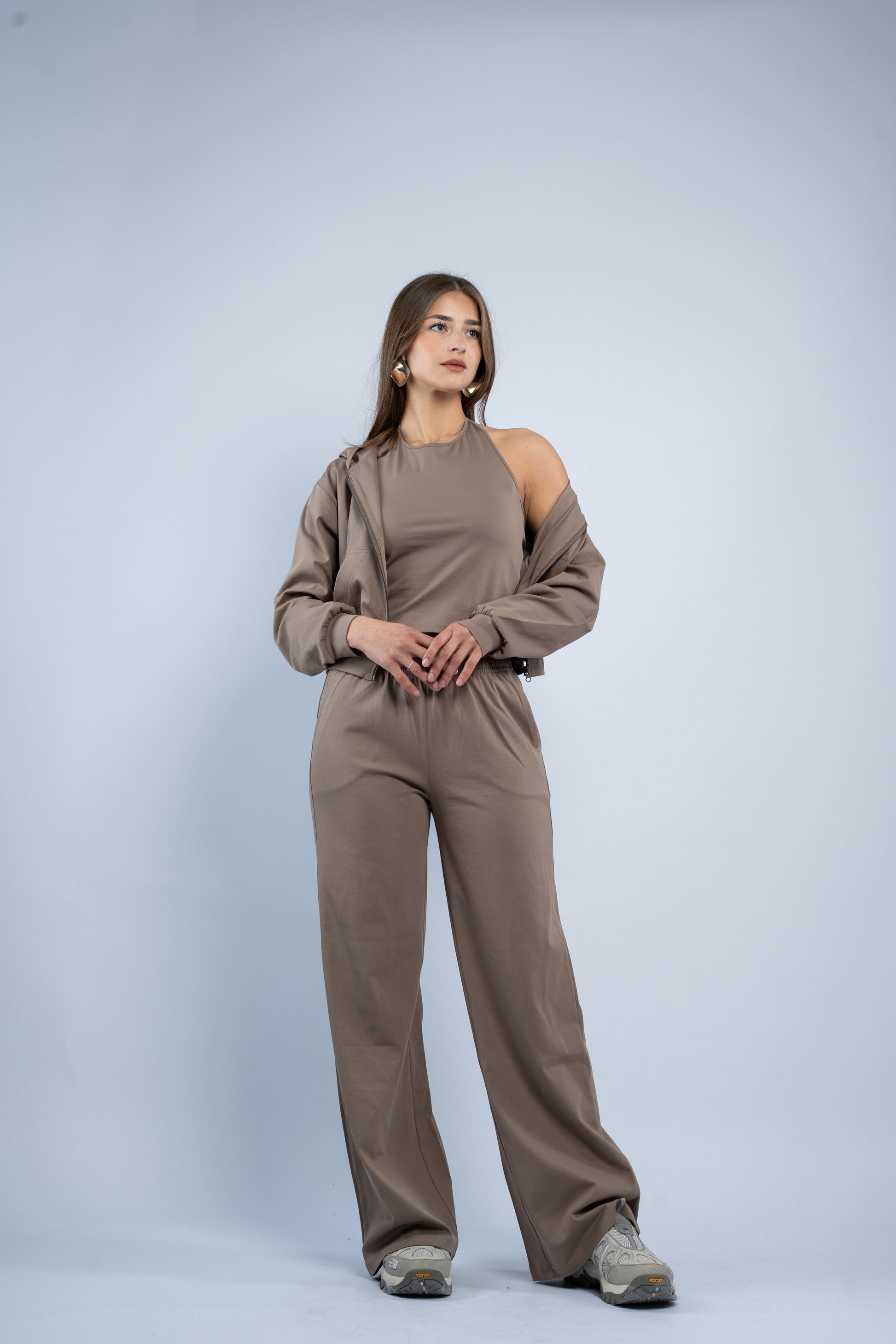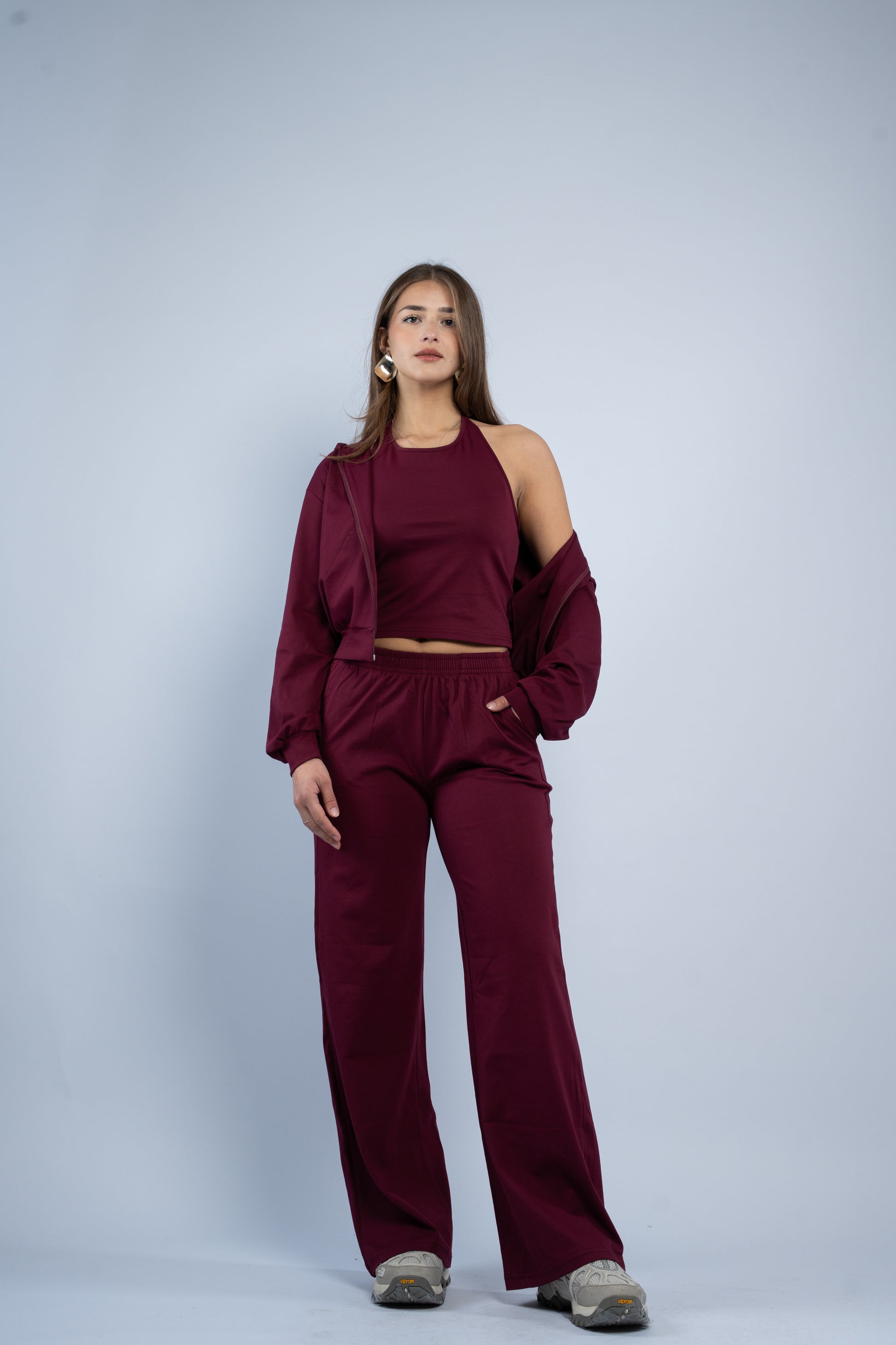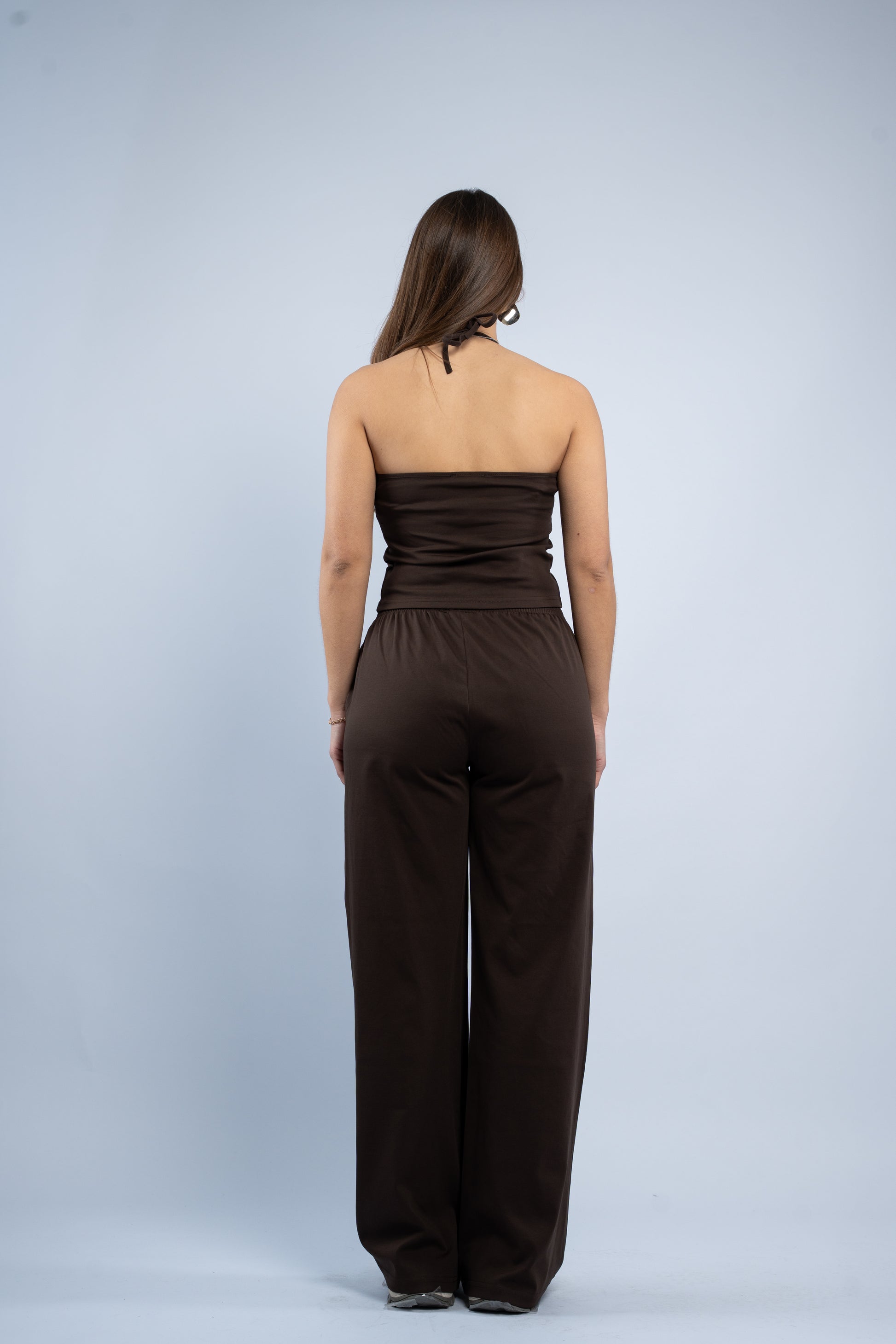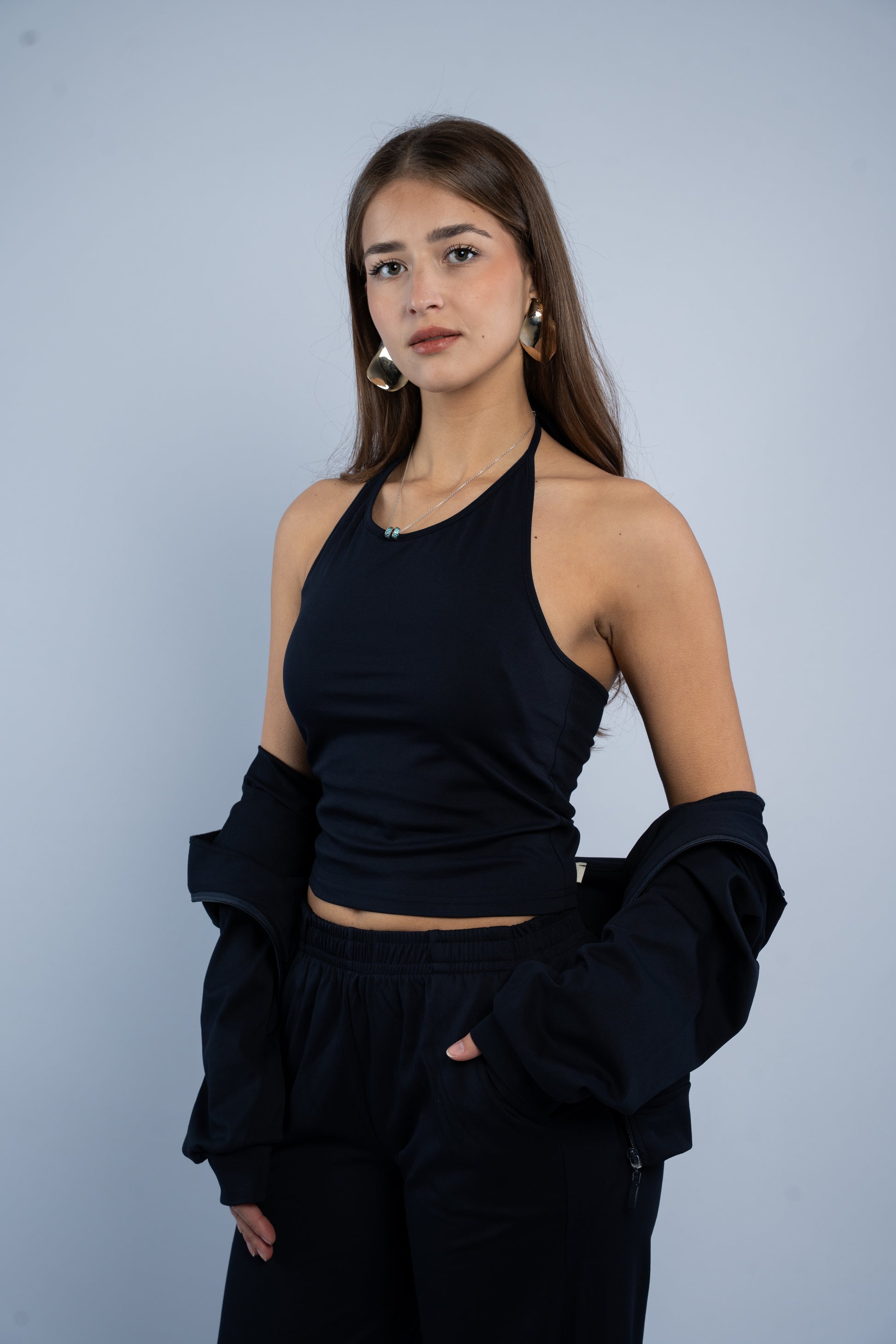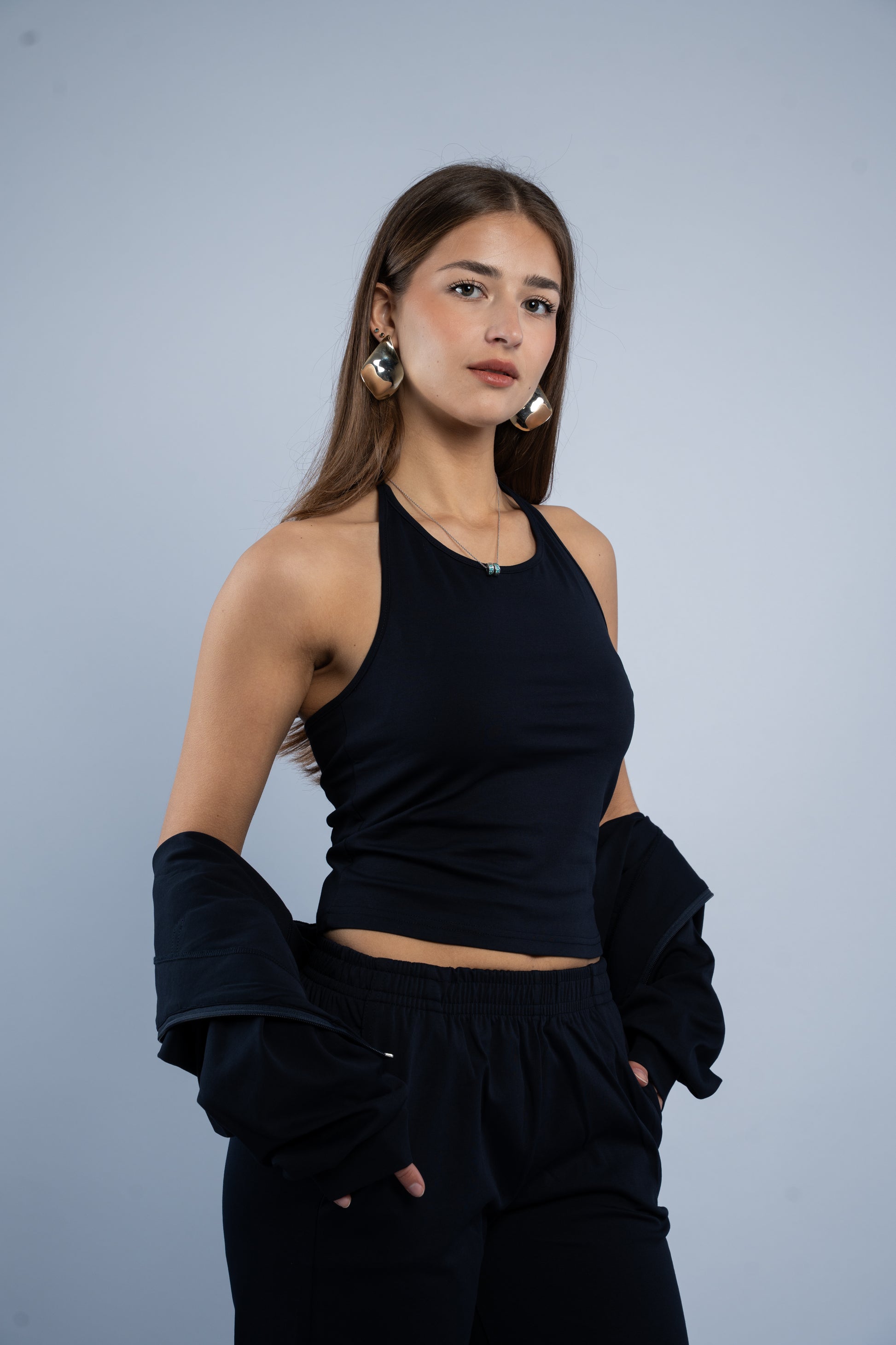 A versatile three-piece set designed for effortless styling. Featuring a sleek halter top, relaxed wide-leg trousers, and a lightweight layering jacket, all crafted in smooth modal fabric for a soft feel.