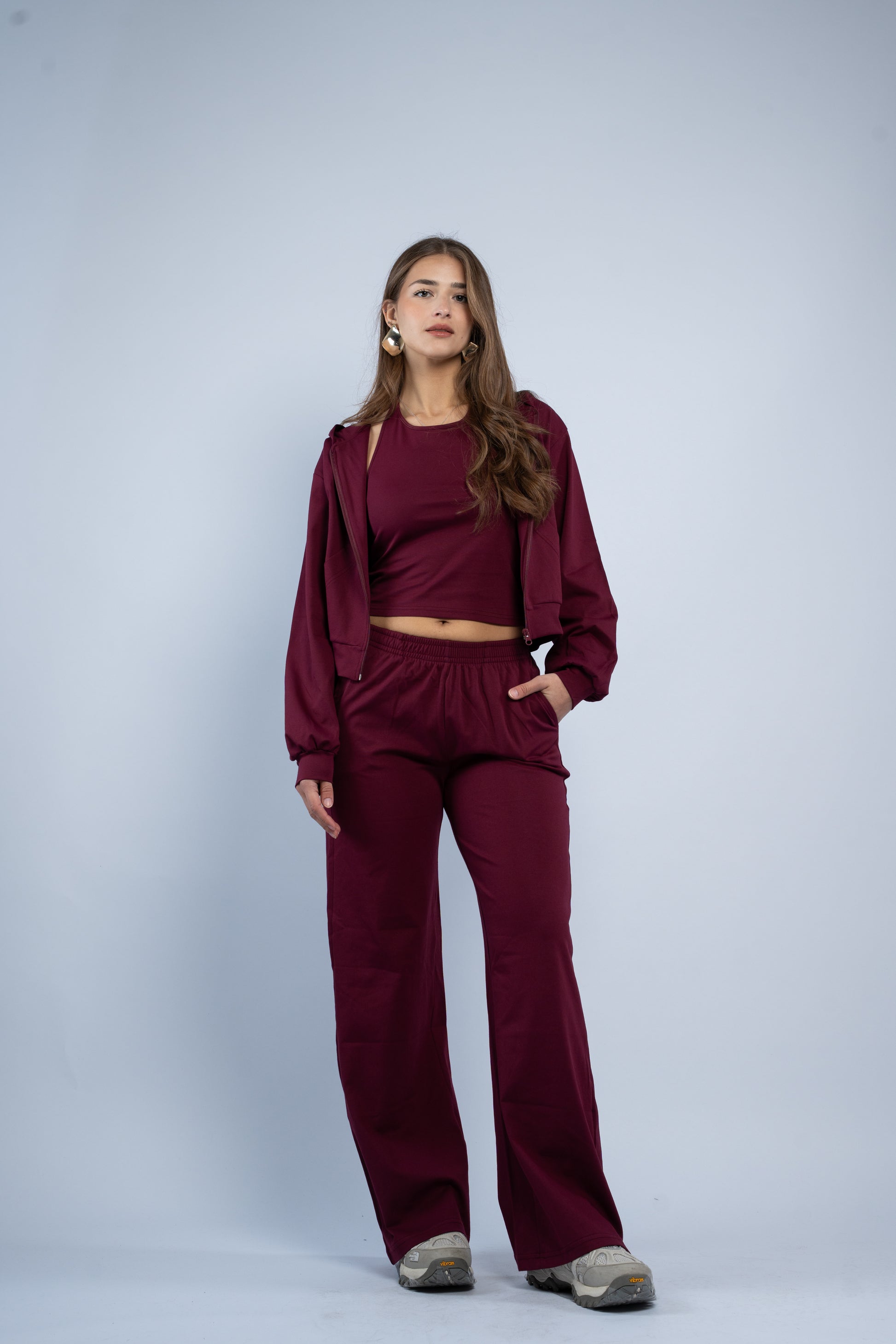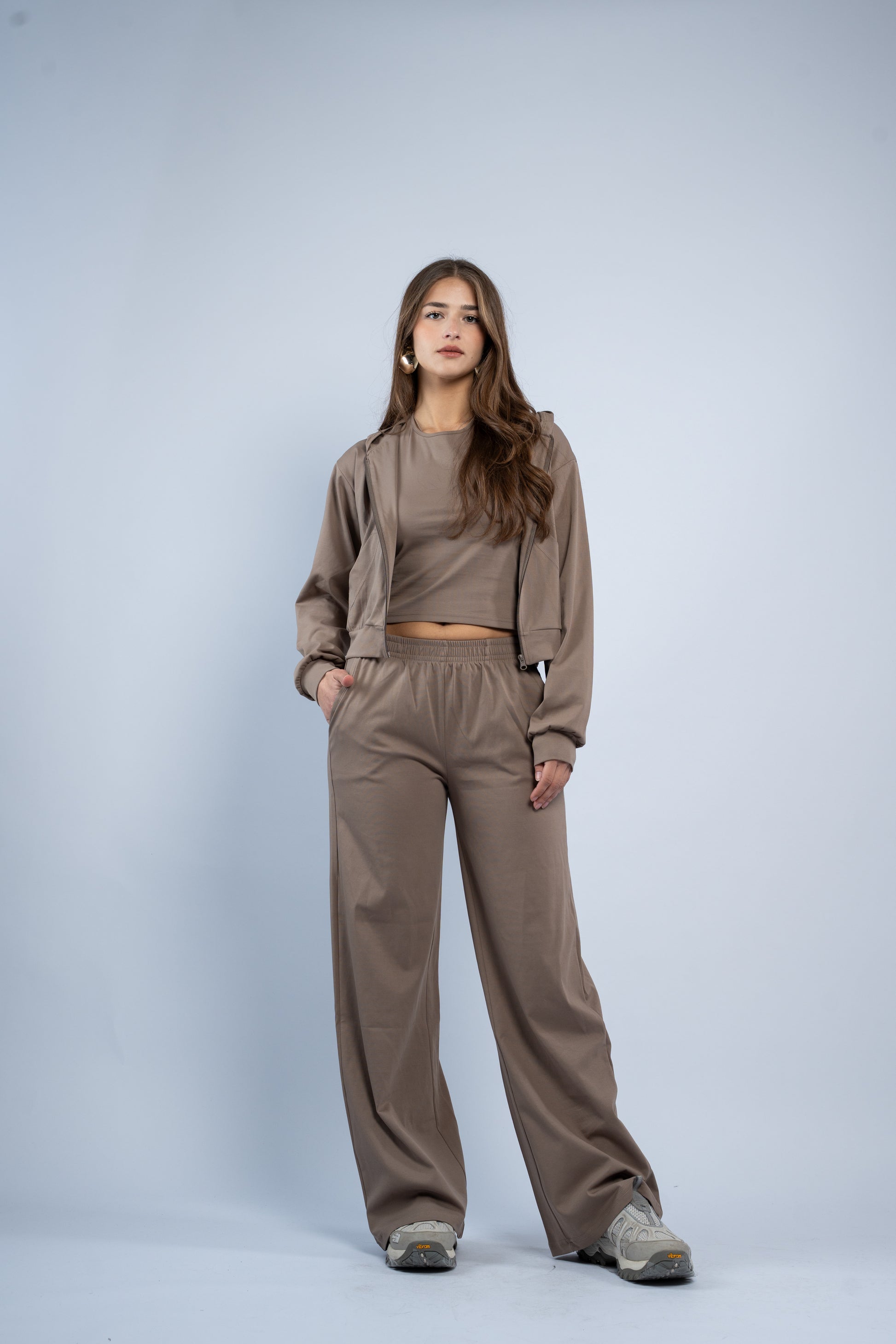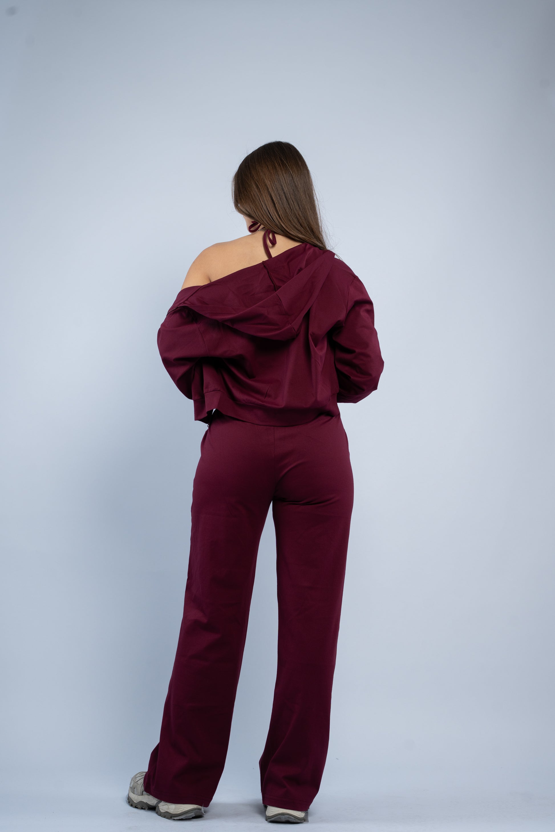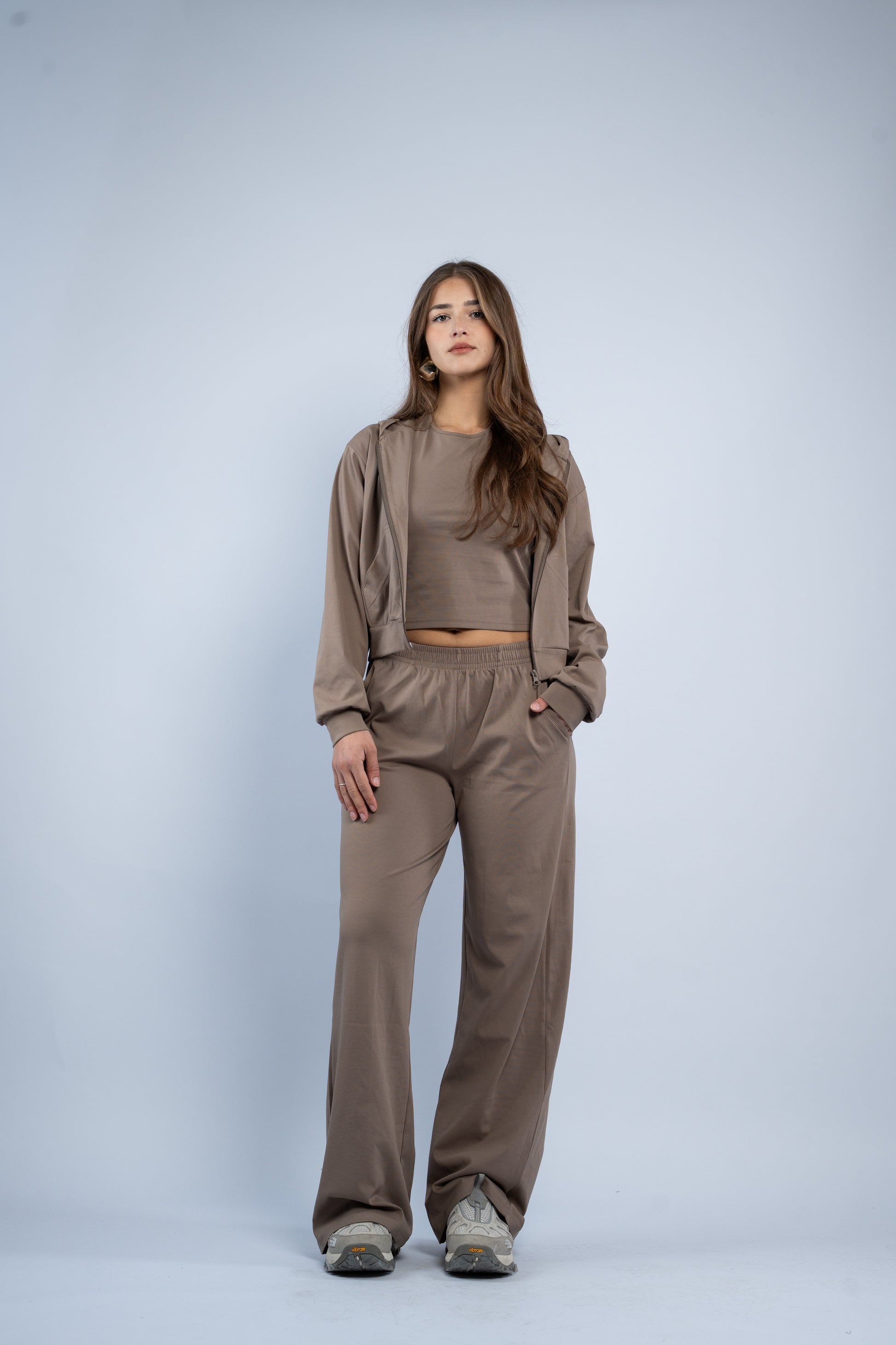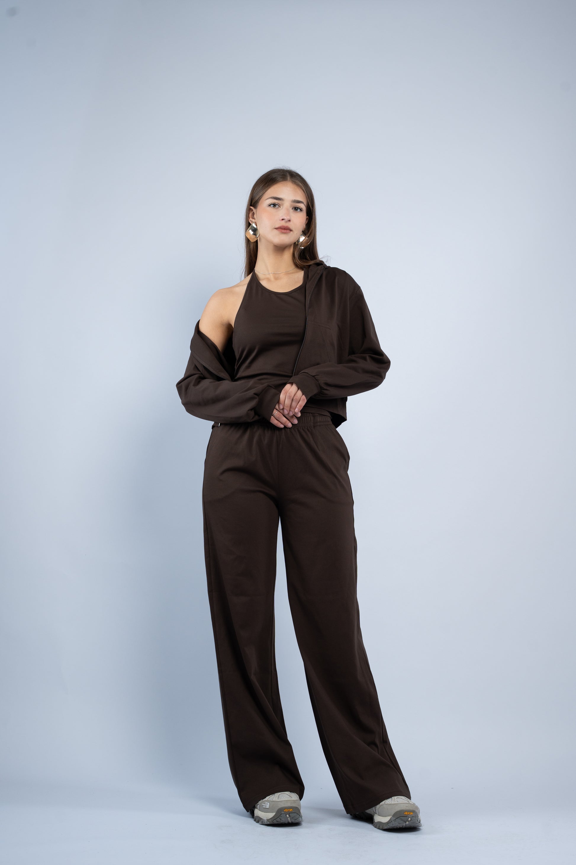 A versatile three-piece set designed for effortless styling. Featuring a sleek halter top, relaxed wide-leg trousers, and a lightweight layering jacket, all crafted in smooth modal fabric for a soft feel.