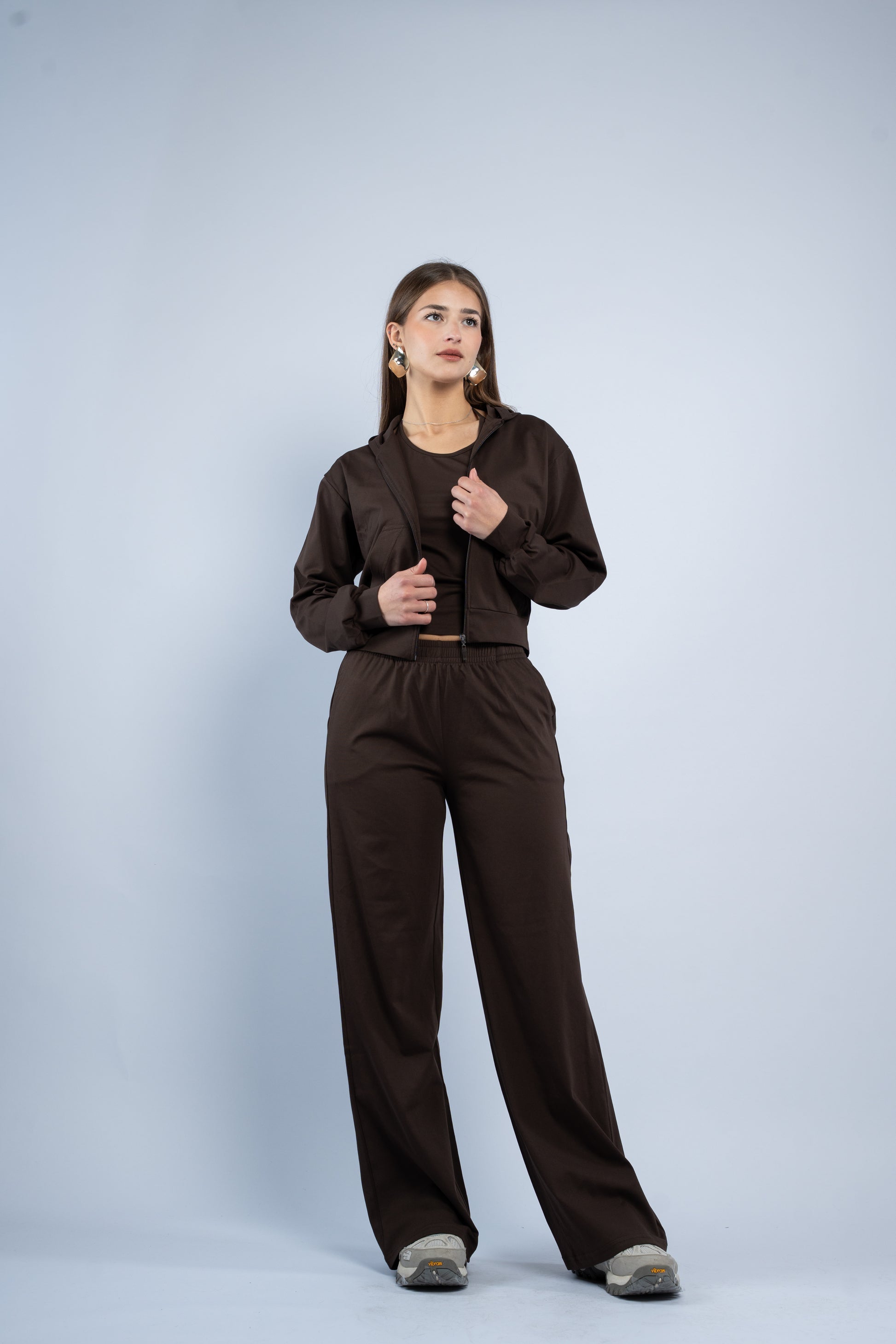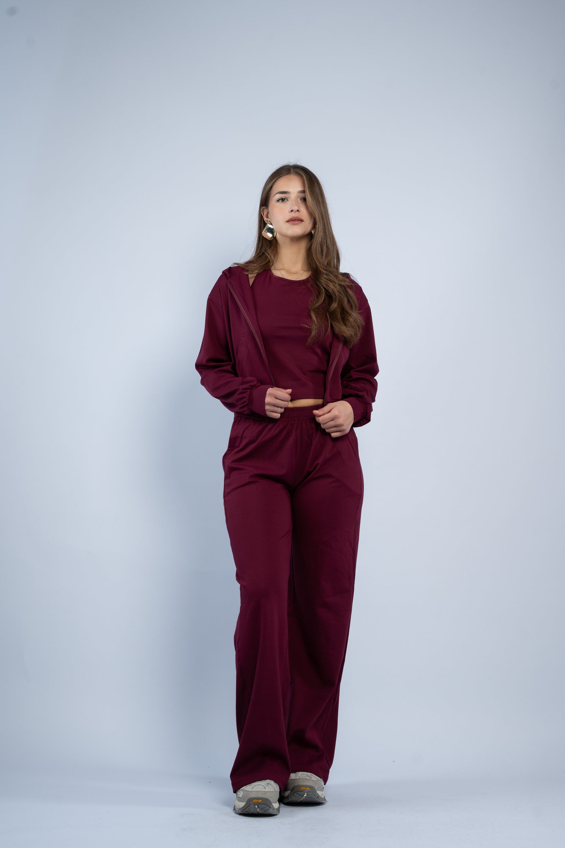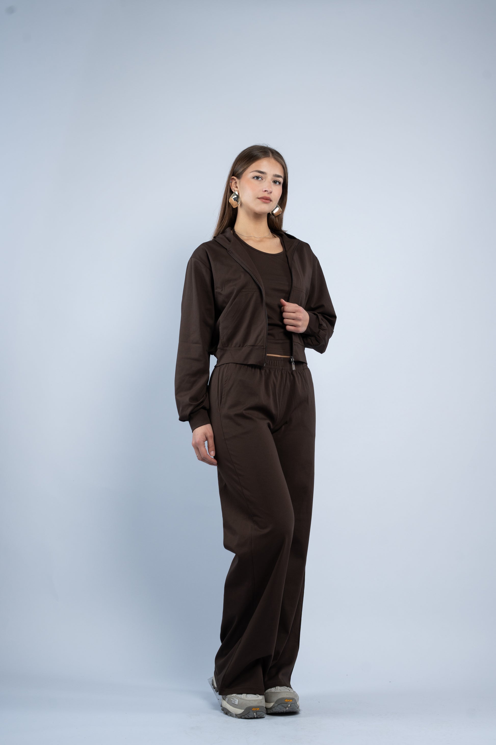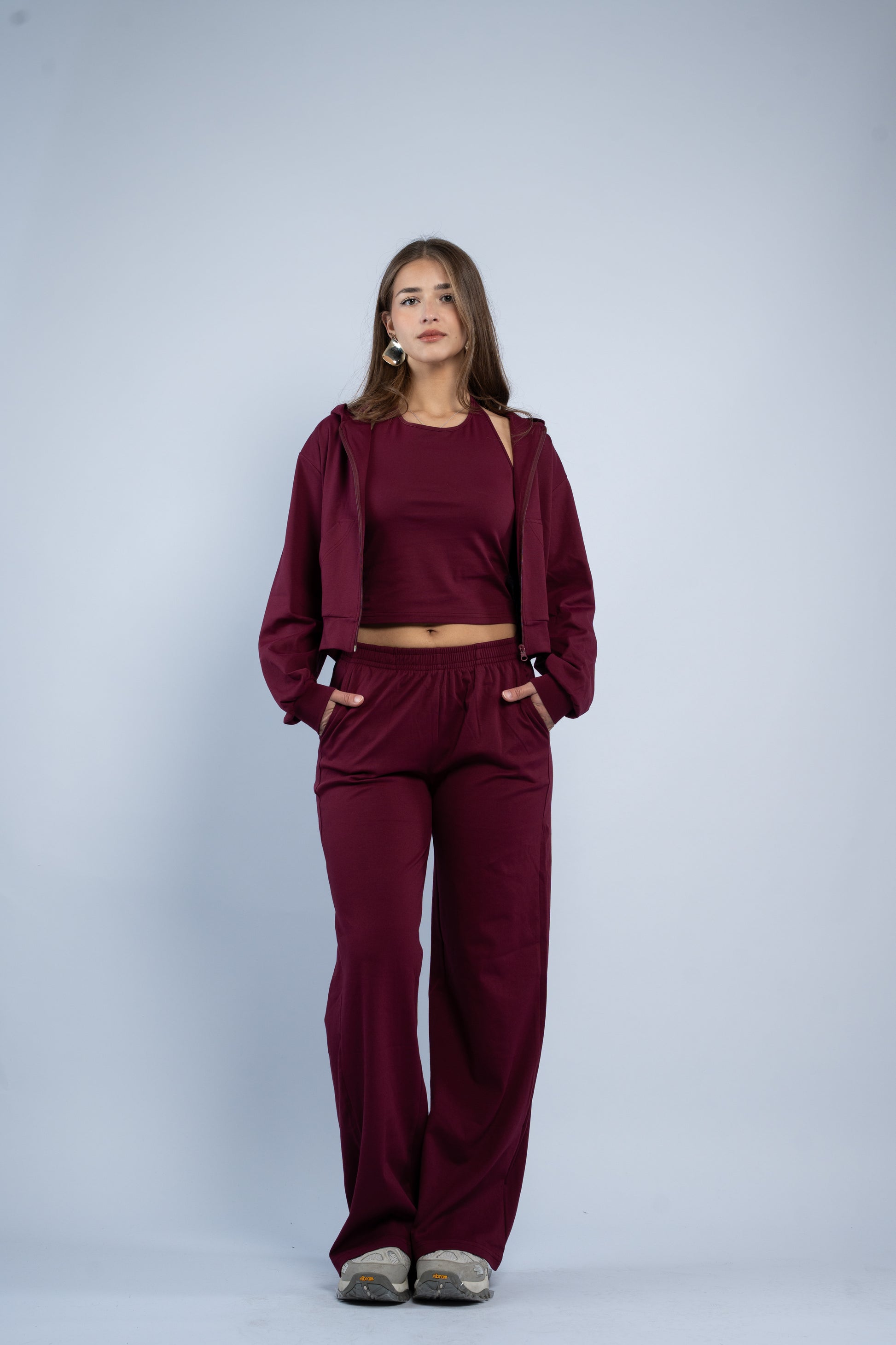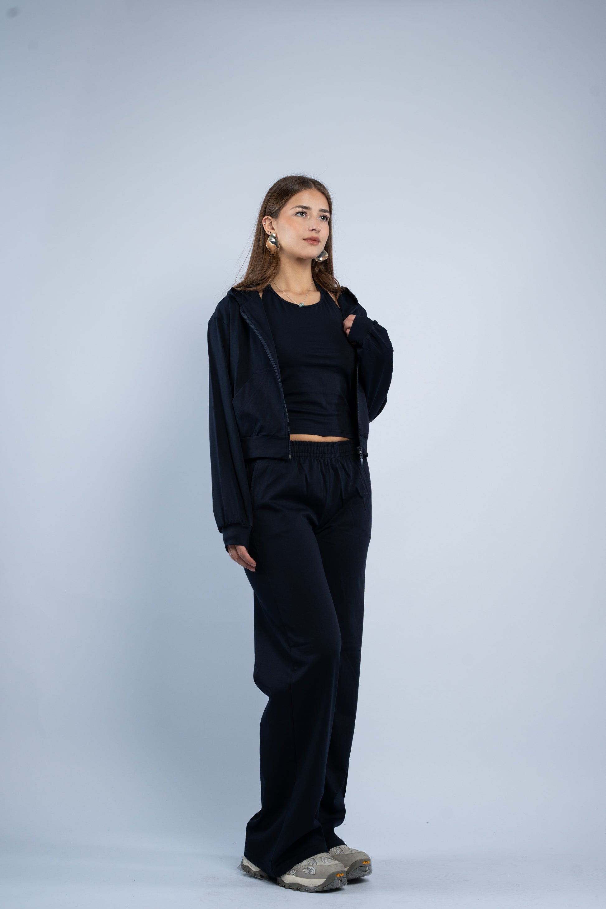 A versatile three-piece set designed for effortless styling. Featuring a sleek halter top, relaxed wide-leg trousers, and a lightweight layering jacket, all crafted in smooth modal fabric for a soft feel.