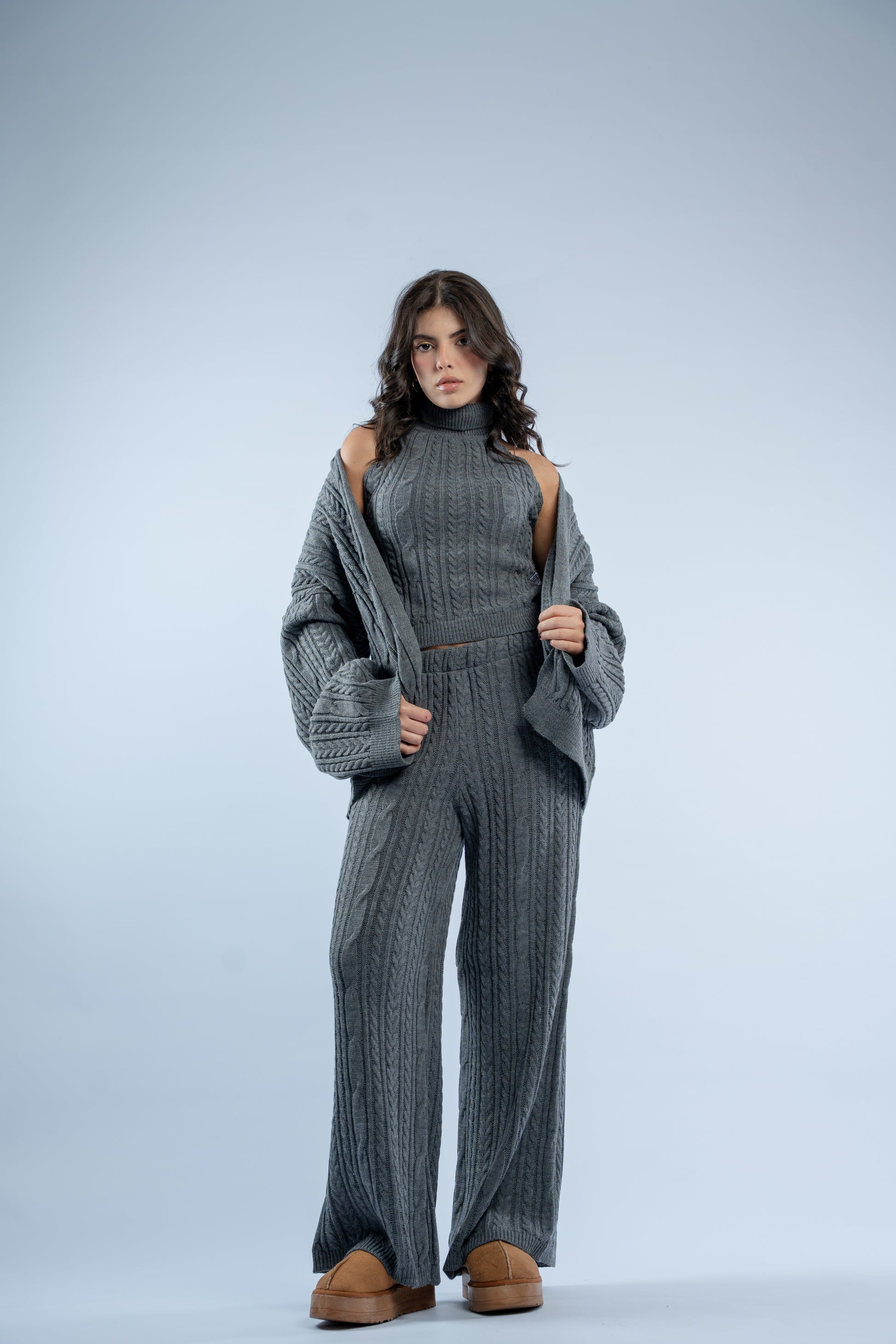Dark grey soft wool three-piece set featuring a cozy cardigan, a fitted turtleneck top, and matching pants. Comfortable, versatile, and perfect for effortless layered looks.