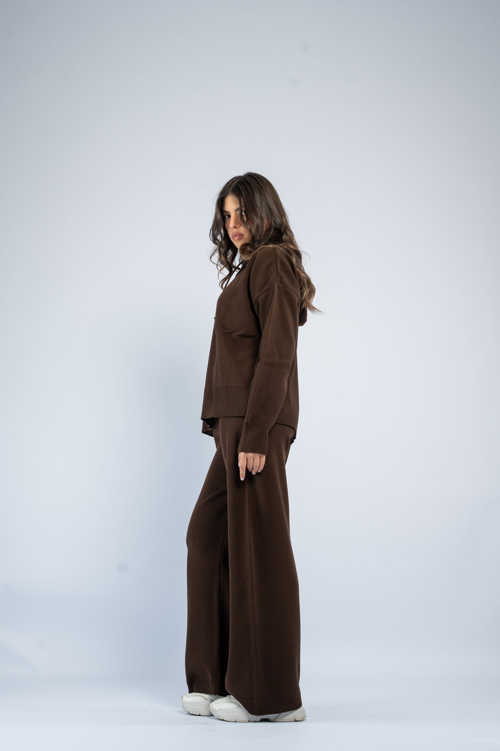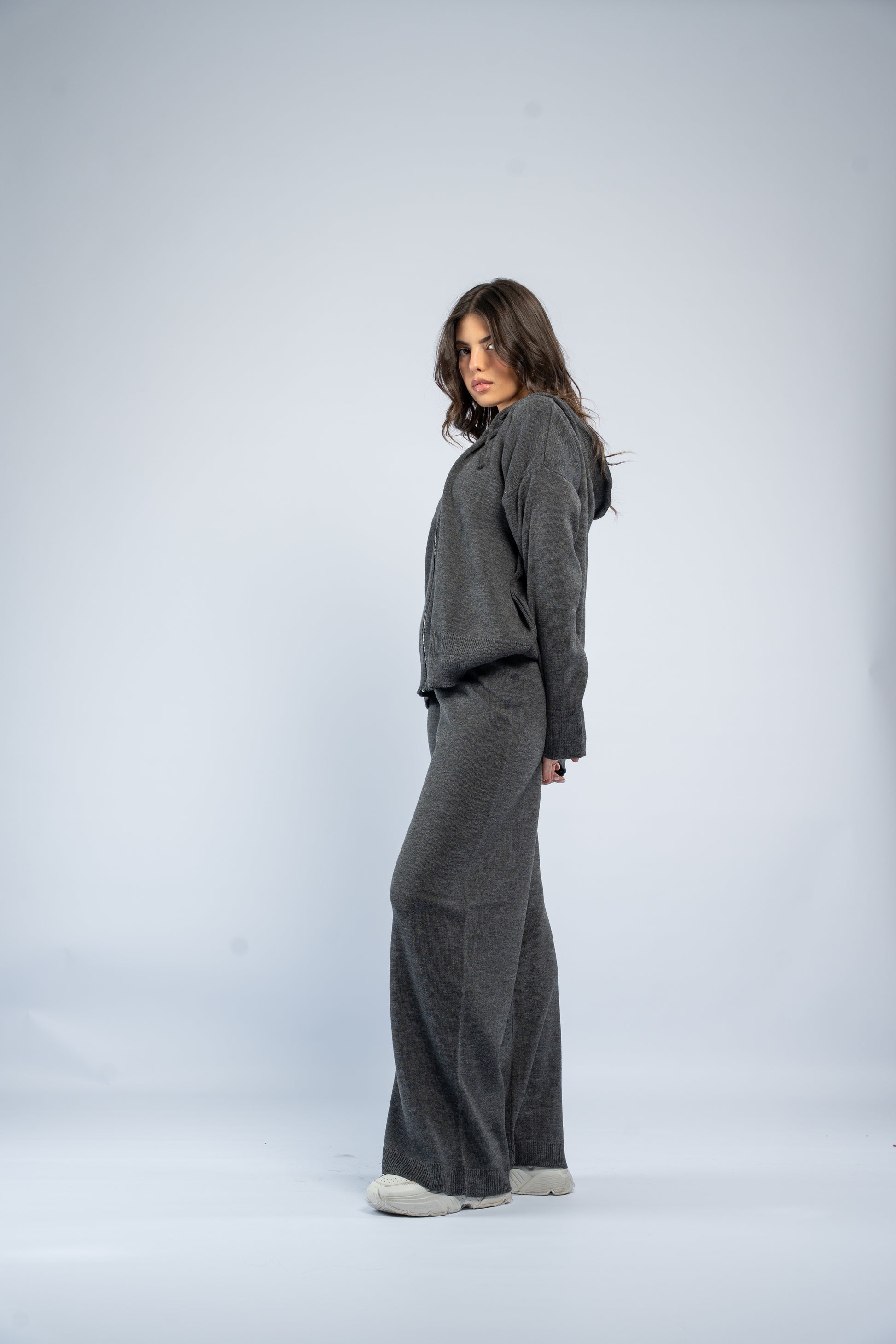 One-size knit set with a soft, stretchy feel. Features a front zipper top and matching pants. Comfortable fit that adapts from size S to L.